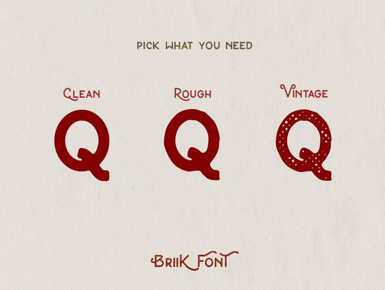 Briik不是太正式,也不是太疯狂的字体。这是标志和印刷工作的完美。它也与脚本和重的sans serif字体很好地配对。这是一个单重字体,包括3个变体:干净,粗糙和复古。