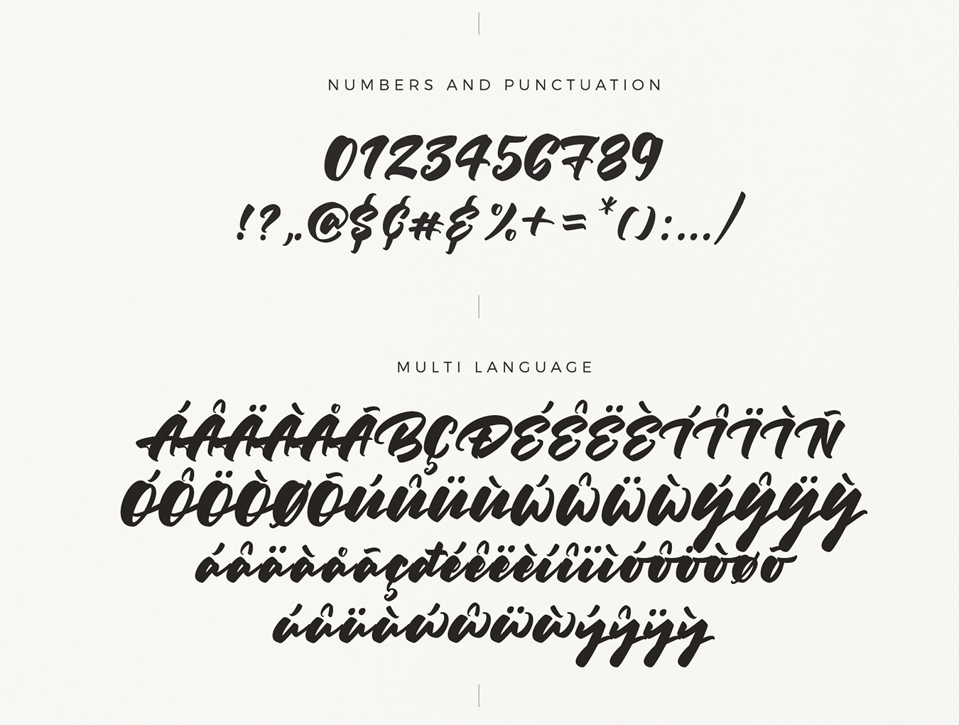 Keyline配有一整套大小写字符 - 让您可以自由地将文字转换为真正的定制手工字母。 Keyline字体包括大量字形,包括数字,标点符号和多语言支持。