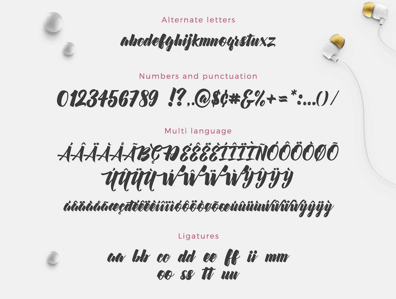 日内瓦是一种手绘字体,具有独特而优雅的笔刷风格,非常适合信笺,服装设计,标题,标识,海报,卡片等。对于拥有opentype软件的人来说:可以通过打开'Stylistic Alternates来访问替代品'和'Ligatures'按钮在Photoshop的Character面板中,或通过任何带有字形面板的软件,例如Adobe Illustrator,Photoshop,Inkscape。