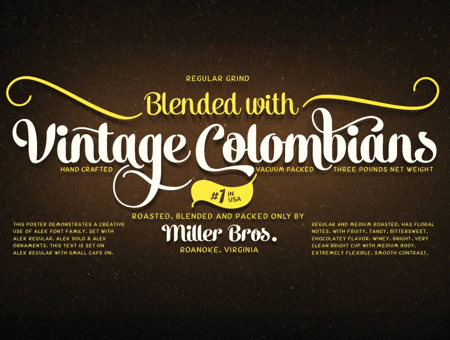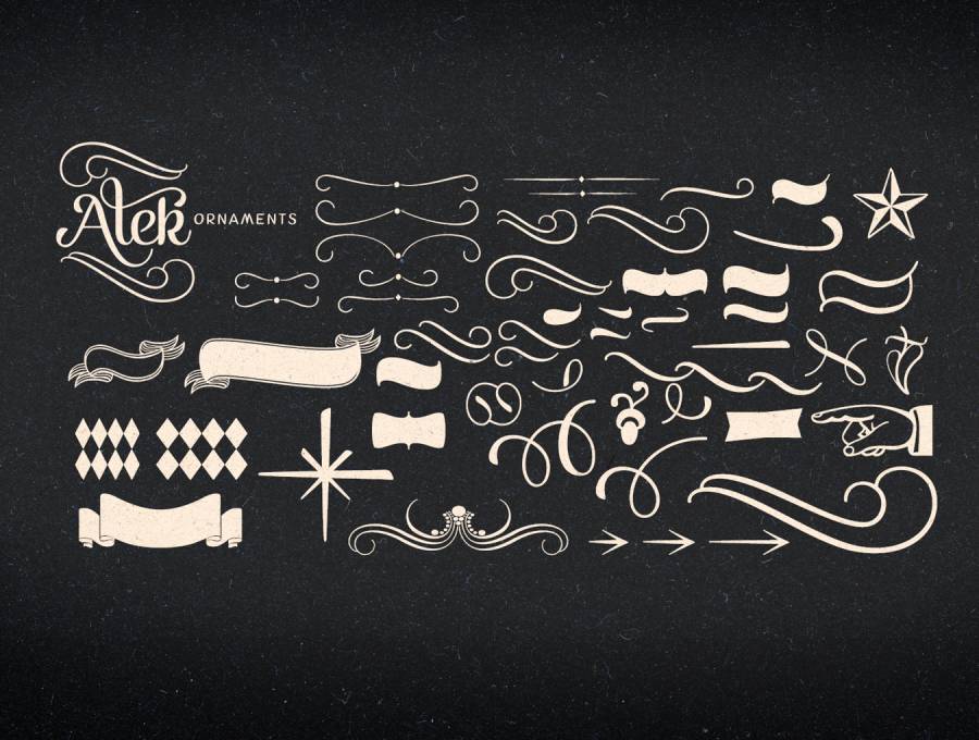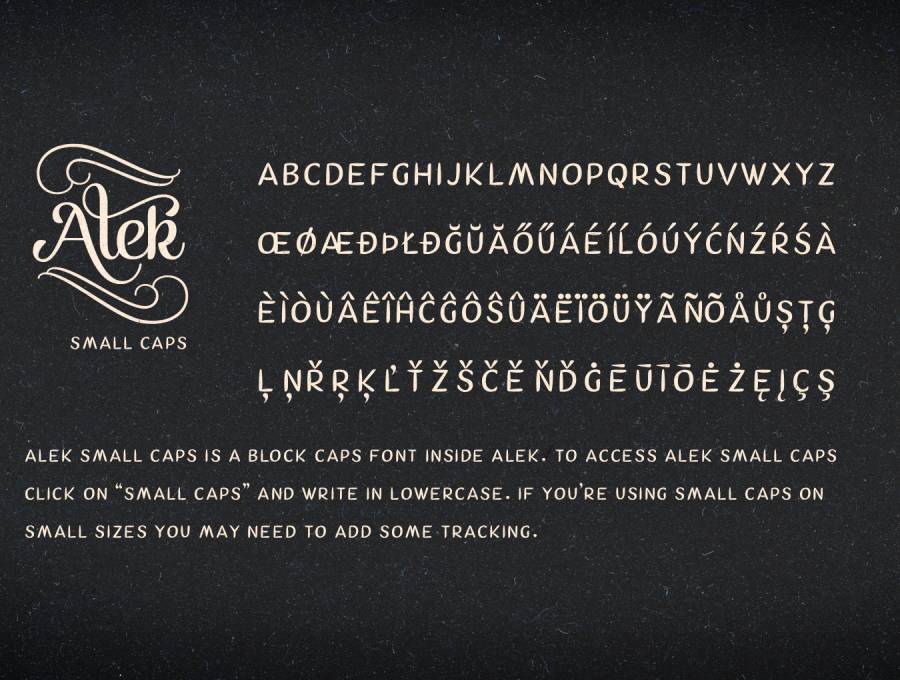 将Alek与Alek Ornaments相结合,完成您的设计。打开SmallCaps并以小写形式写入以激活一组旨在支持Alek的块字母。