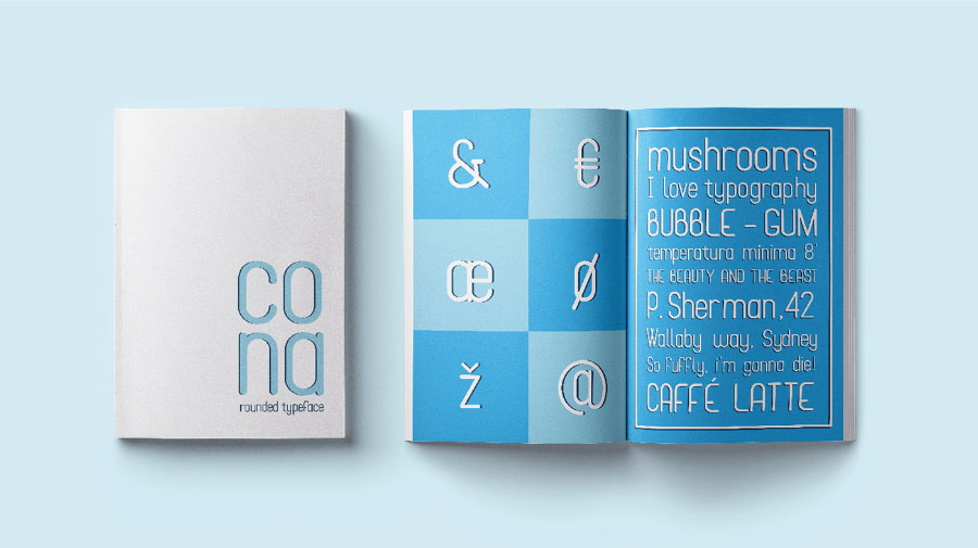Cona显示免费字体是一种常规风格的圆形无衬线字体。它的几何结构使得该类型的可读性好。此外,其圆润的饰面让印刷工更加放松和友好。这种排版非常适合标题和非密集的文字体。它以OpenType格式提供,并包含大多数欧洲语言的变音符号。