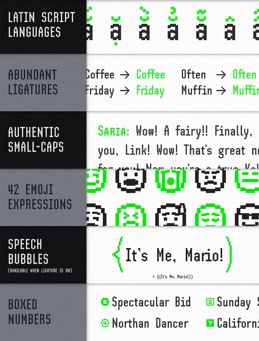 这里来Pinscher免费位图字体!就像杜宾犬一样,SH Pinscher很苗条,优雅,专注,乐趣,并且设计成同时杀死所有人。这个野兽比野外的典型的位图字体更具印刷性,它带有连字,小写字母,符号,支持的语言,甚至表情符号。好的,所以你已经抓住了SH Pinscher作弊的细节,以获得比“真实”的位图字体更好的可读性和可读性。
