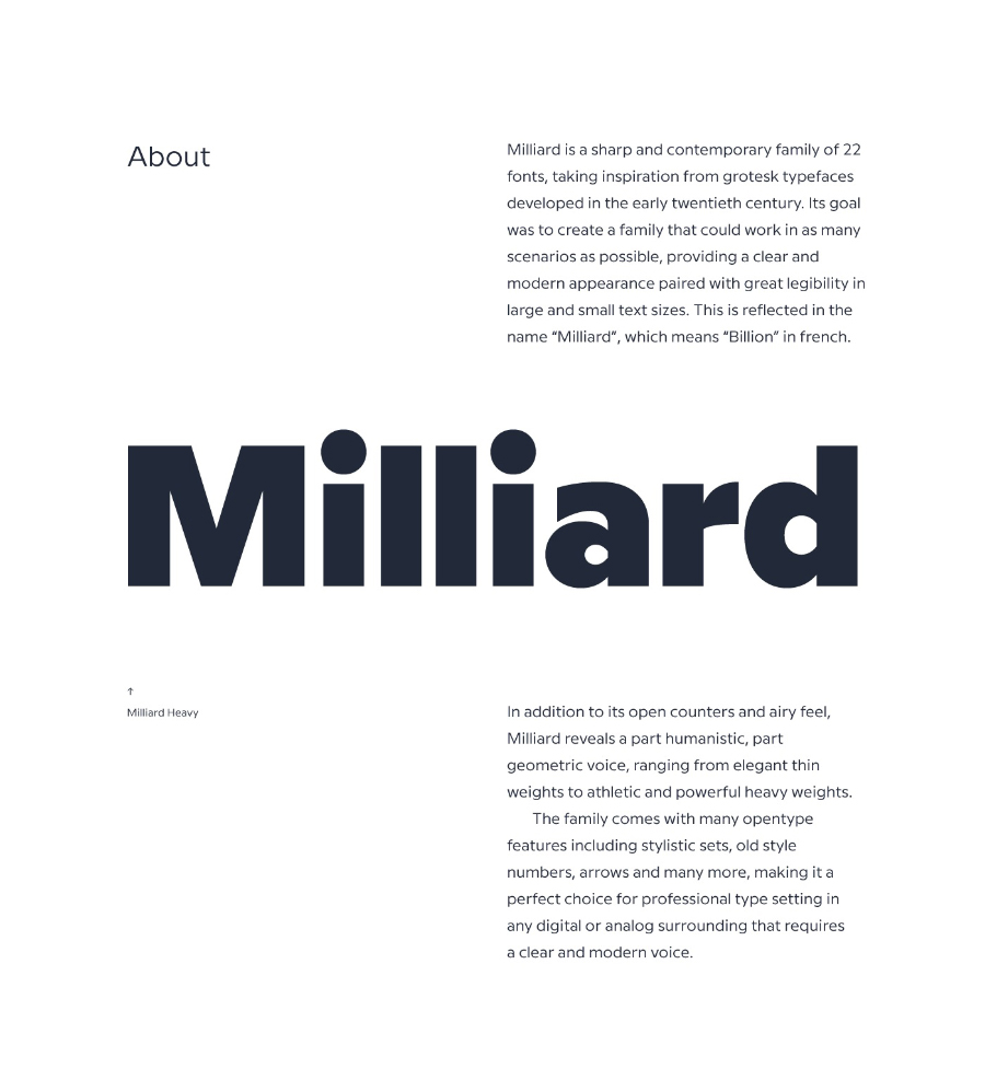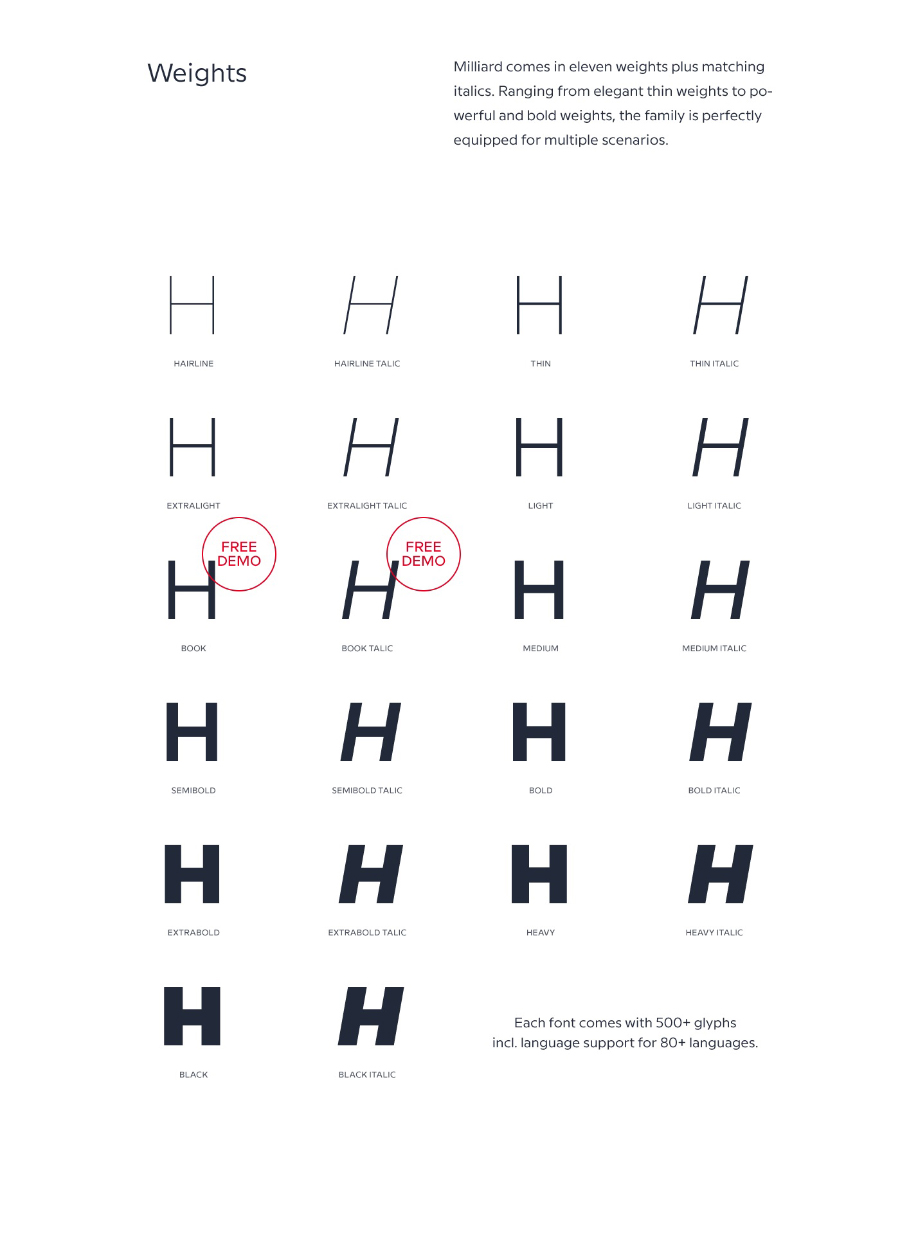 Milliard Sans Free Demo是一个免费版本的22个字体的锐利和当代家庭。它从二十世纪初开发的怪诞字体中获得灵感。其小写字母“a”,“c”或“e”的开放计数器使得文本尺寸更小,易于理解。因此,它将支持不显眼,清晰和现代的外观。当在标题设置时,Milliard显露一部分人的,部份几何声音从优雅和开放稀薄的重量到运动和强有力的重量。