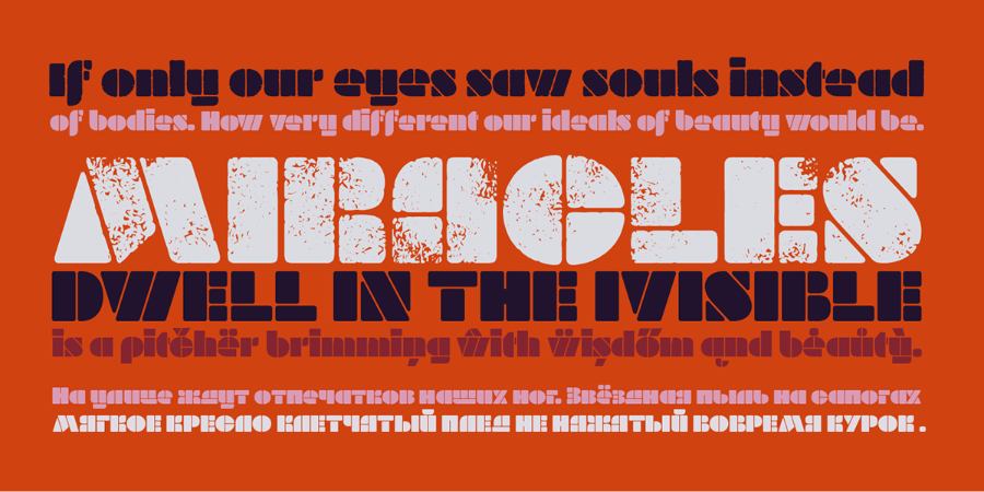 Milka字体家庭免费演示是由在近70年期间出生的设计师队创造的8样式stencil字体家庭的部分。这是一个由着名的保加利亚艺术家Milka Peikova于1979年设计的字母数字扩展。米尔卡的基本是一个干净的模板设计字体。老年,烤,脆,脆,干和软的风格是受模板和凸版技术的启发。但更重要的是,米尔卡通过增加不同程度的温暖或粗糙来扩大有用性。因此,这种字体将看起来不错,作为标识或图标。