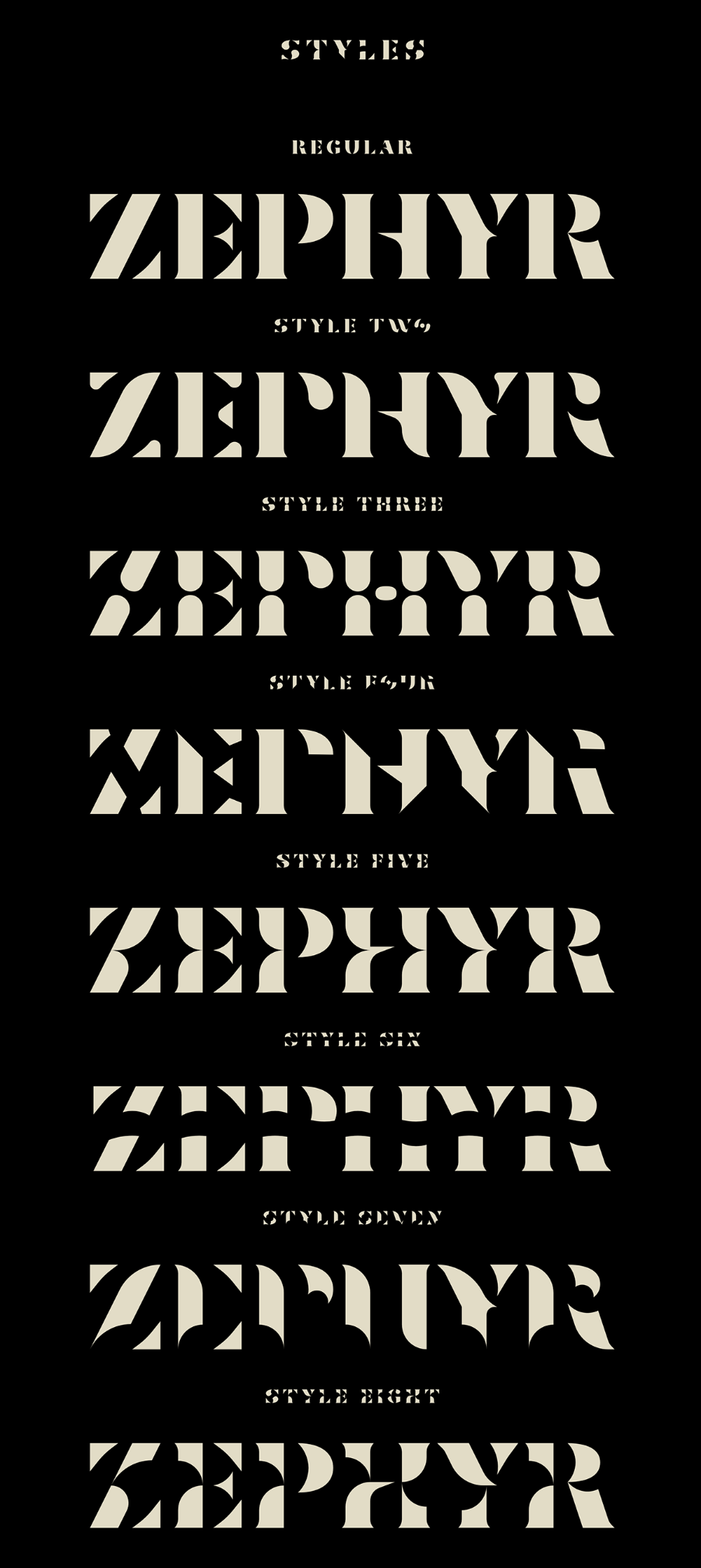 Zephyr是一个具有大量独特字符的模板 serif 字体。 Zephyr的设计是为了编辑的目的,如杂志和海报。今天的免费演示包含Zephyr常规和Zephyr两个快速时尚和时尚的触摸你的设计!