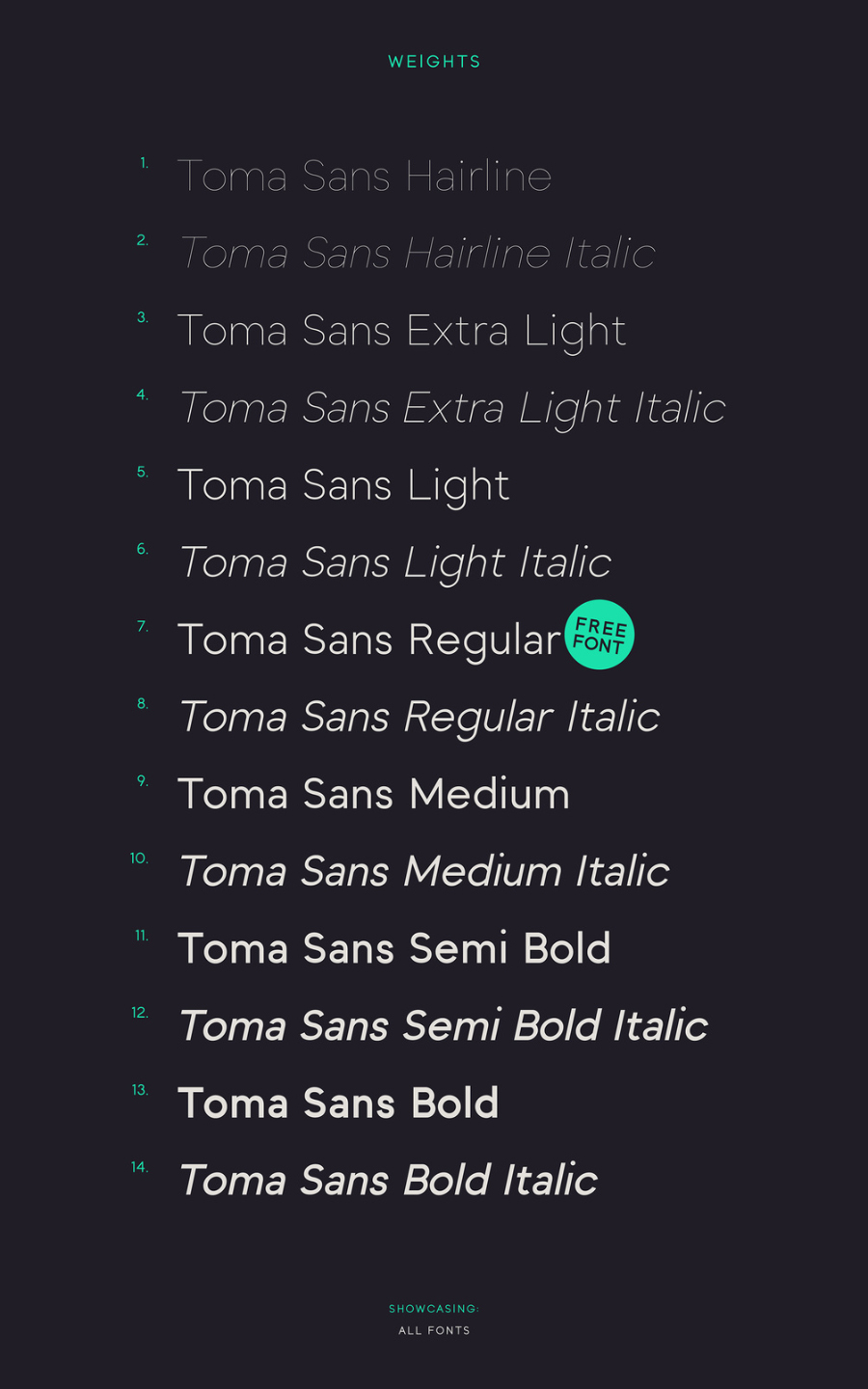 Toma Sans是一个几何字体,带有7个砝码和相同的斜体字。今天的免费赠品包含Toma Sans Regular,它可以用于很多目的。您可以随时使用Toma进行正文文字,标识,品牌等等!
