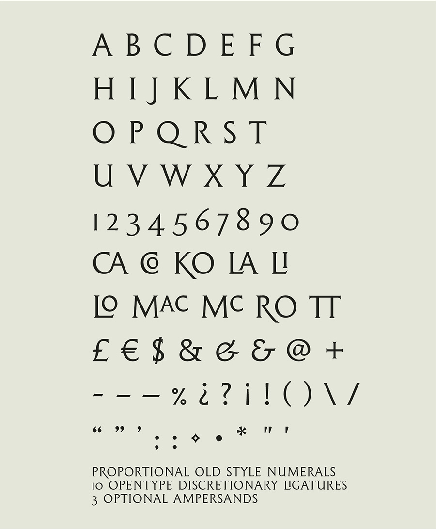 纪念碑标题是一种雕刻式的无标题字体,从埃里克·吉尔(Eric Gill)的铭文中引用,特别是在“U”字的竖向词干中。在OpenType格式中,它包含10个可用于文体和实际间距目的的自由裁剪连字,以及3个可替换&符和比例旧式数字。这种字体的第一次迭代是免费的个人和商业用途。