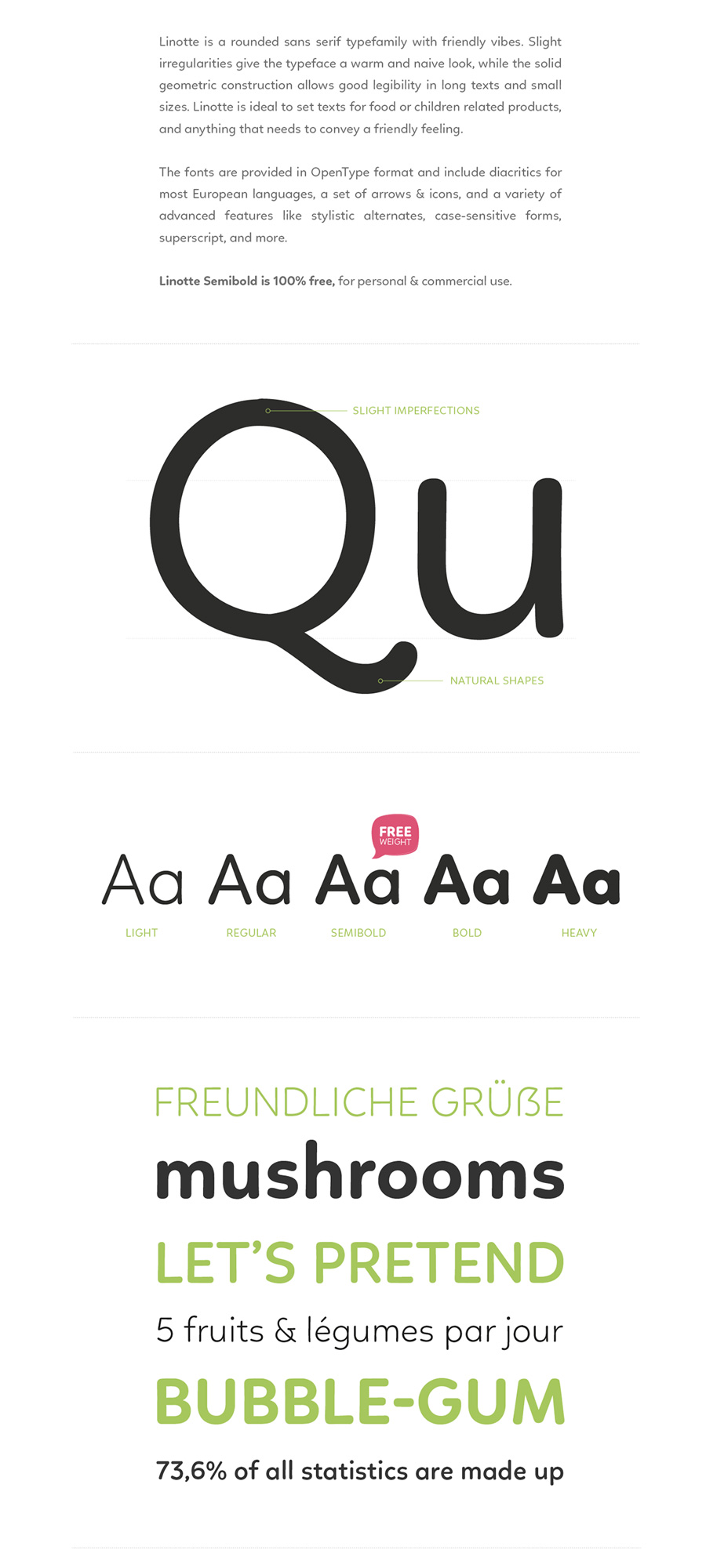 Linotte是一个充满活力的圆润的无家可归的家庭。轻微的不规则性使字体看起来温暖而幼稚,而坚固的几何结构使得长文本和小字体具有良好的易读性。 Linotte Semibold 可以免费下载。
