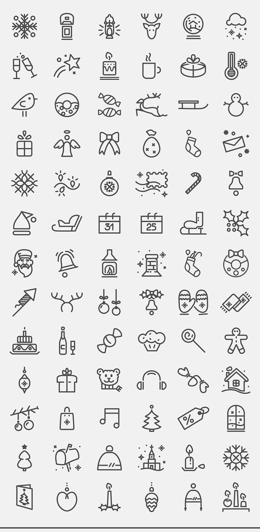这是完全可伸缩的笔画图标,笔画重量3.5磅。有用的移动应用程序,用户界面和网络。这包包括:铃铛,雪花,新年树,香槟,礼物,雪人,糖果,鸟,冬季活动,鹿,星星,蜡烛,日历,帽子,玩具,圣诞老人,糖果和其他东西。