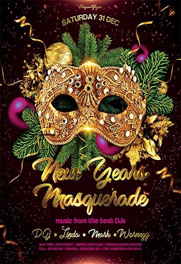 新年假面舞会 - 传单PSD模板+ Facebook封面