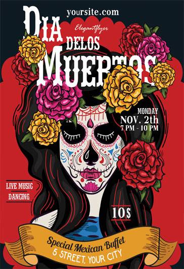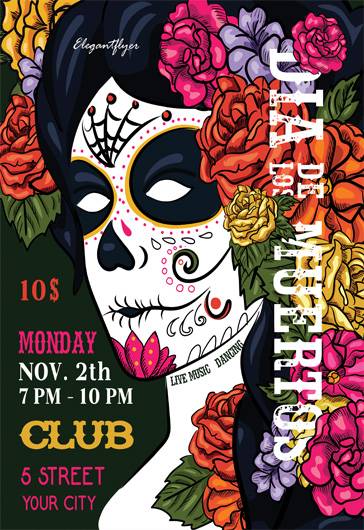 Dia德洛斯Muertos派对 - 传单PSD模板+ Facebook封面