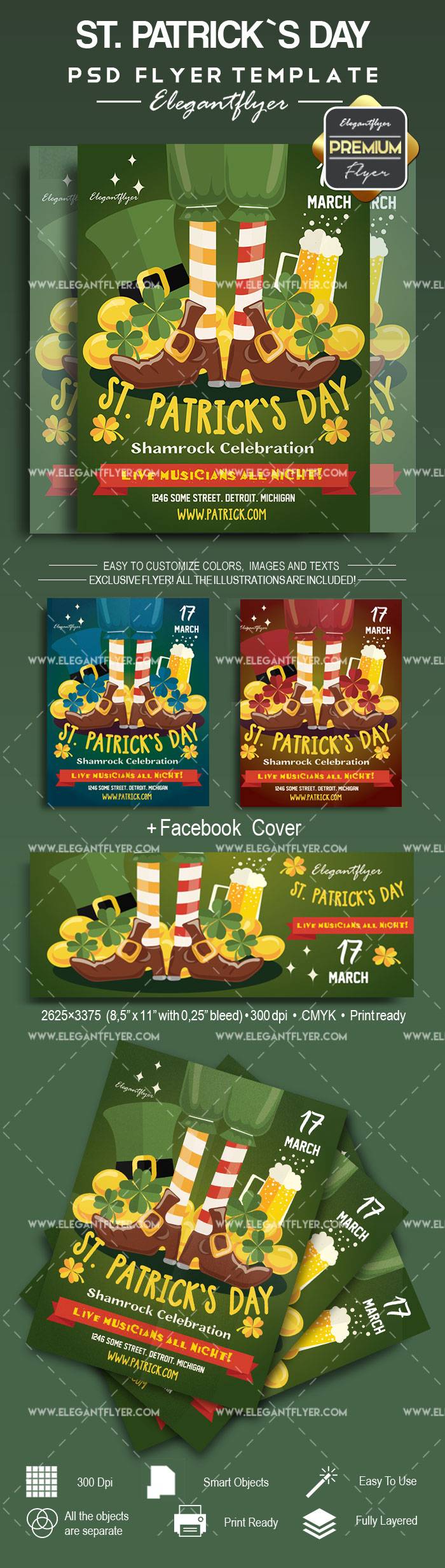 圣帕特里克的一天传单PSD模板+ Facebook的封面