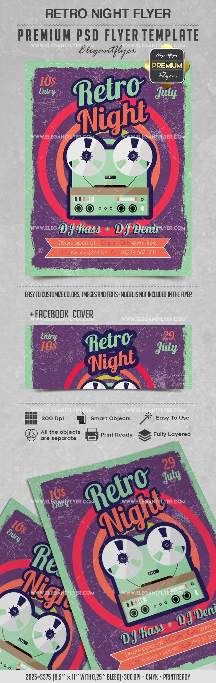 复古之夜 - 传单PSD模板+ Facebook封面