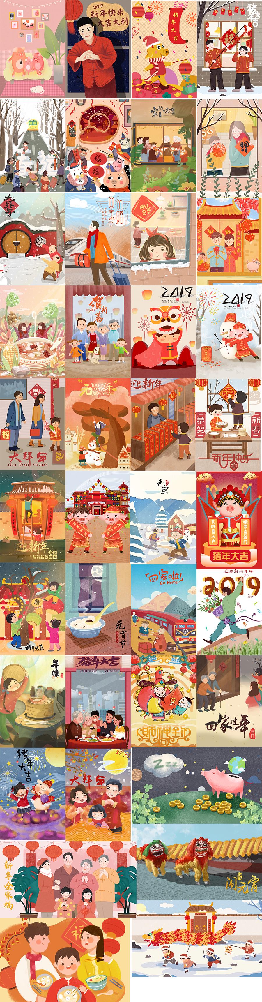 76款2019新年喜庆元旦手绘猪年插画新春快乐元宵节海报PSD设计ui素材