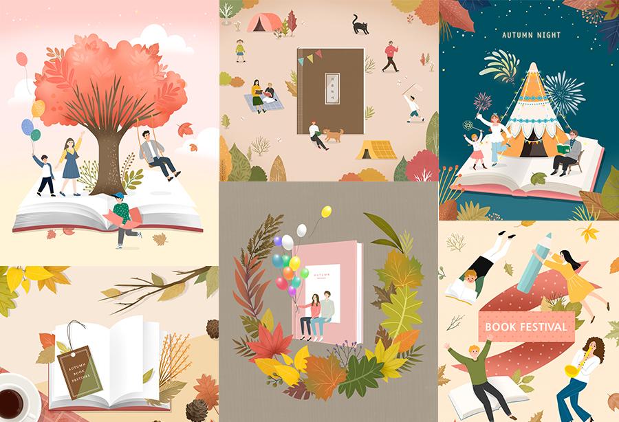 6款秋游秋天野外郊游插图书籍阅读手绘风景卡通PSD设计插画素材