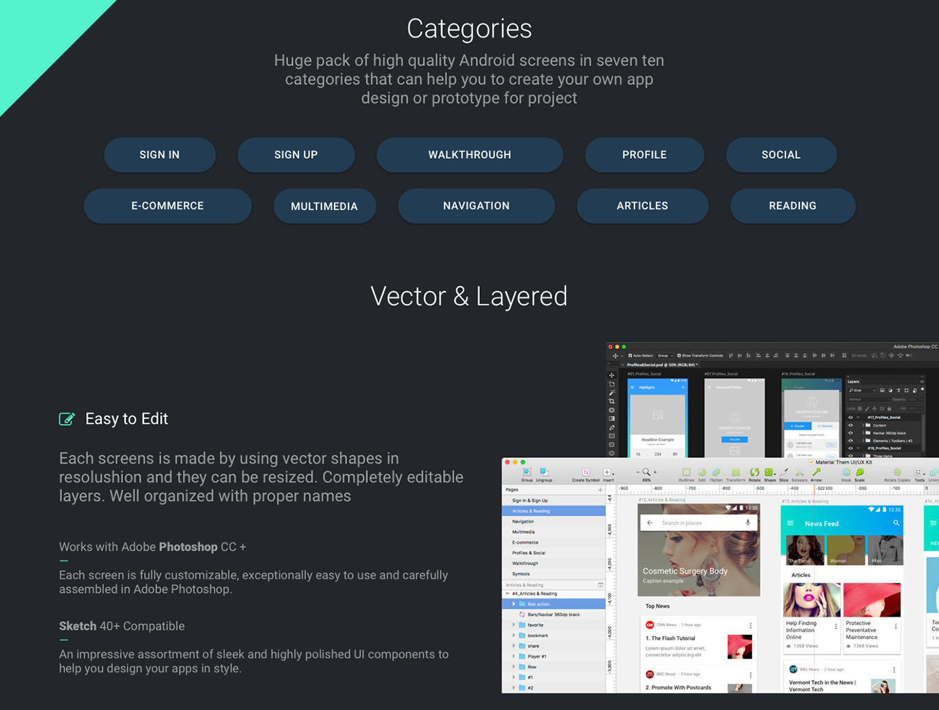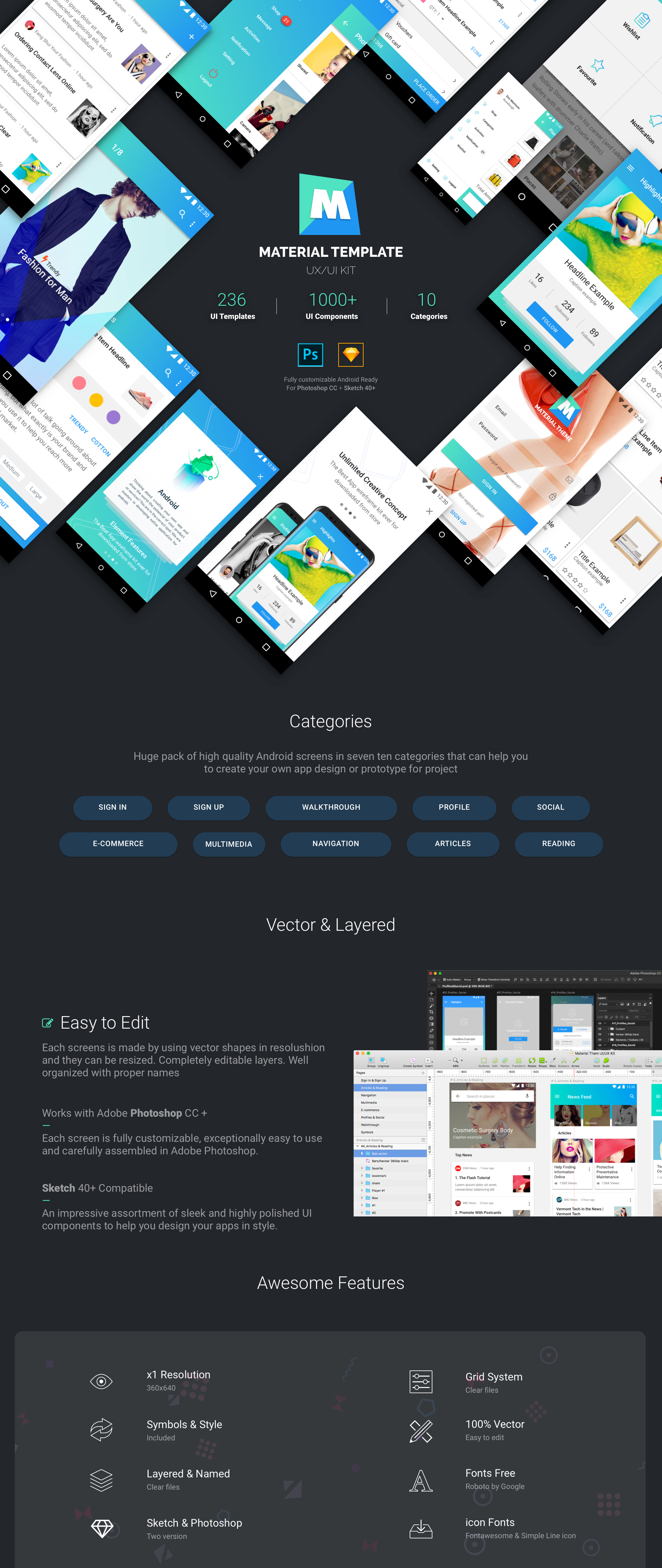 材料模板UX / UI工具包是一个专业的工具包,用于轻松构建原型和移动应用程序设计。多用途时尚,社交和电子商务等由超过100多个即用型屏幕组成,可帮助您在设计下一个应用程序或移动网站时节省时间和精力。所有的屏幕和元素都是完全可定制的,组织良好,并进入素描应用程序。