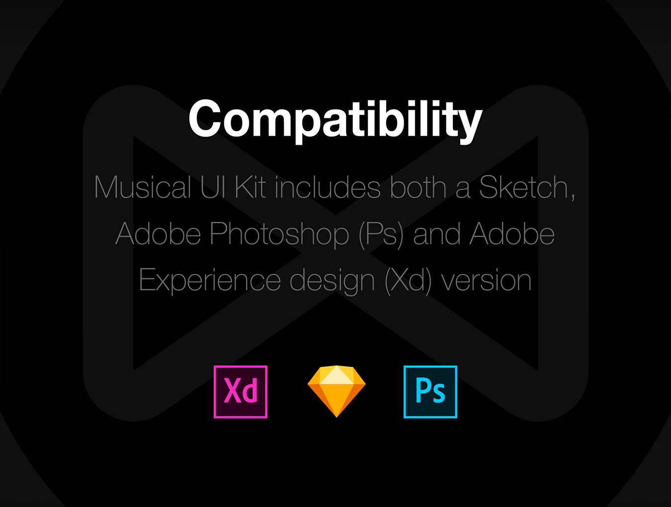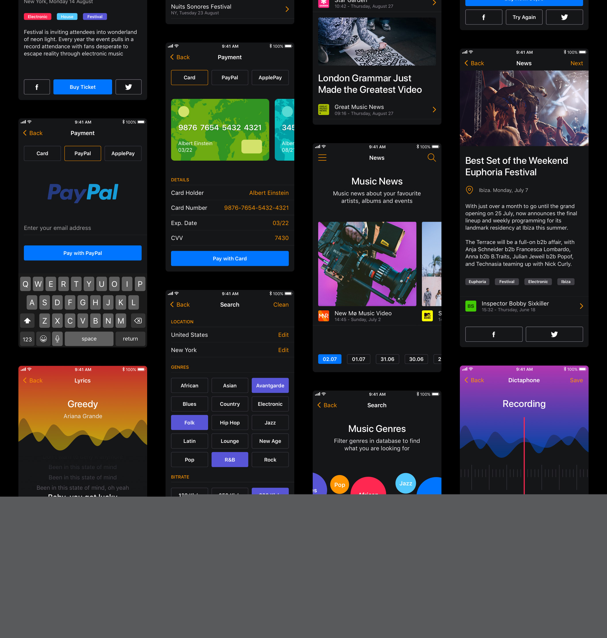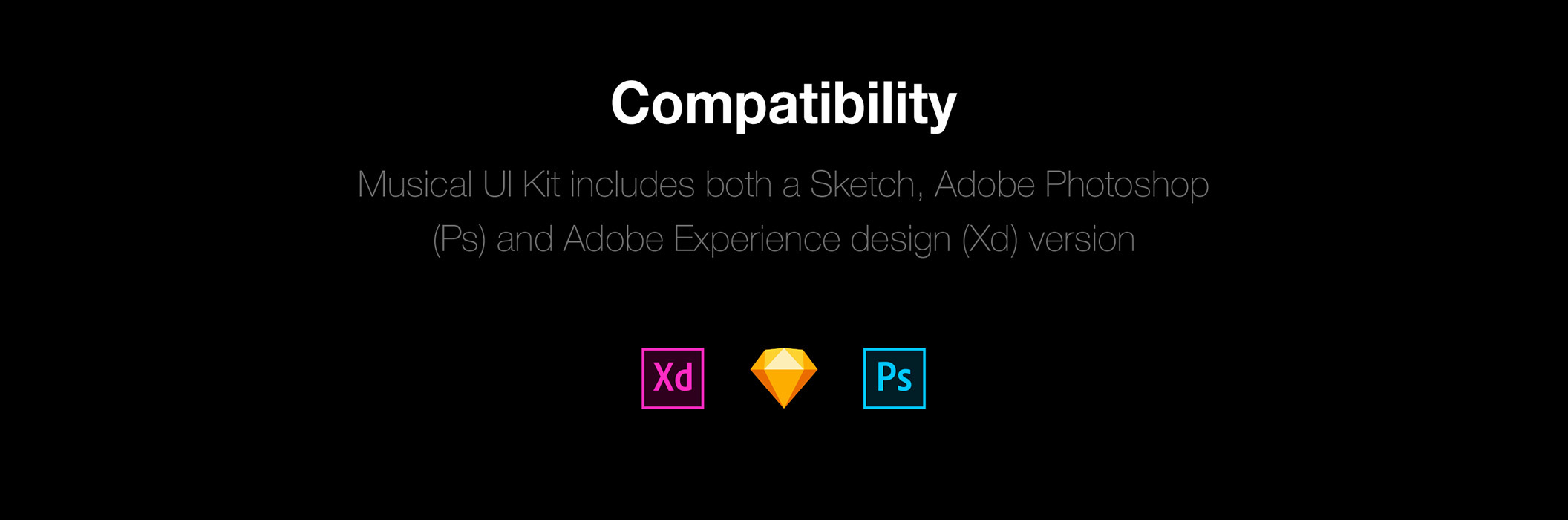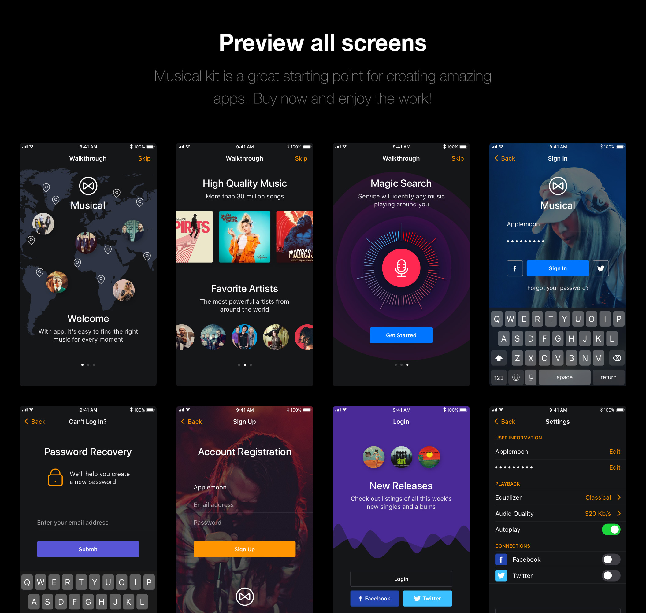 30多个屏幕,用于在Sketch,XD和Photoshop中创建音乐应用程序。,Musical Mobile UI Kit