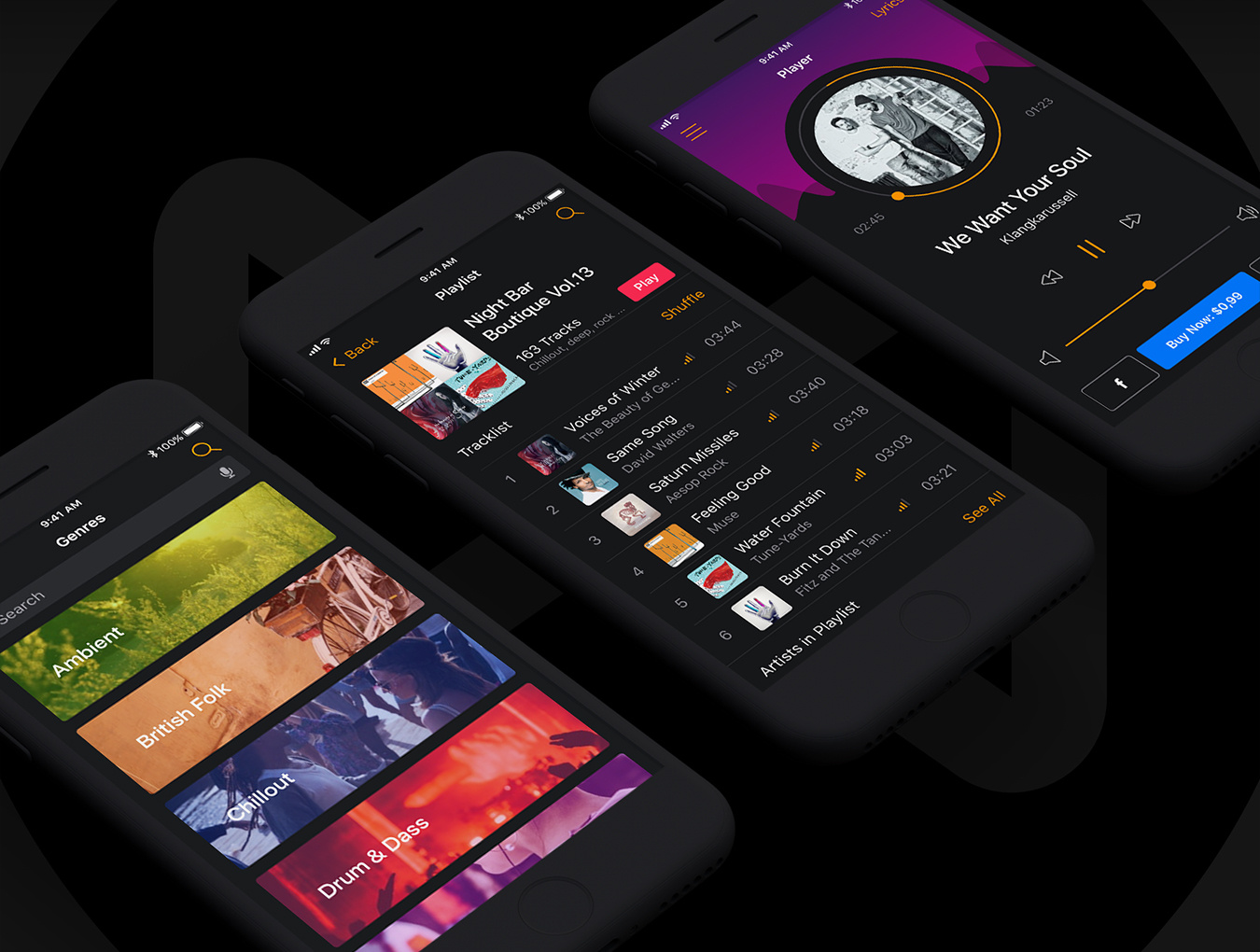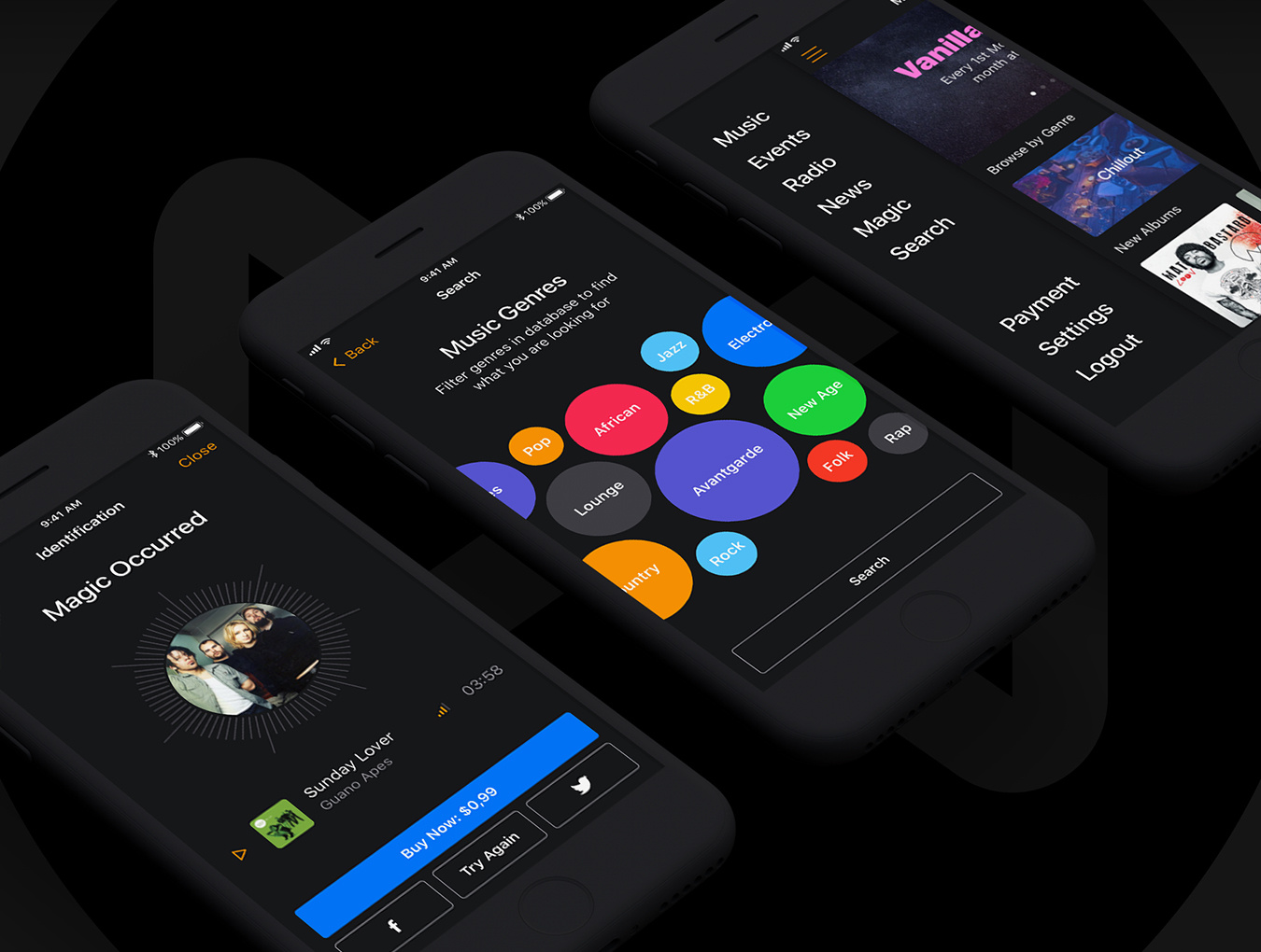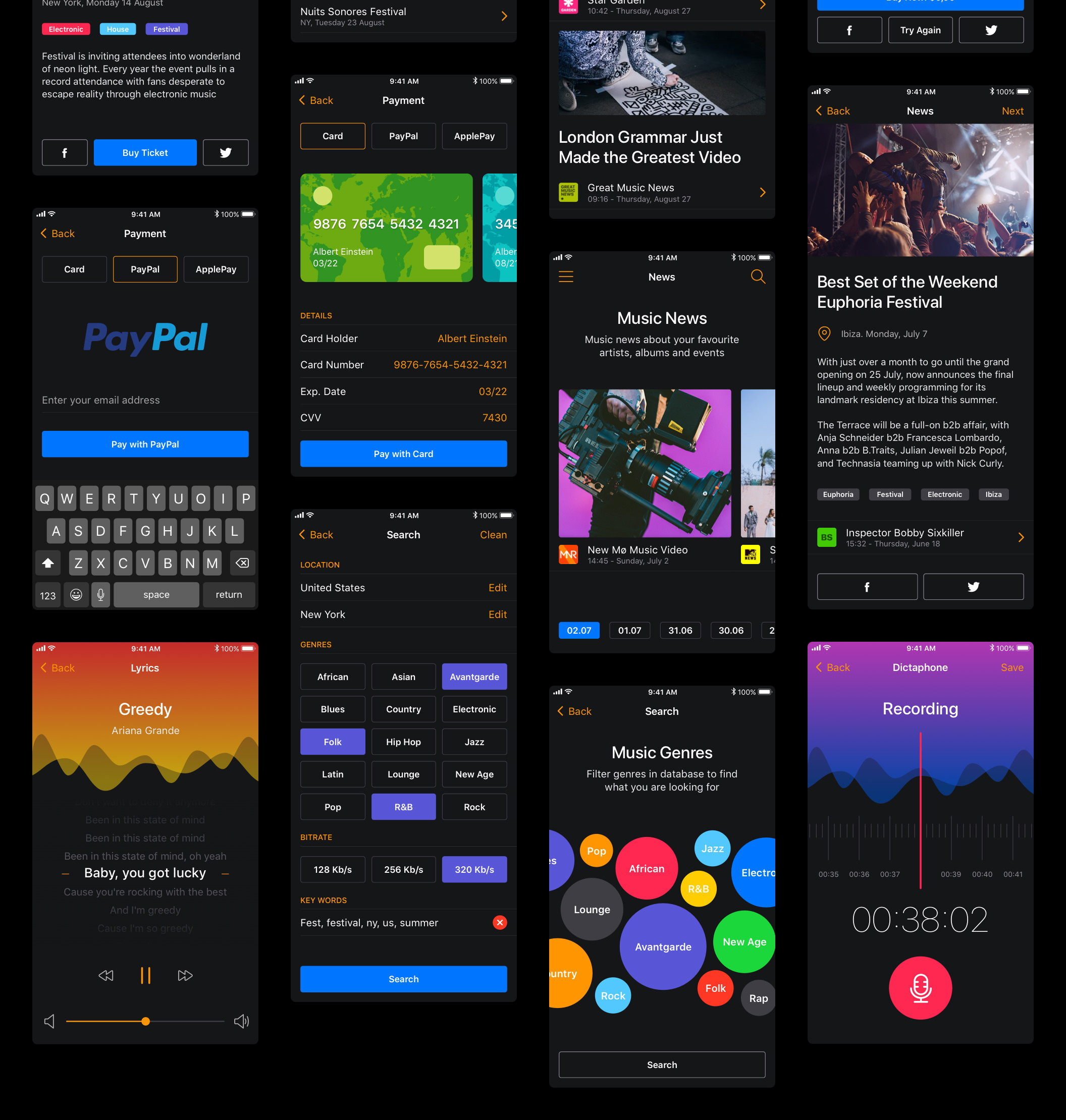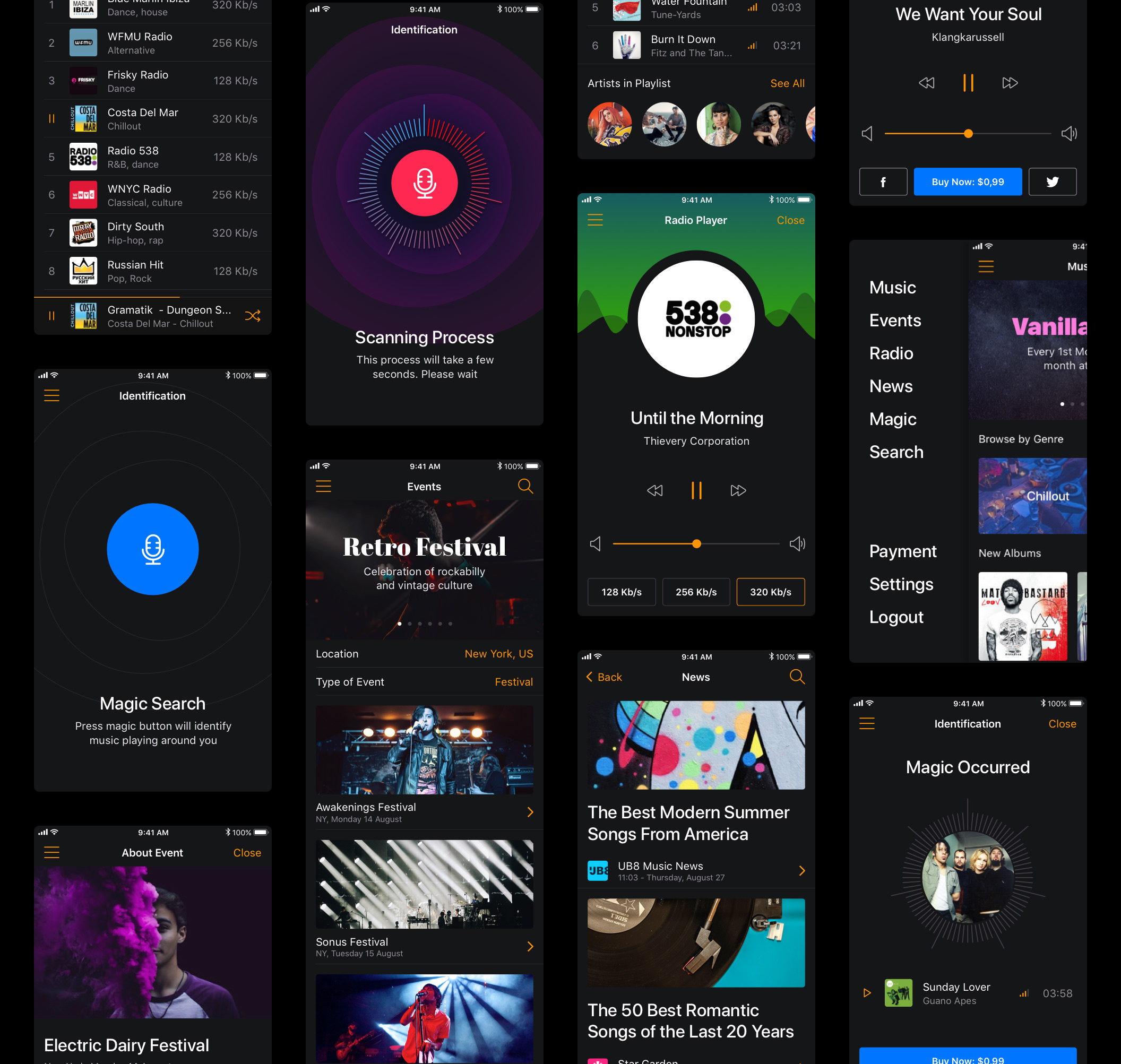 30多个屏幕,用于在Sketch,XD和Photoshop中创建音乐应用程序。,Musical Mobile UI Kit