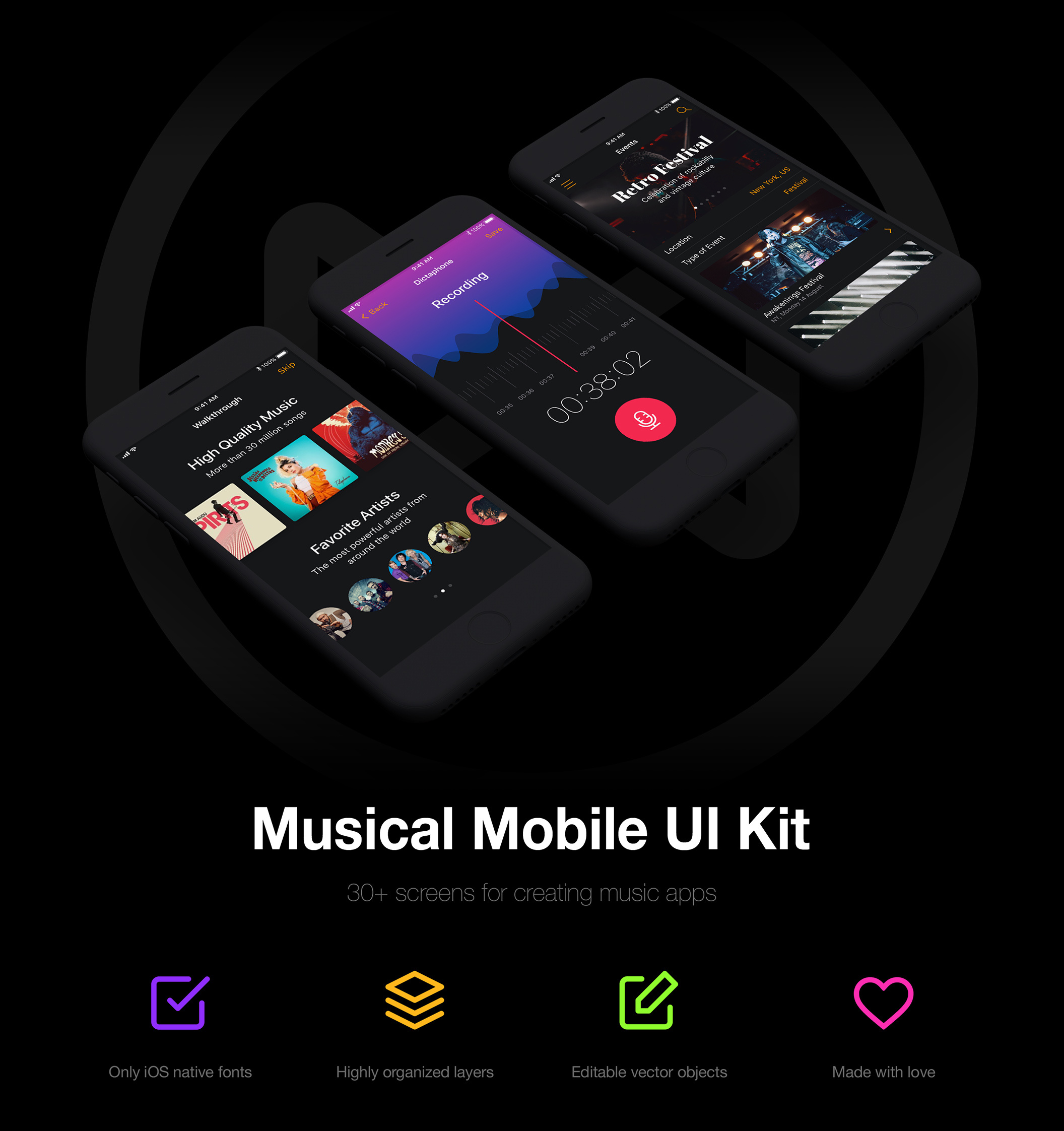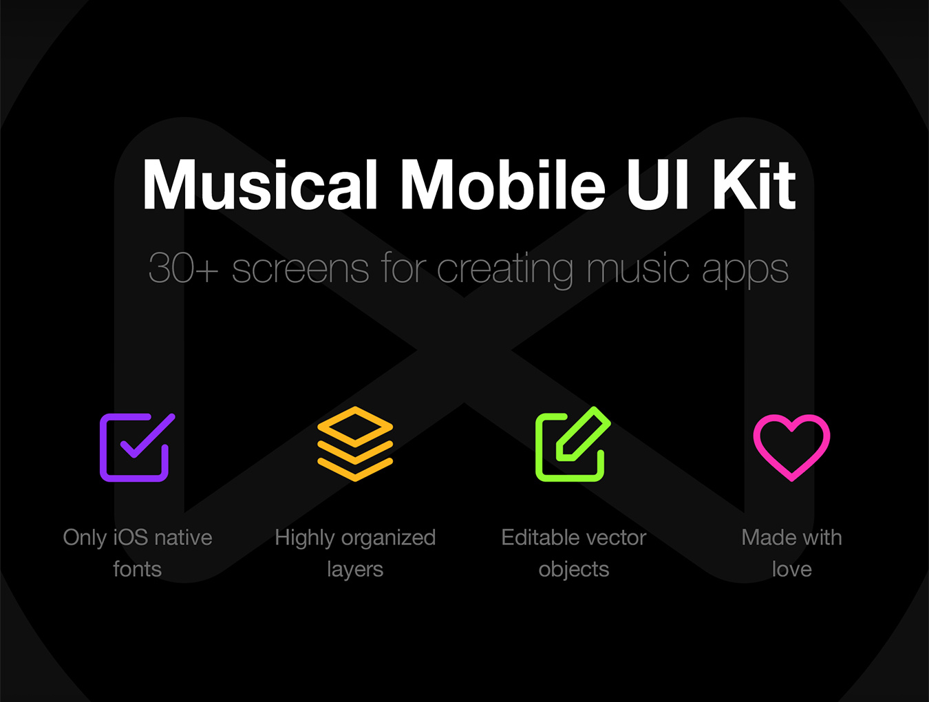 希望为iPhone创建音乐应用程序,但感觉原型设计存在困难吗?我们很高兴为您呈现我们的新产品 - 音乐移动UI套件。他会帮助你的!你找不到比这个更好的入门套件。该套装包括更多30个高质量的屏幕。高度组织的图层。仅限iOS原生字体。此外,Musical UI Kit还包括Sketch,Adobe Photoshop(Ps)和Adobe Experience设计(Xd)版本。立即购买,享受工作!