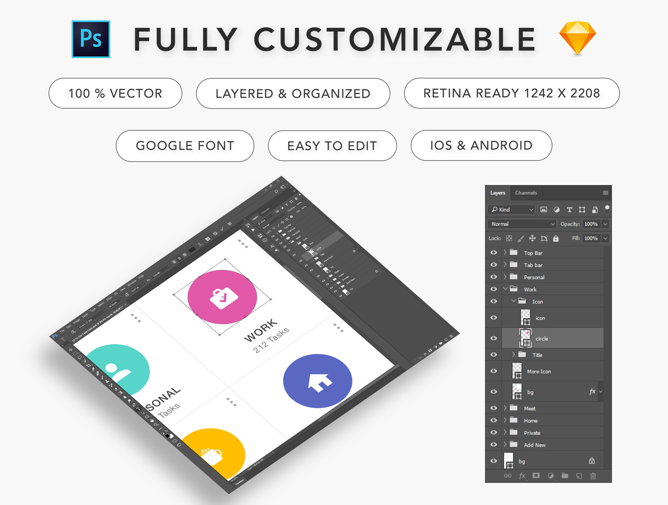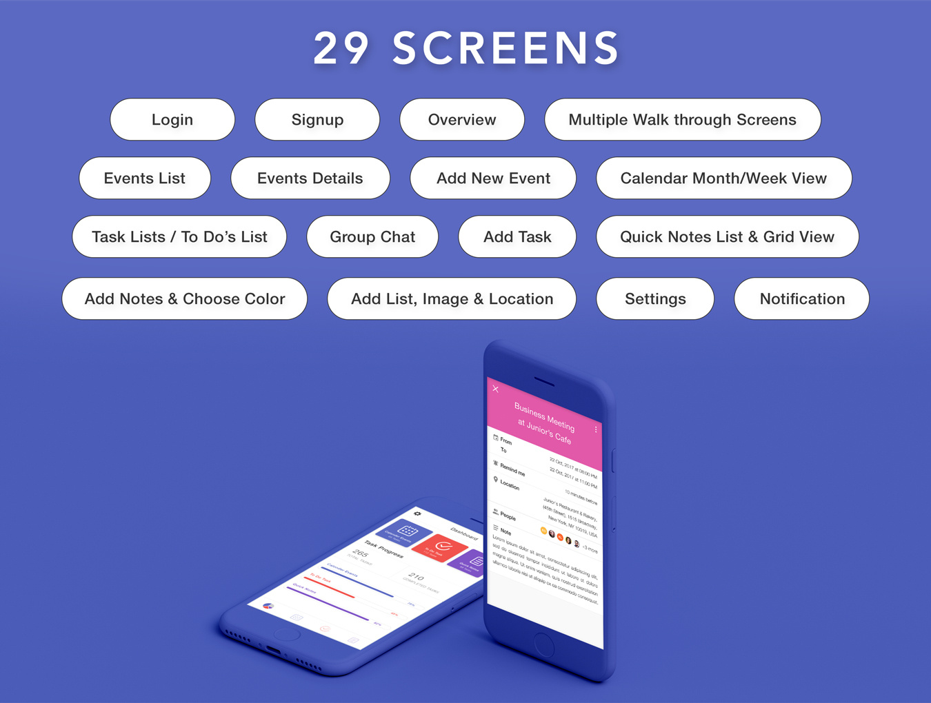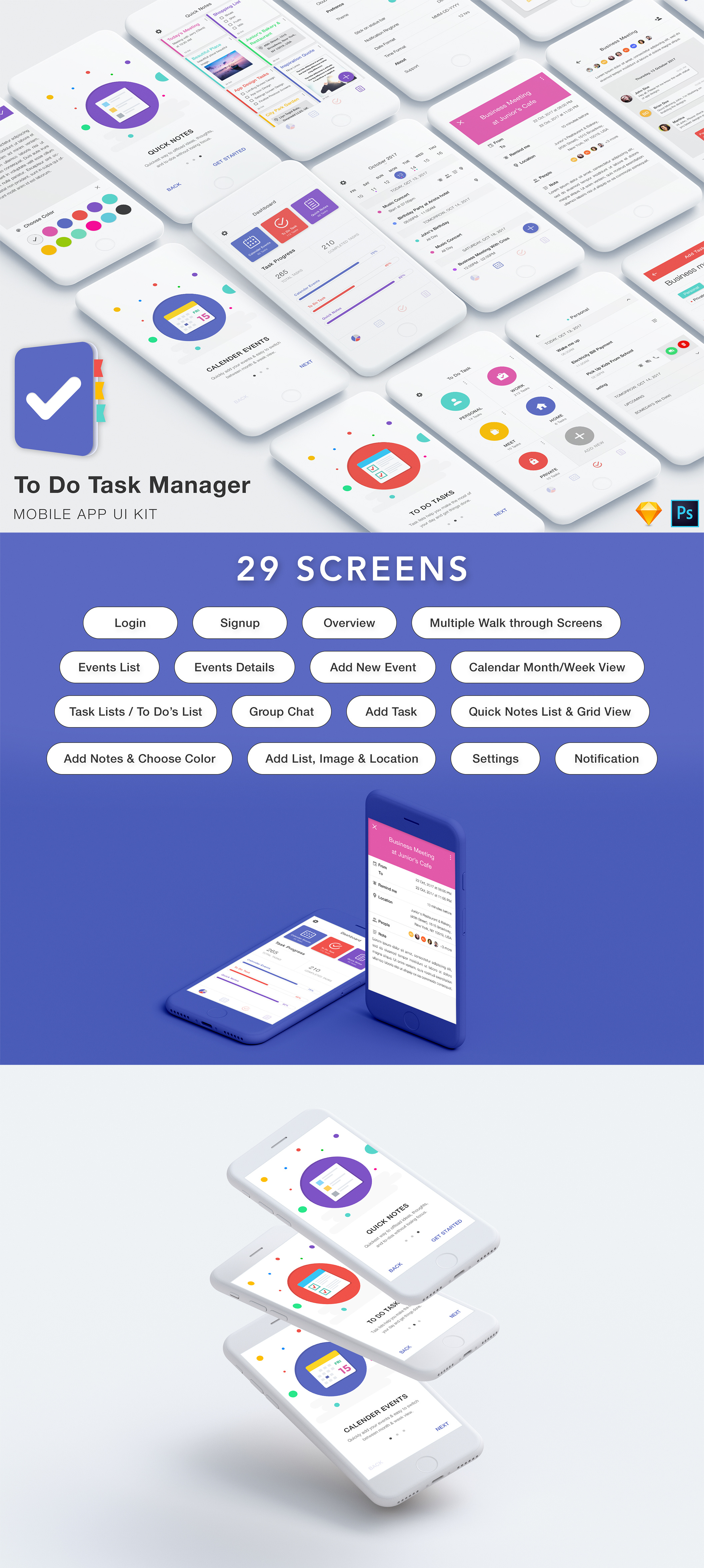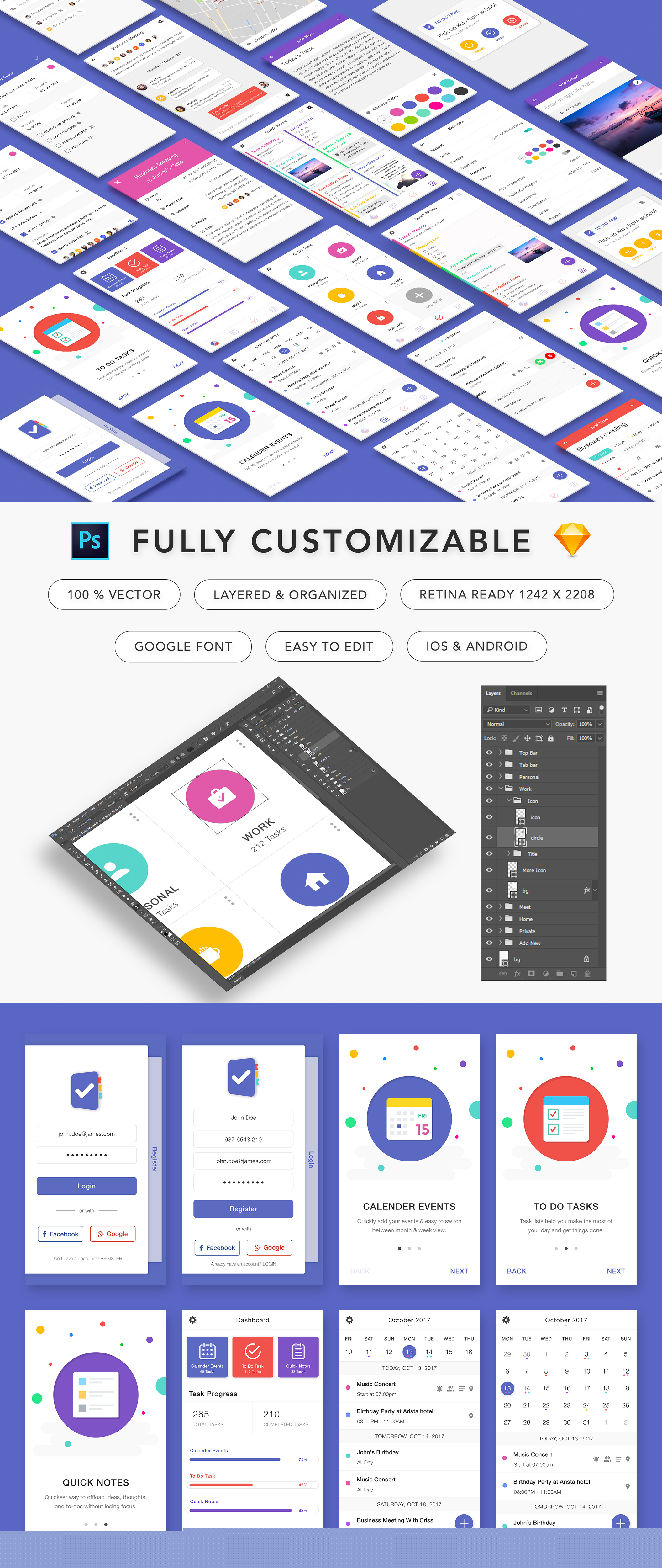 这是一个完美的干净任务管理器UI工具包。它配有美观的待办事项列表界面,具有漂亮的细节和纹理。它涵盖了所有常见的任务应用程序可能的工作流方案,从头开始自己的移动待办任务应用程序。 此UI工具包包含29个高质量的屏幕应用程序模板(PSD文件)。如果您需要修改主题,您可以轻松更改颜色并更改单个元素。仅使用矢量形状和图层样式。您可以将相同的文件用于iPhone和Android应用程序设计。