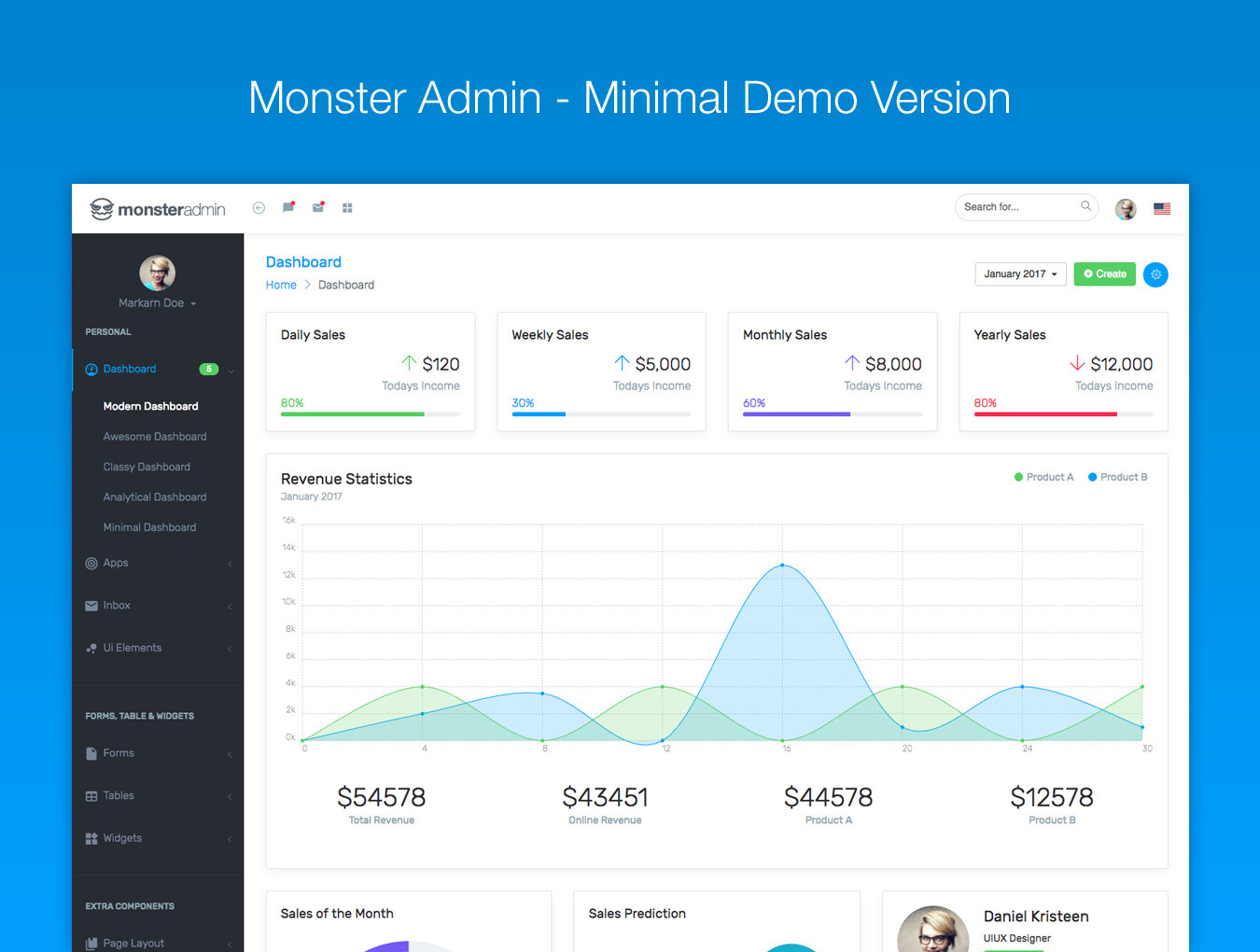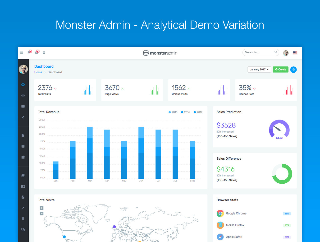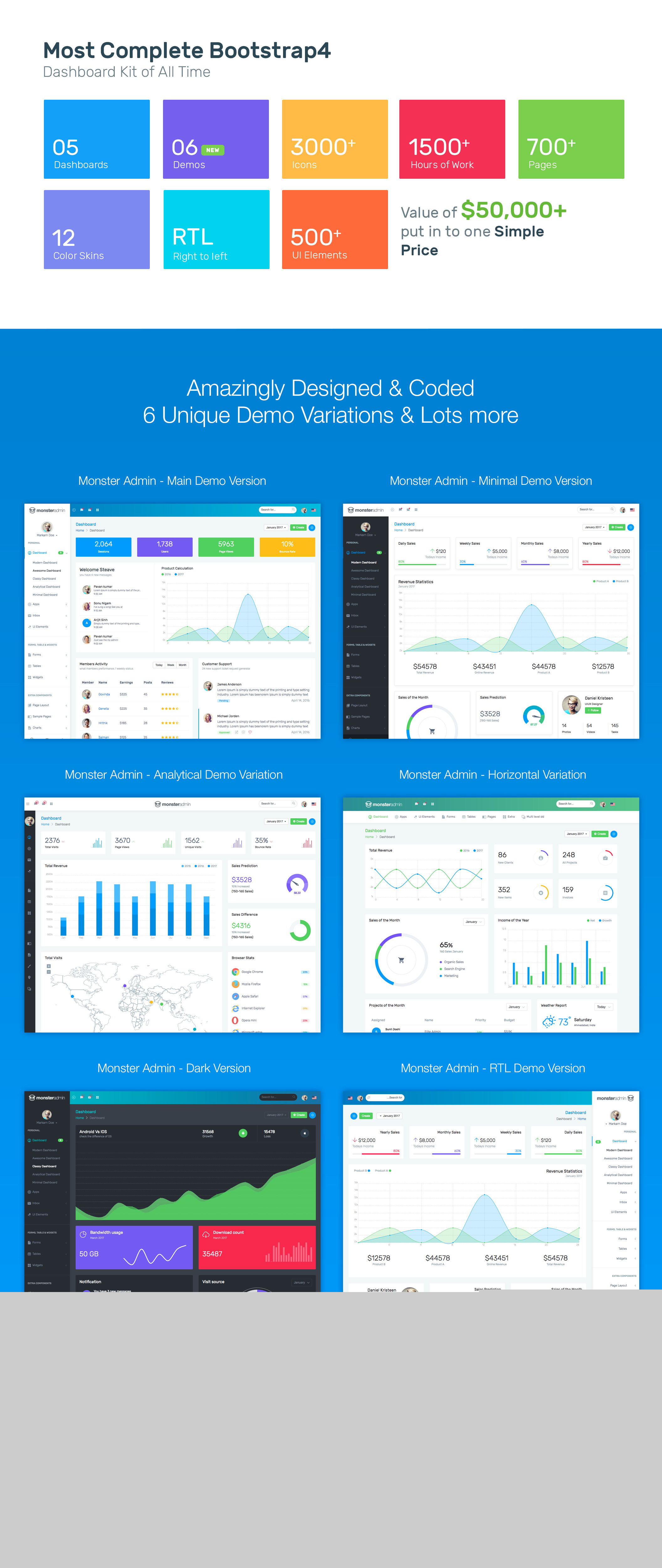 Monster Admin包含6个独特的演示变体,每个演示包括5个仪表板变体,6个预定义的颜色变体,700多个页面模板,3000多个字体图标,500多个UI元素,100多个集成插件,明暗变化,RTL就绪和更多。