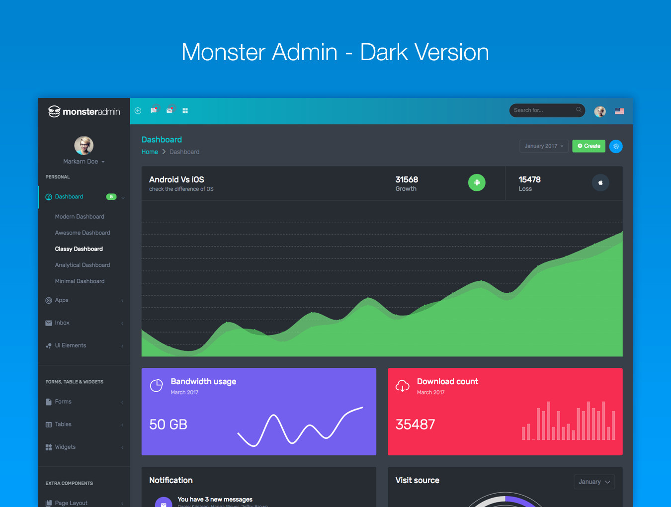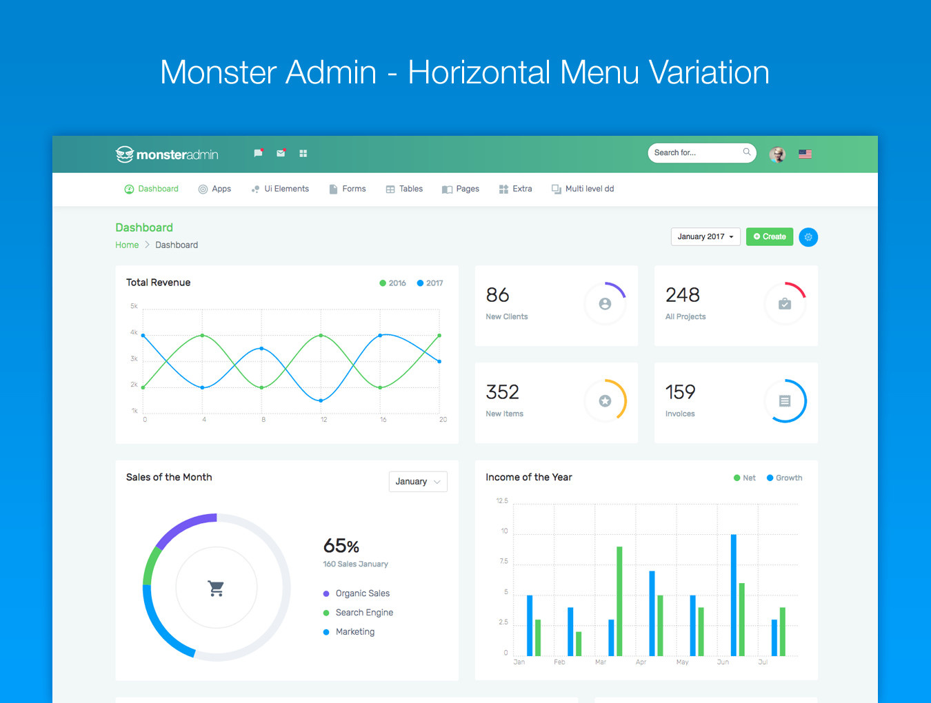 Monster Admin是用于管理仪表板和控制管理面板的流行开源WebApp模板。 Monster Admin是完全响应的HTML模板,基于CSS框架Bootstrap 4.它利用其设计中的所有Bootstrap组件,并重新设计许多常用插件来创建一致的设计,可用作后端应用程序的用户界面。