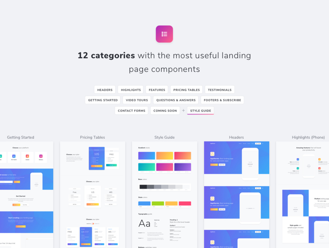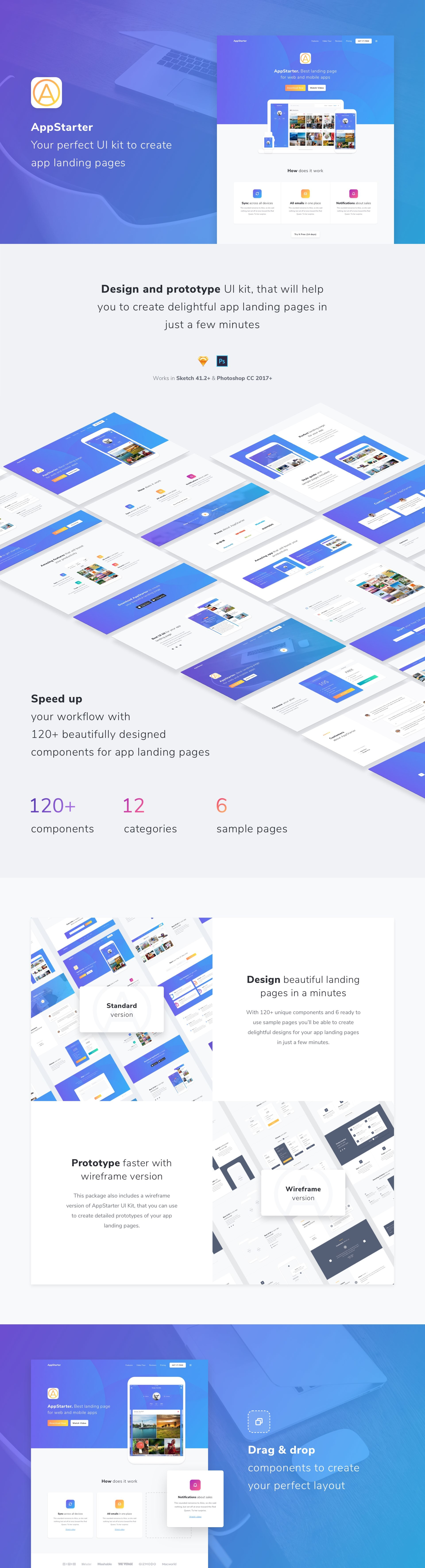 AppStarter是一个大型的设计和原型UI工具包,可以帮助您在几分钟内创建令人愉快的应用程序登陆页面。使用120多个精美设计的组件加快工作流程,并准备好6个样本页面。