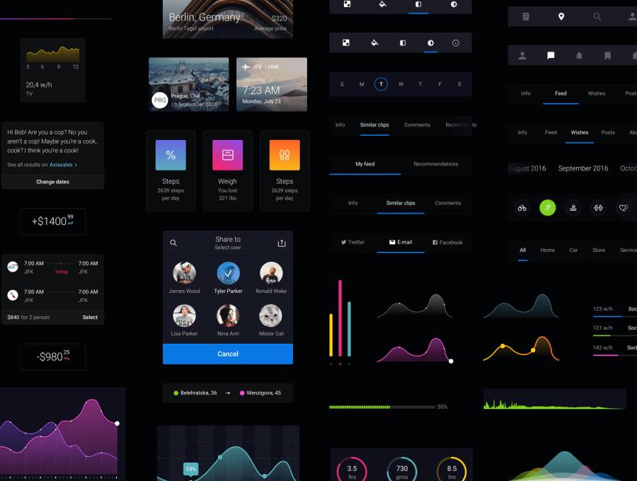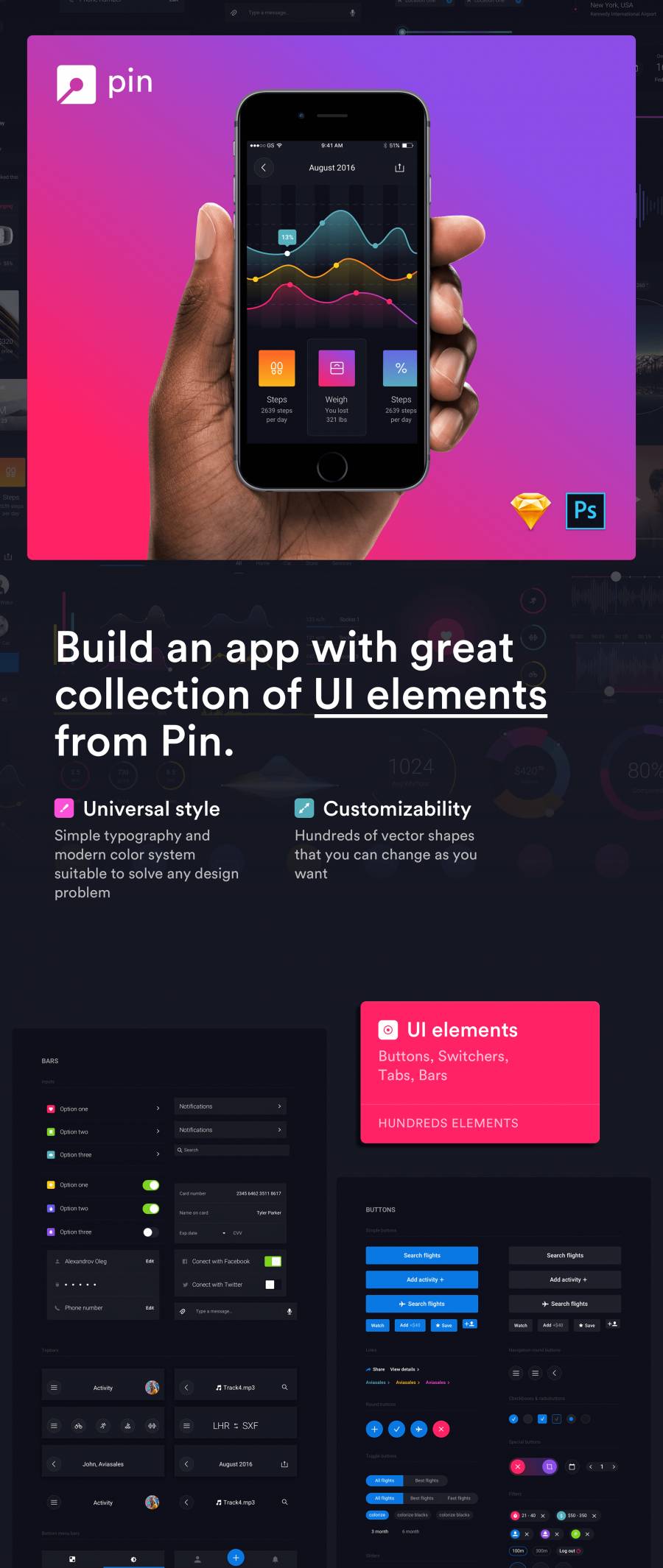 Pin是一组巨大的预制UI元素,可帮助您加快应用程序设计过程。拥有数百个UI元素,如按钮,切换器,选项卡,条形图,以及超过50个组合块,其中包含有用的工具,如卡片,插件,图表和小部件 - 这个巨大的UI工具包具有您所需要的下一个移动应用程序! Pin UI Kit与Sketch&Photoshop兼容。