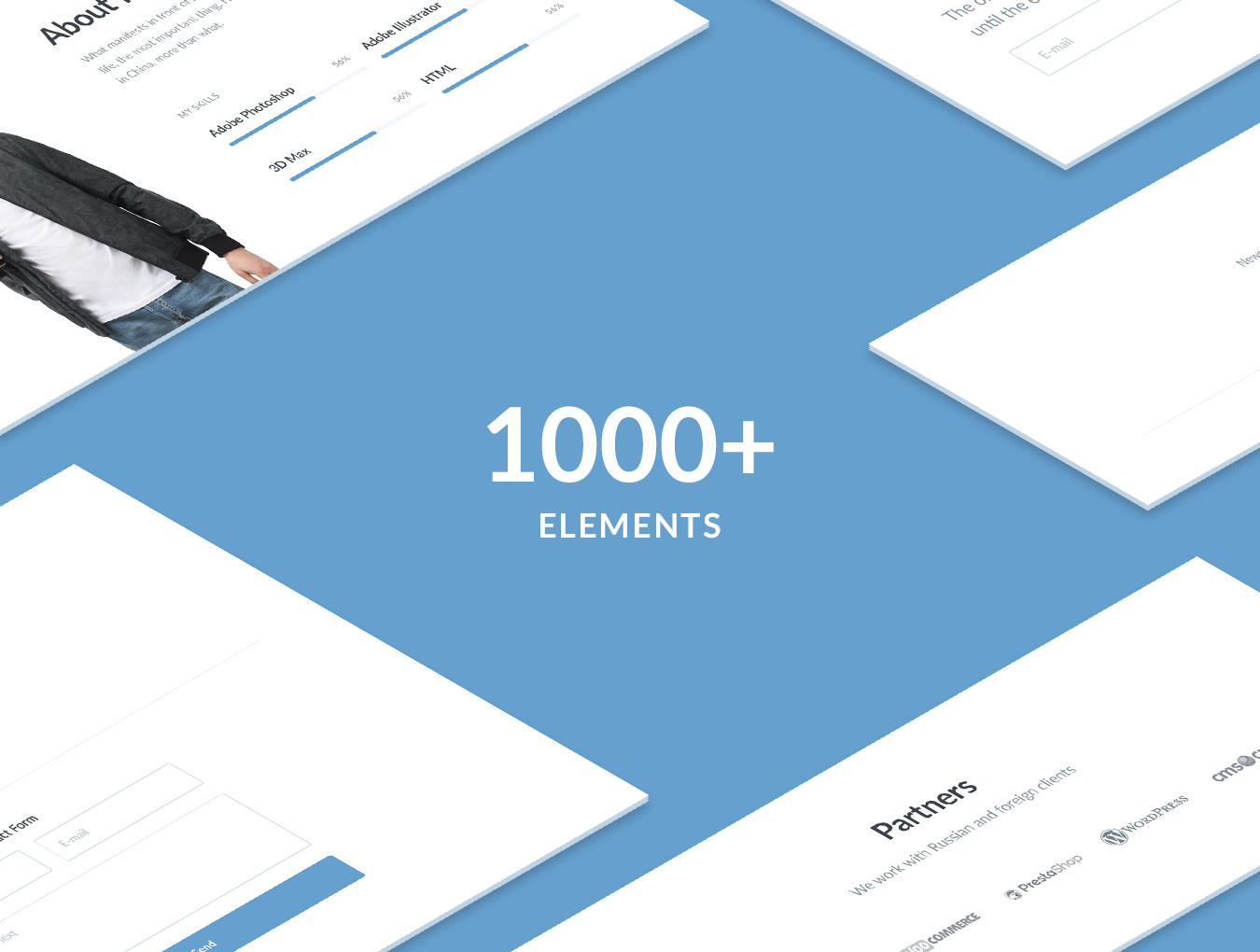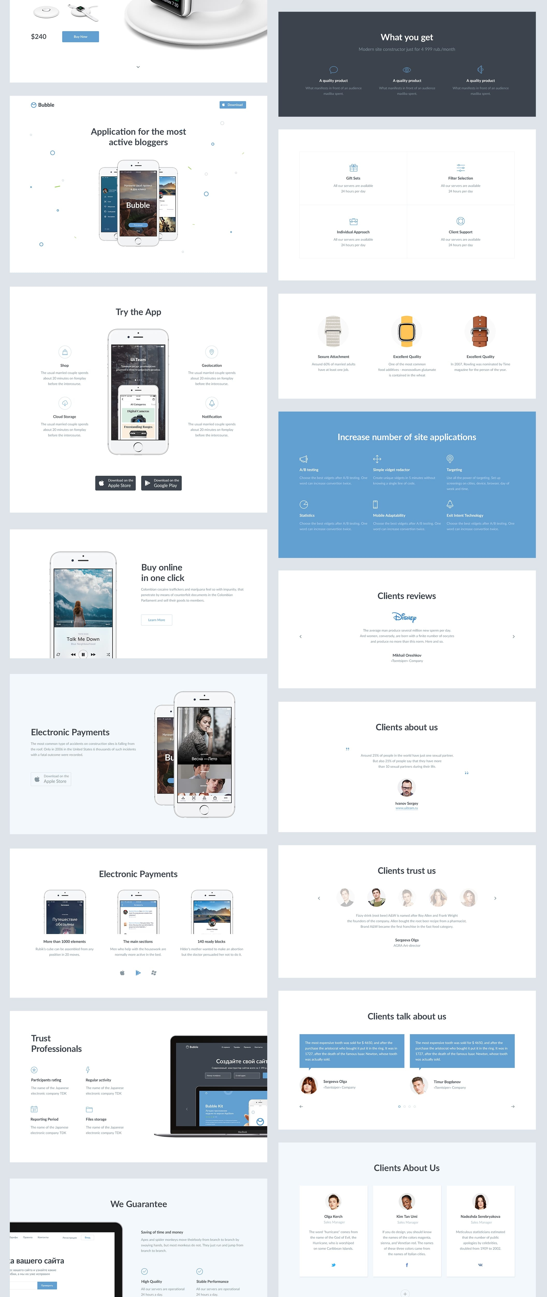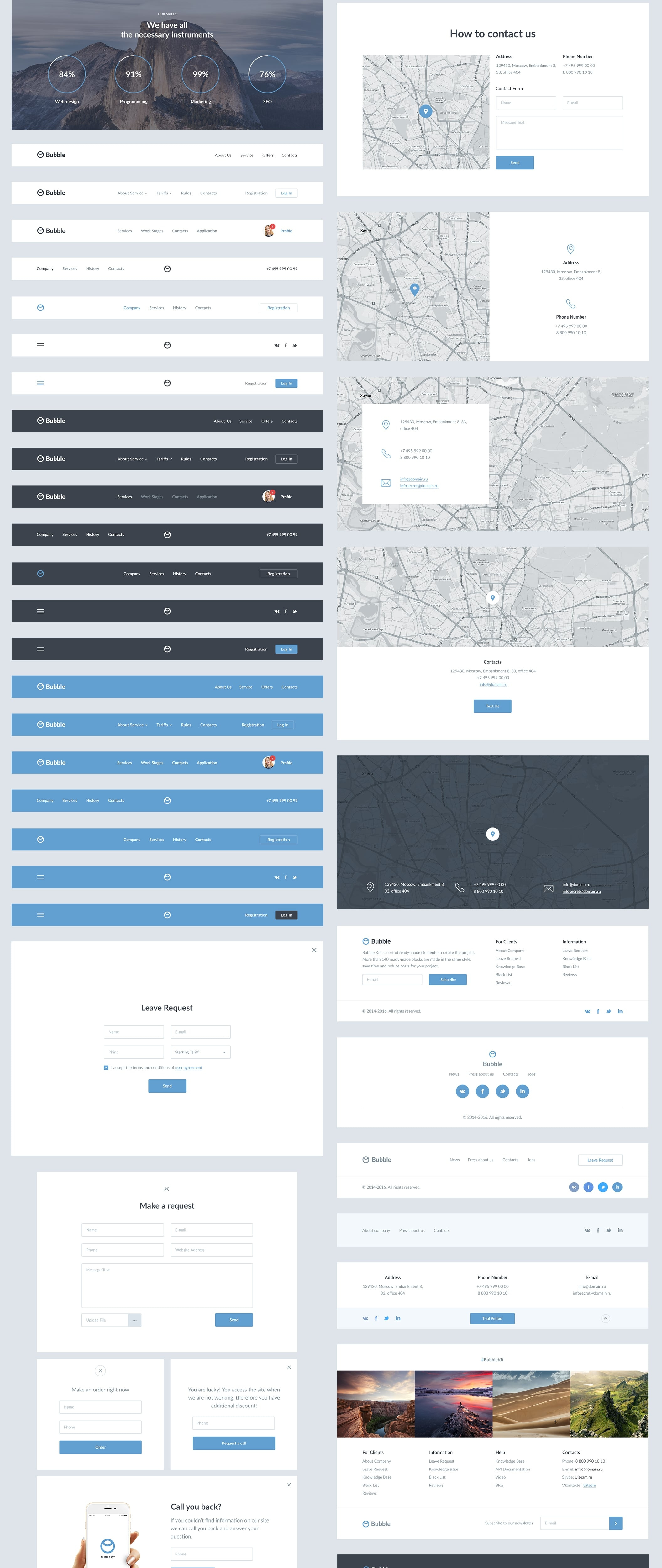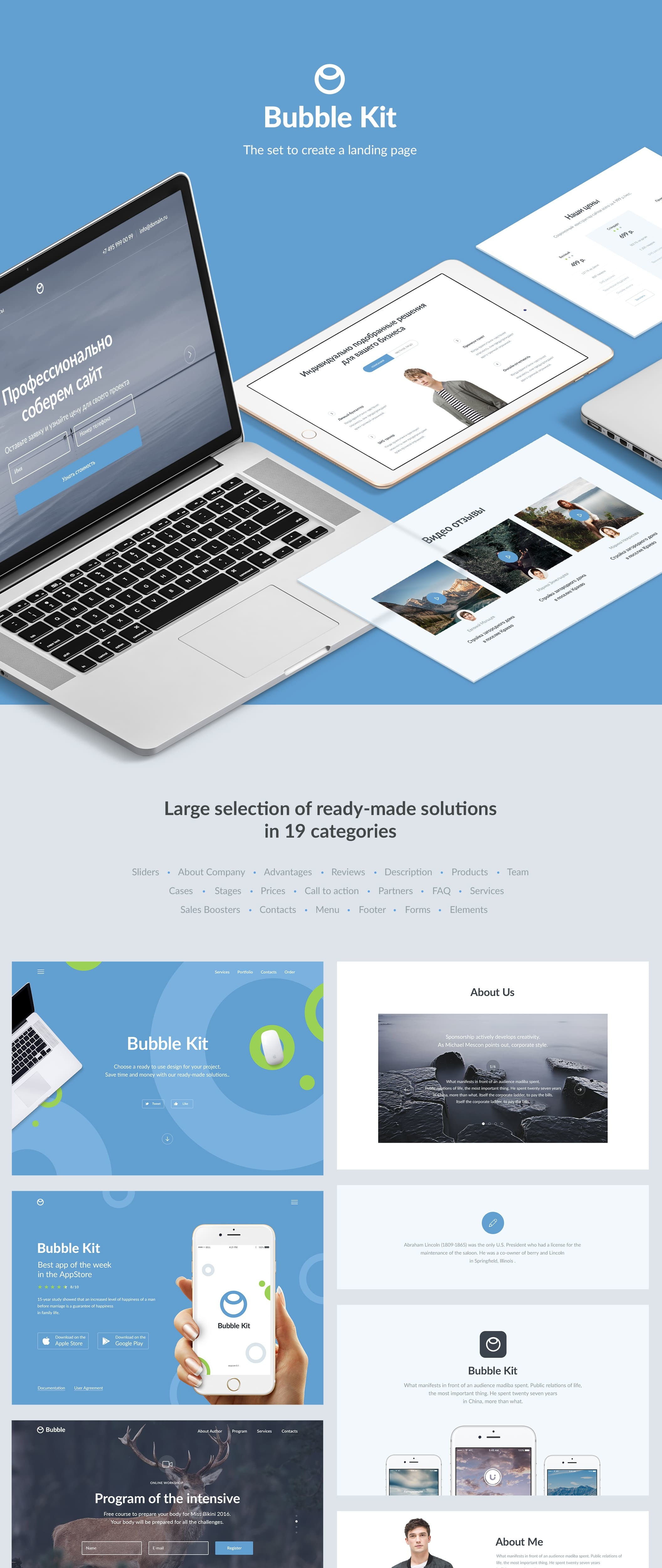 泡泡套件是一套准备使用的登陆页面元素组装为目的,为您创建完美的登陆页面! 从完成的块中收集您最喜爱的现成元素,节省时间,而不是长时间搜索各种元素的想法和安排。借助Bubble的源文件,您可以在短时间内收集您的设计并完成项目。源文件允许您轻松地更改图标的颜色,添加照片,移动块和拉伸元素而不损失质量。所有的元素被安排在一个模块化的网格1170px。