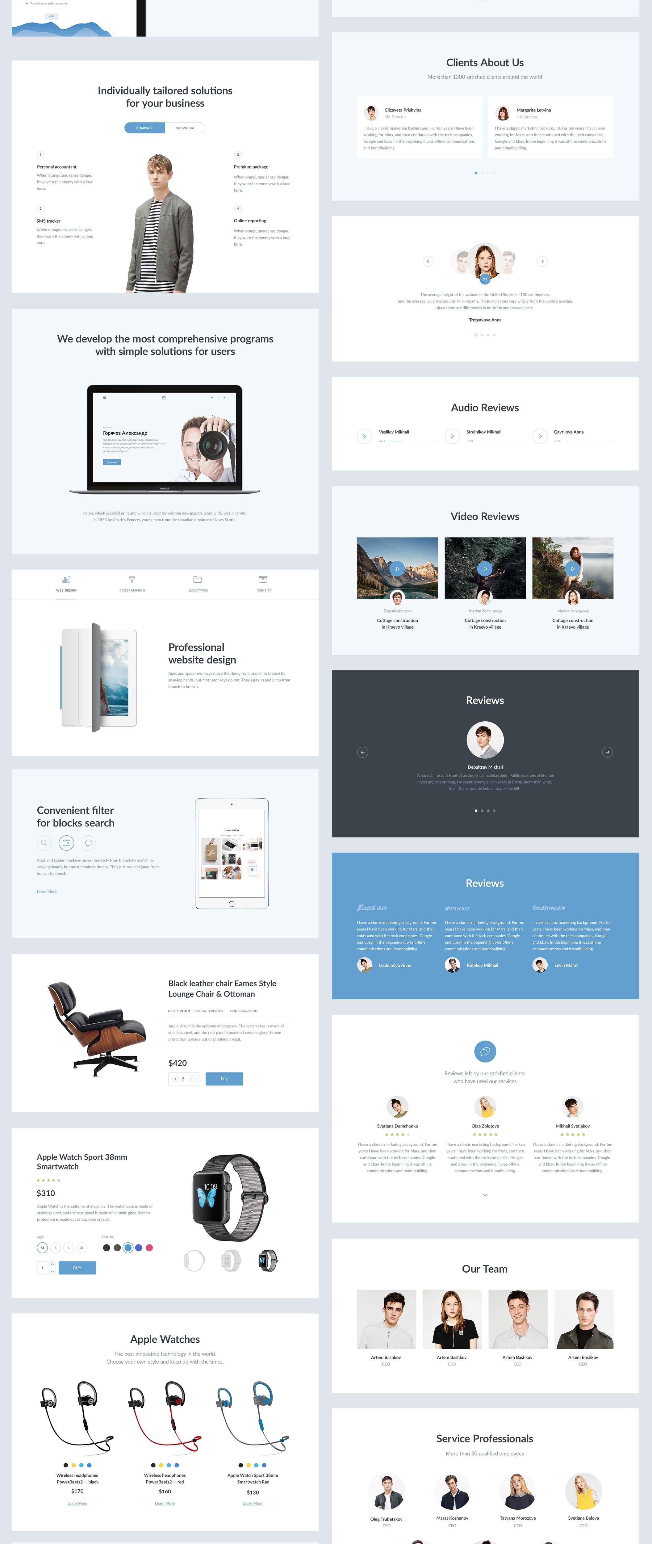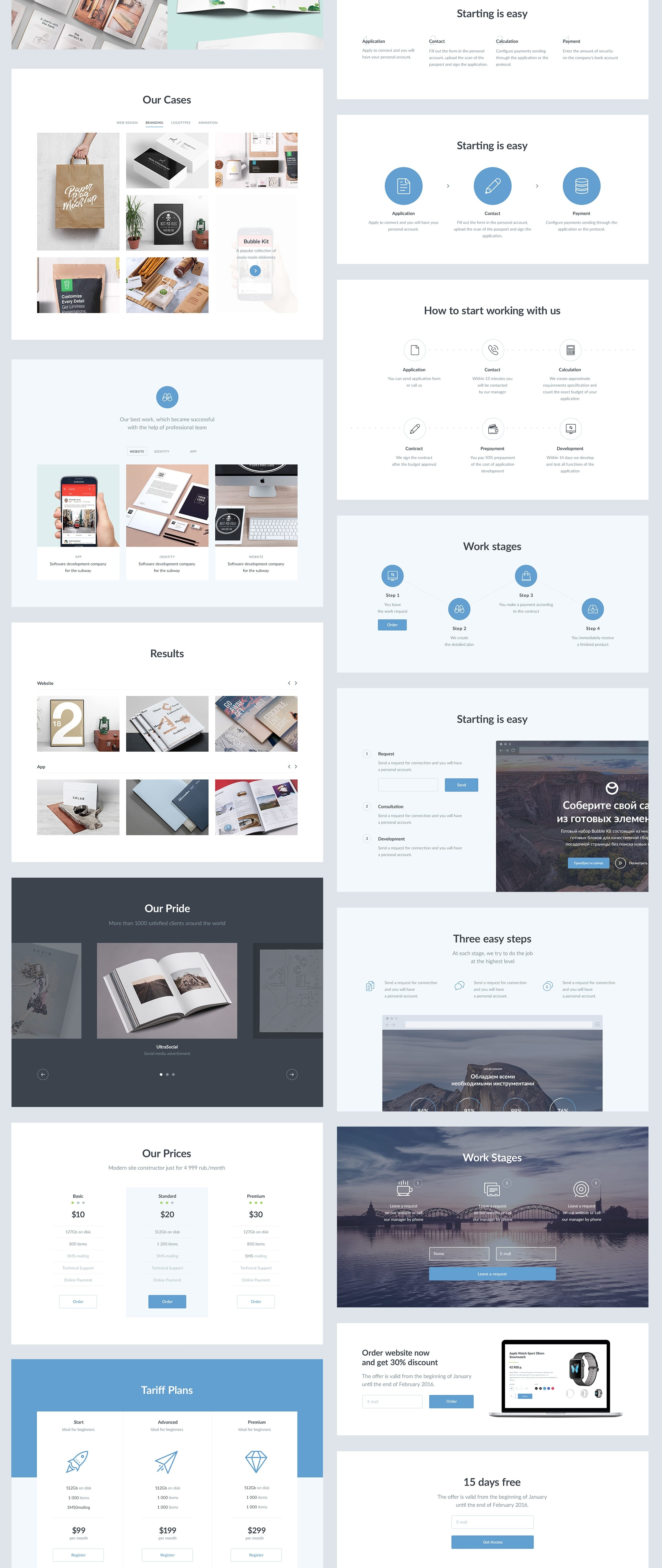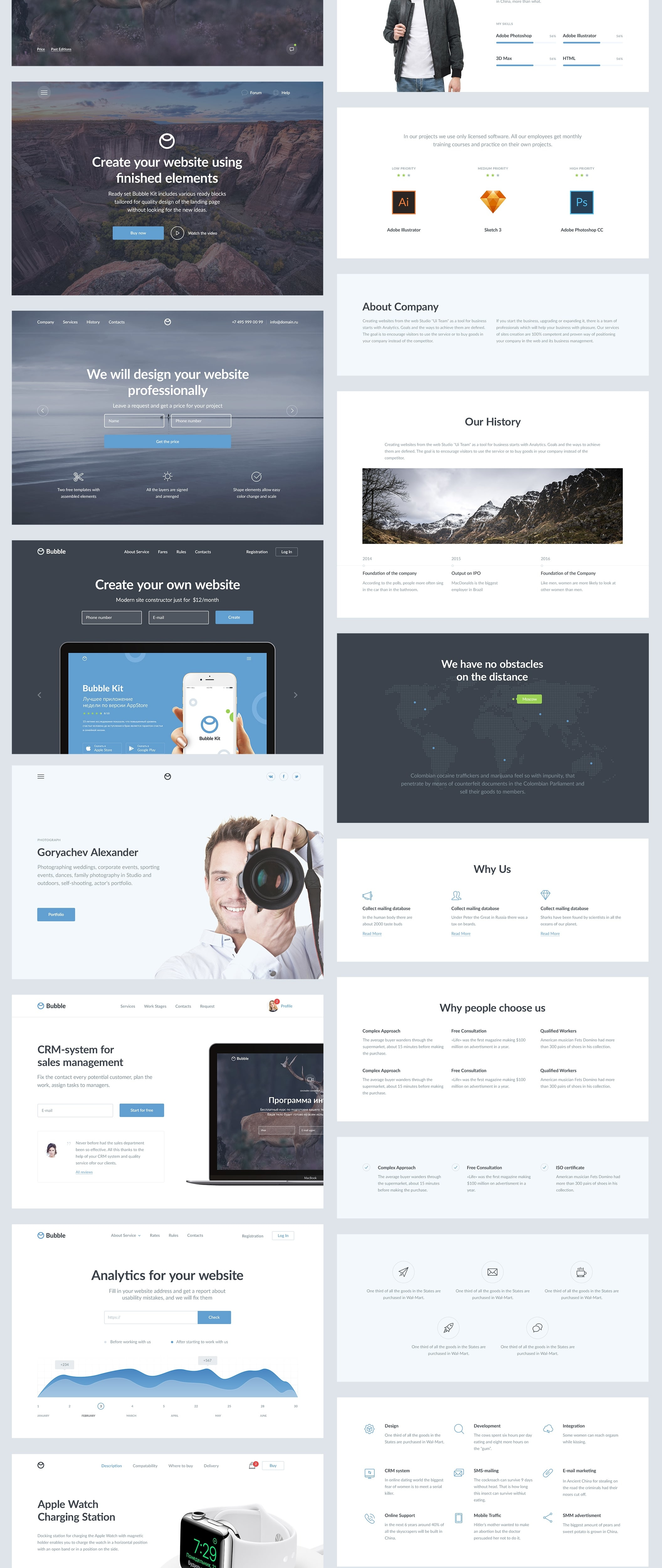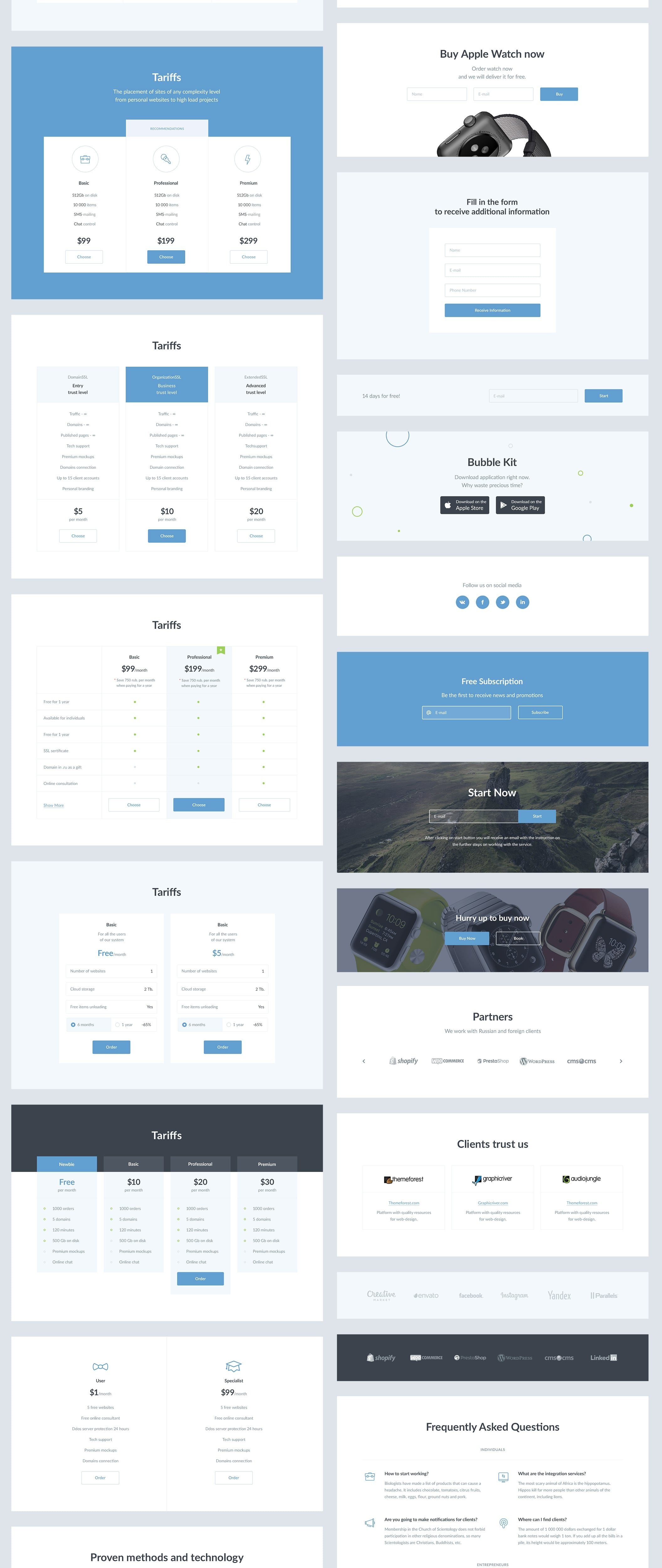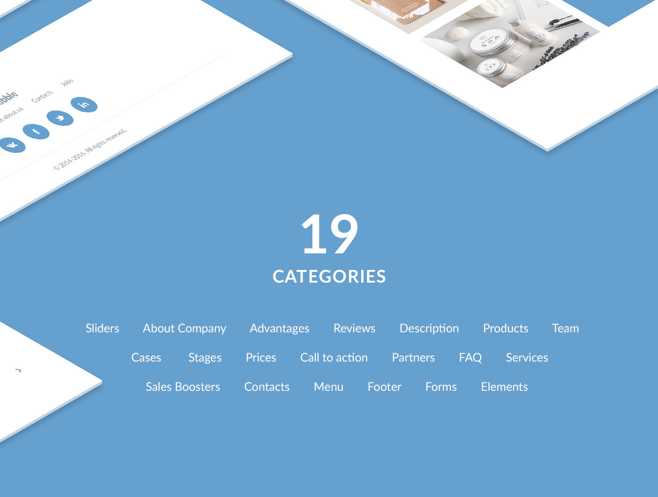 泡泡套件是一套准备使用的登陆页面元素组装为目的,为您创建完美的登陆页面! 从完成的块中收集您最喜爱的现成元素,节省时间,而不是长时间搜索各种元素的想法和安排。借助Bubble的源文件,您可以在短时间内收集您的设计并完成项目。源文件允许您轻松地更改图标的颜色,添加照片,移动块和拉伸元素而不损失质量。所有的元素被安排在一个模块化的网格1170px。