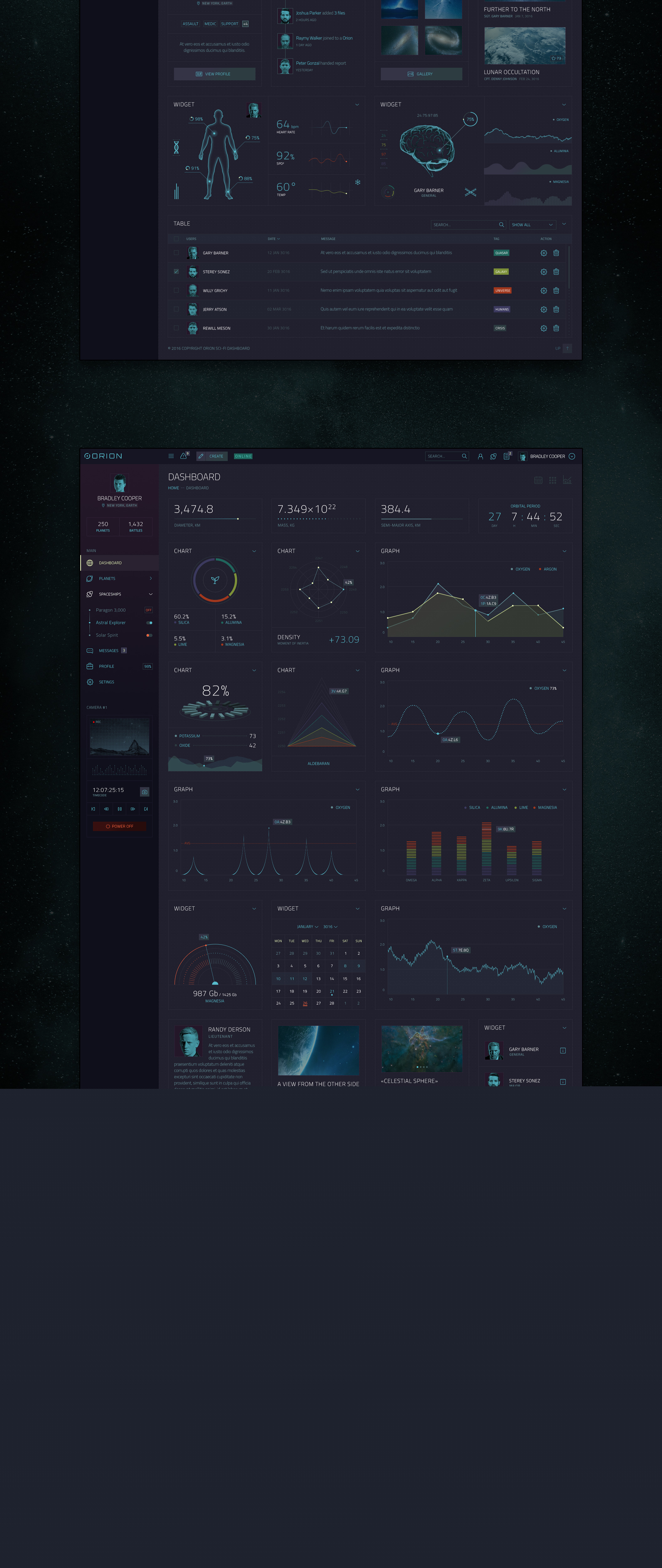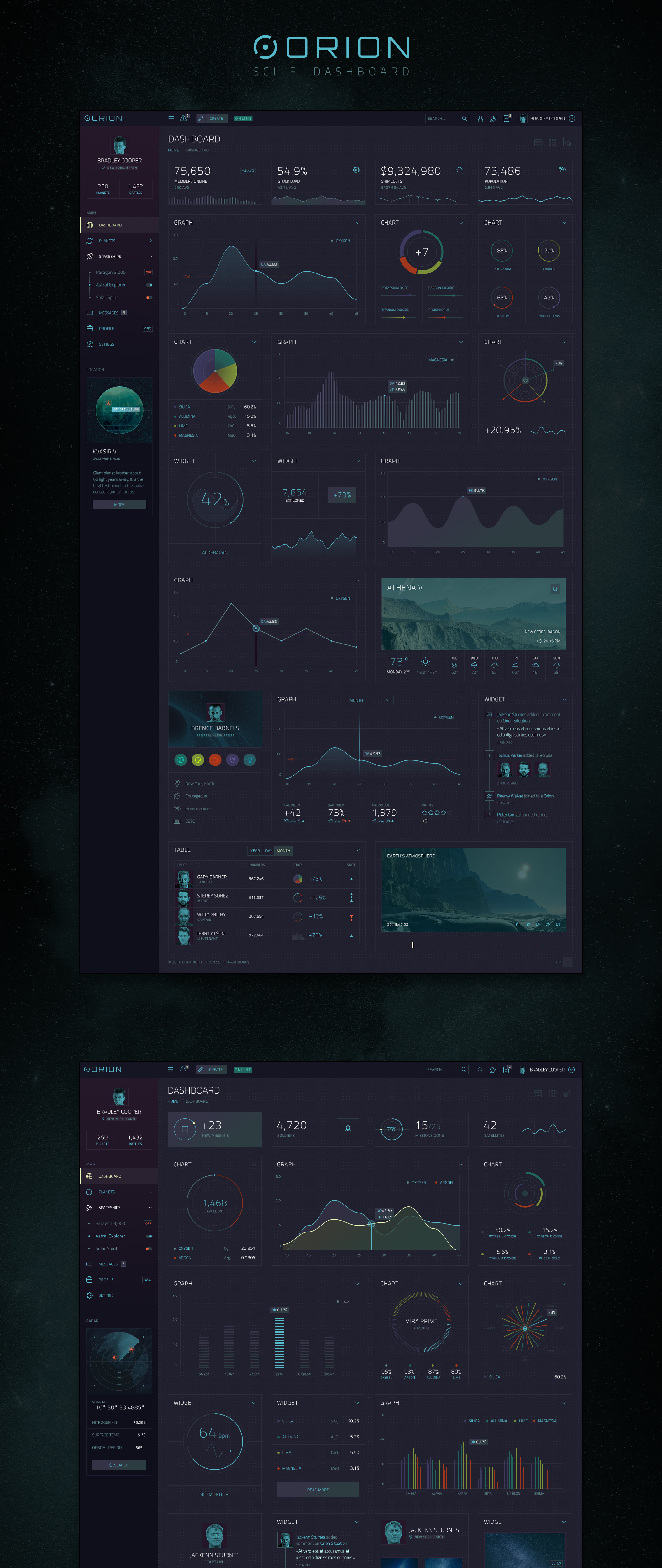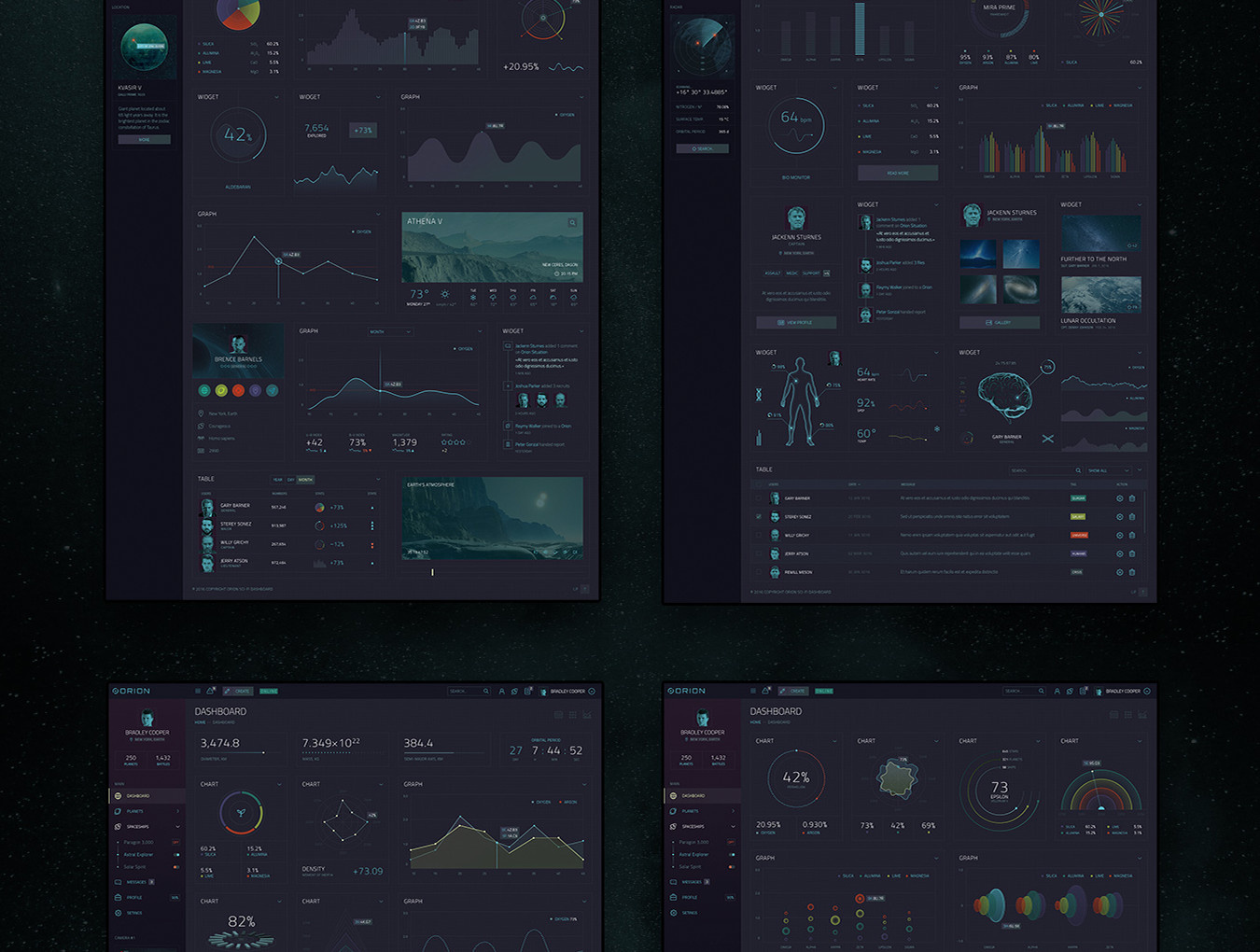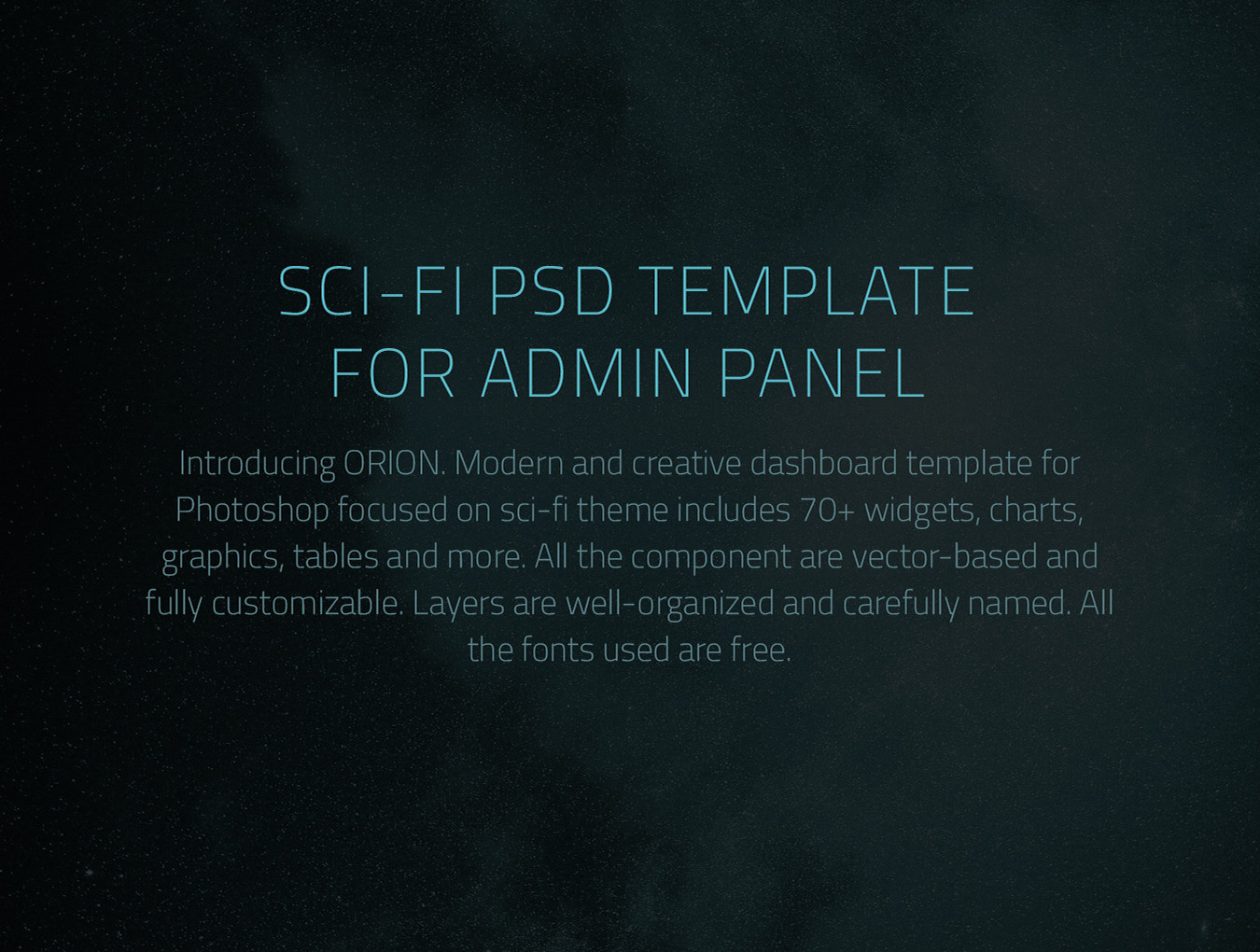 介绍ORION;用于Photoshop的现代创意仪表板模板主要针对科幻主题。猎户座包括70多个小部件,图表,图形,表格等等。所有的组件都是基于矢量的,可以完全自定义。图层是组织良好,并仔细命名。所有使用的字体都是免费的。