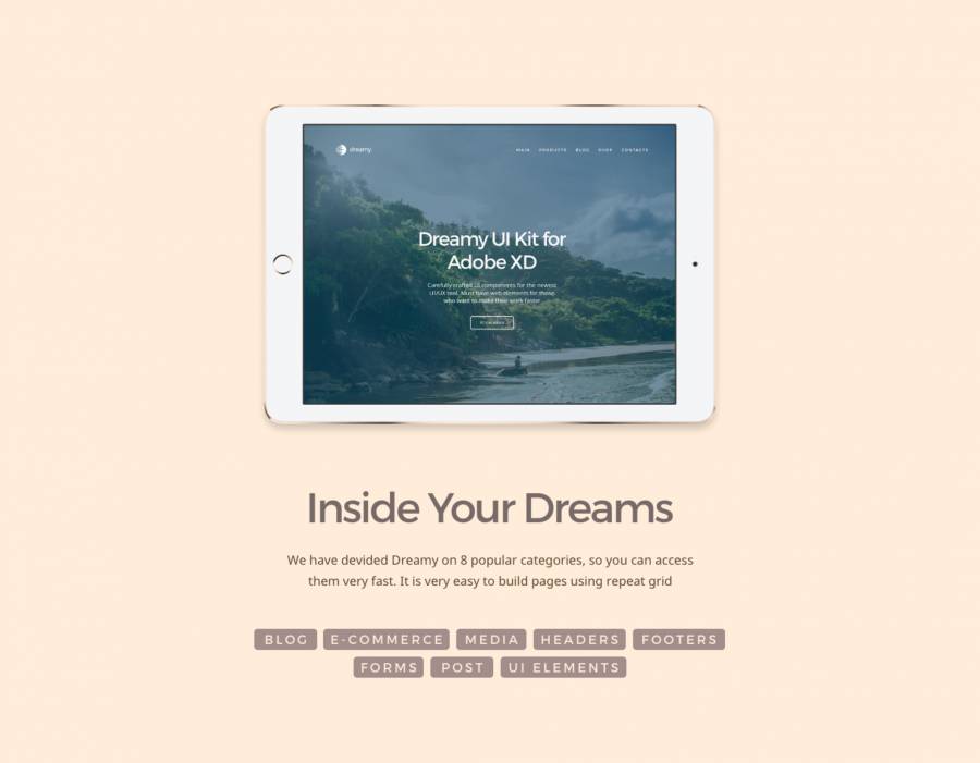 梦幻是精心制作和时尚的UI组件套件,用于Adobe最新的UI / UX工具。必须有那些想要使他们的工作更快的人的网络元素。用于Adobe XD的Dreamy UI工具包由8个类别,120多个组件和700多个元素组成。 Bootstrap网格,趋势颜色,矢量形状和Google字体将帮助您创建现代的网络项目,如博客或电子商务。