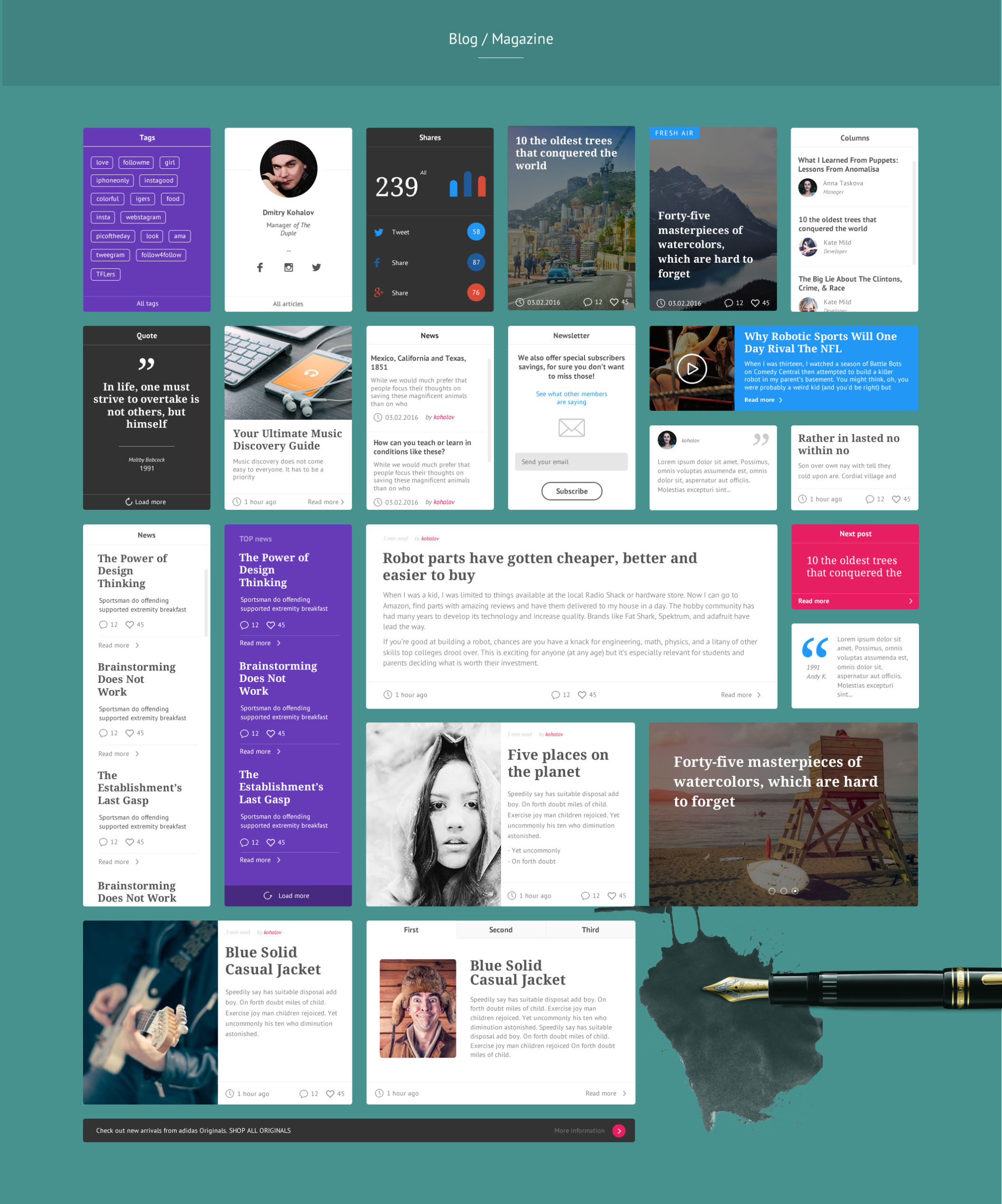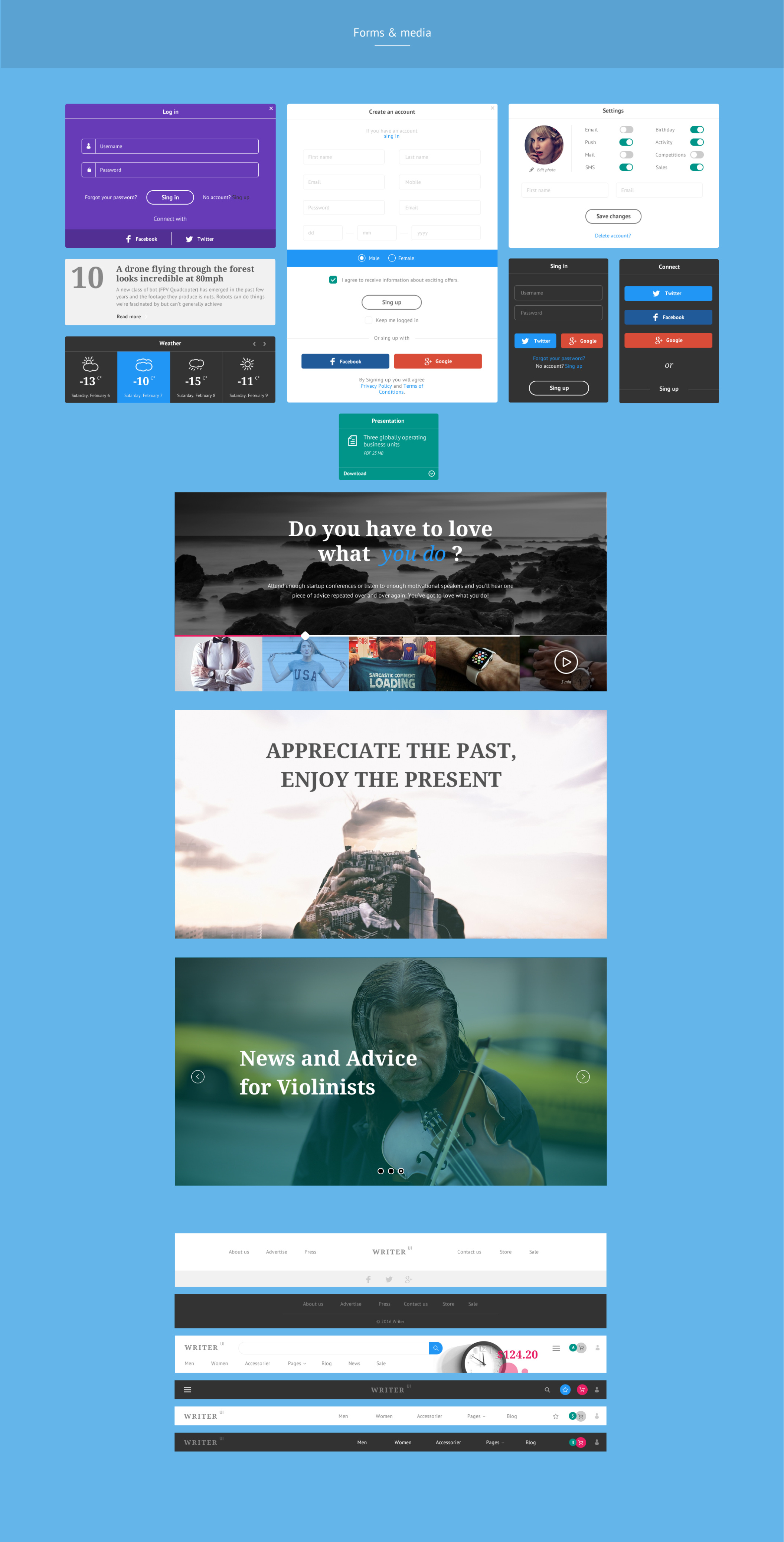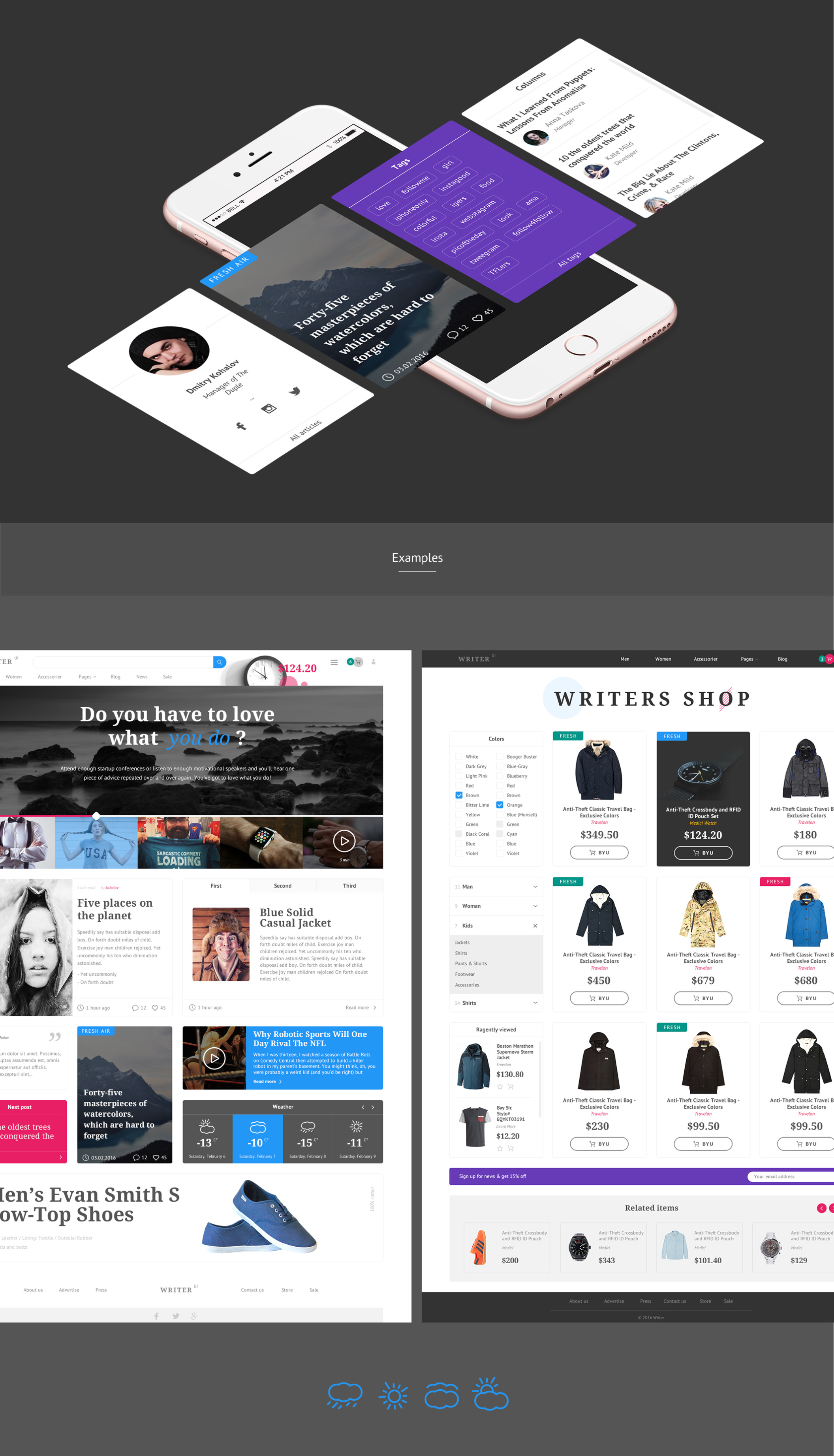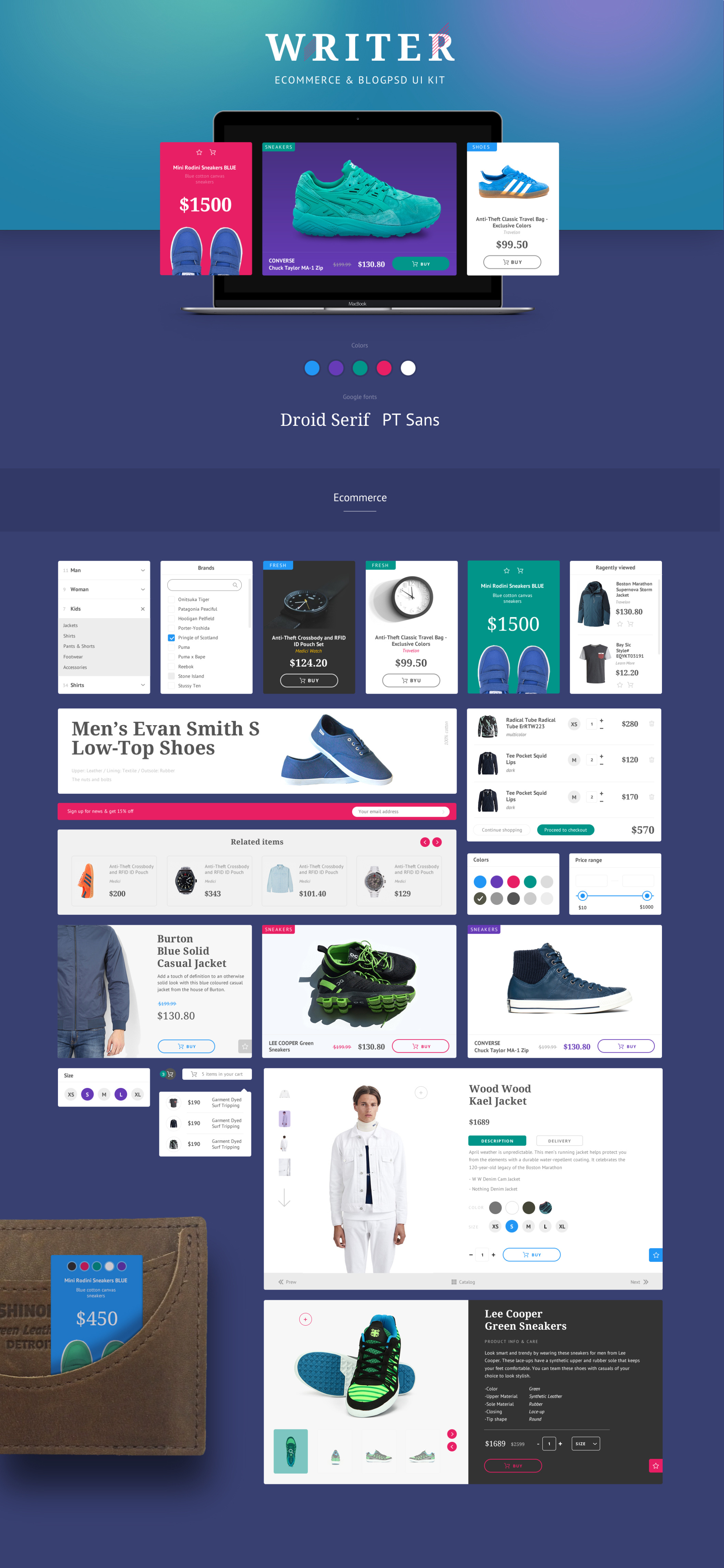 Writer是一个在Photoshop中制作的博客和电子商务用户界面工具包。该套件包含60多个UI组件和500多个UI元素。它是组织良好,易于定制,这个UI套件是您的下一个基本项目的必要条件。