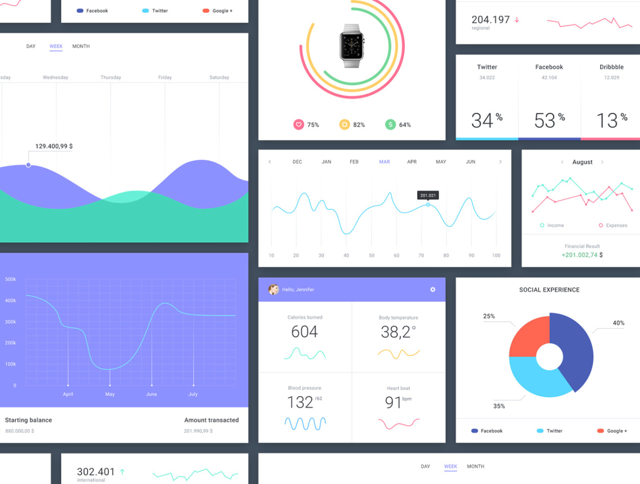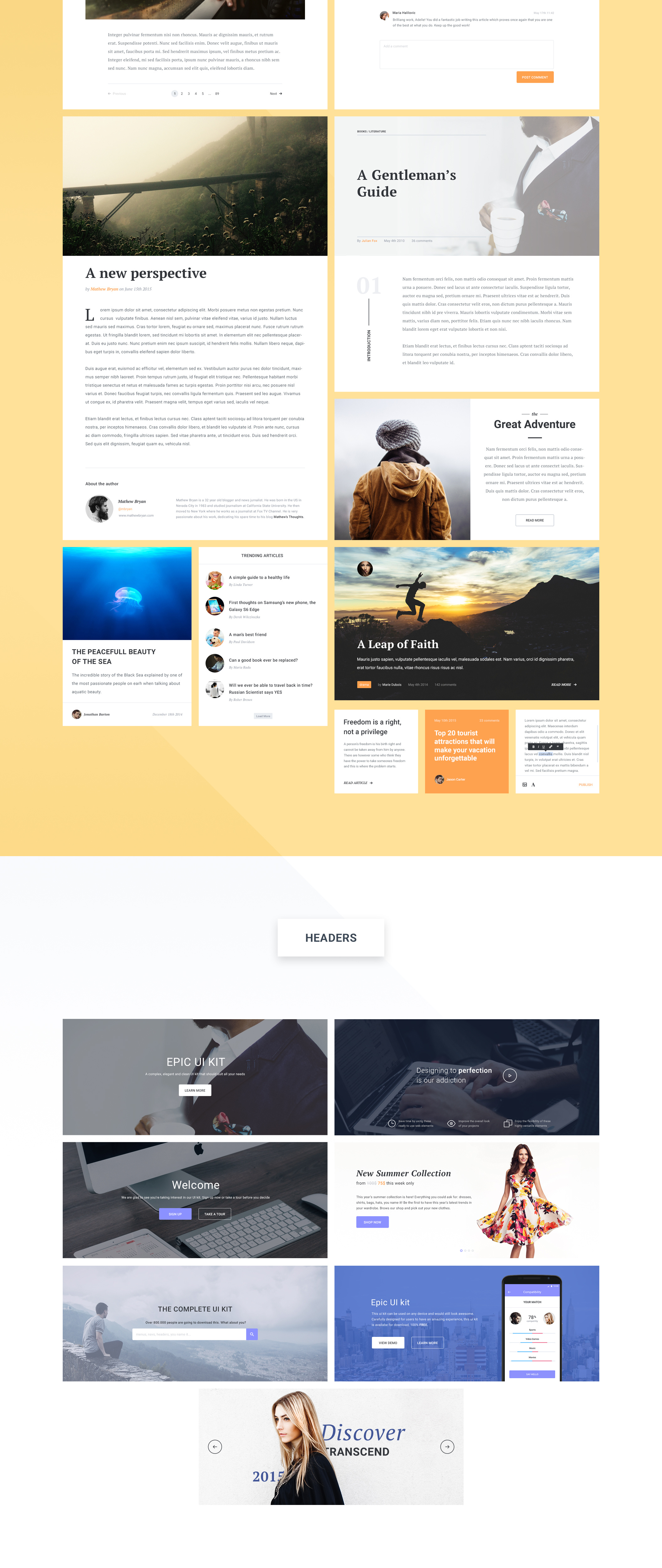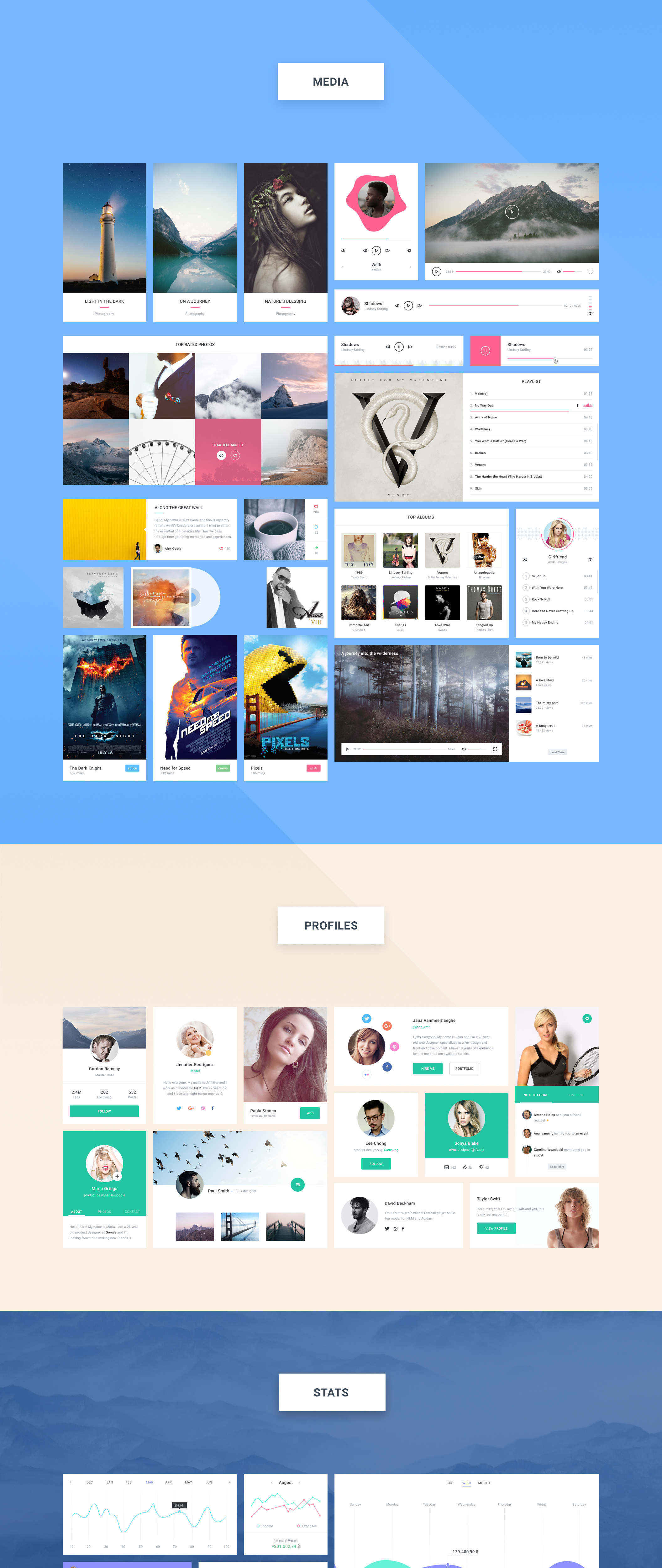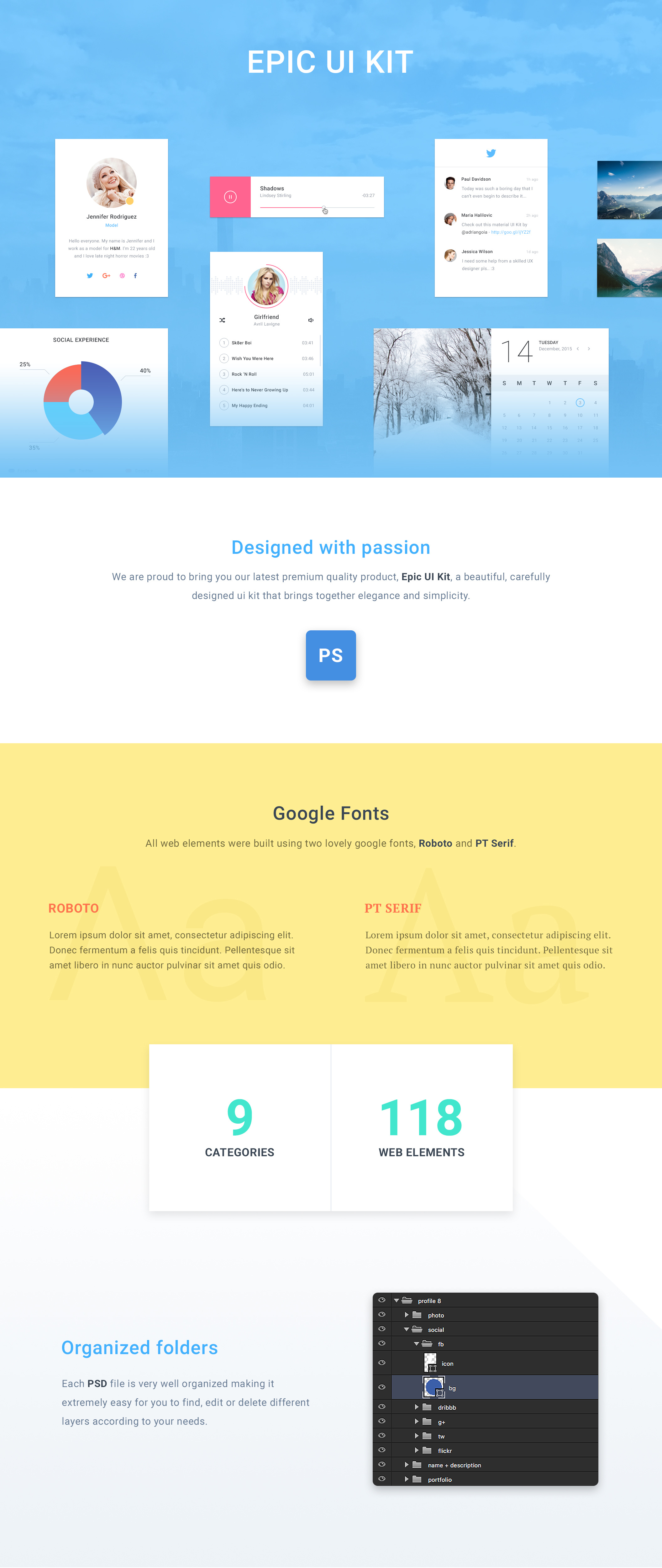 Epic UI Kit是一个由118个网页元素组成的大型,新鲜且充满活力的UI套件。它分为9个类别(文章,电子商务,表单,标题,媒体,导航,配置文件,统计和小部件),它允许你建立真棒,干净和现代的应用程序和网站。所有的元素都是矢量的,可以根据你的需要进行编辑。