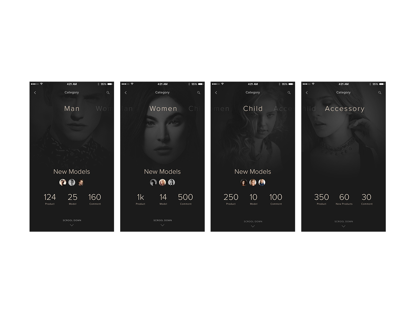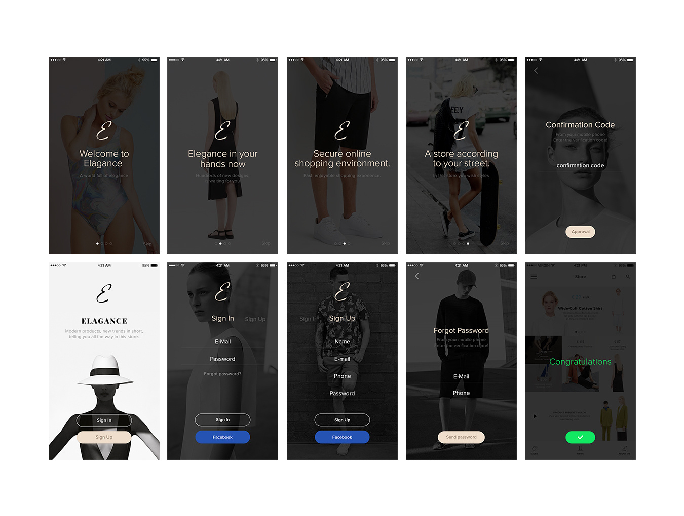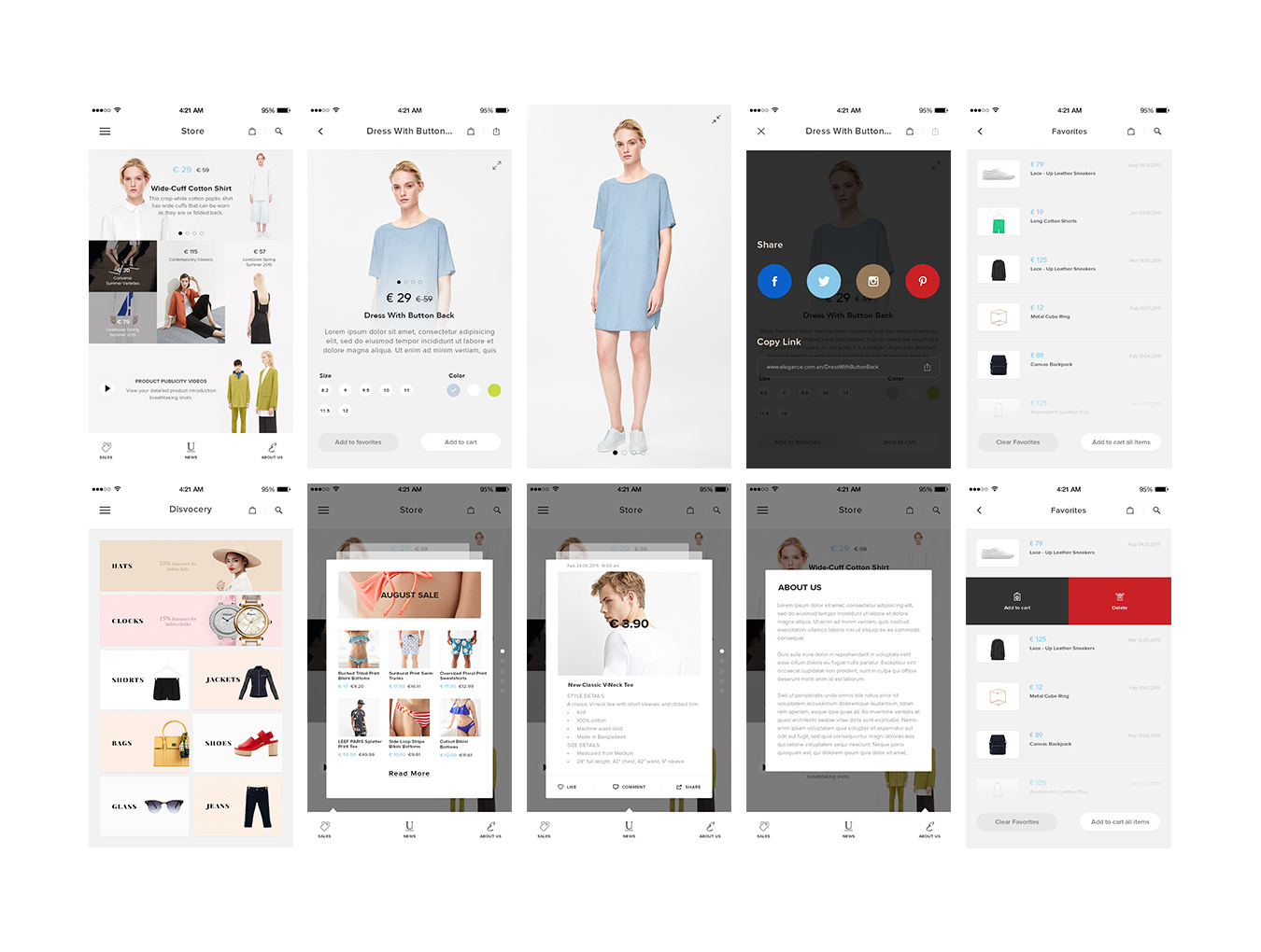 优雅,包括高品质的iOS屏幕,以解决衣服和购物类别。这个包内有40个PSD文件,用Photoshop详细准备好了。每个屏幕都非常易于使用,完全可定制,并精心组装成Photoshop格式。