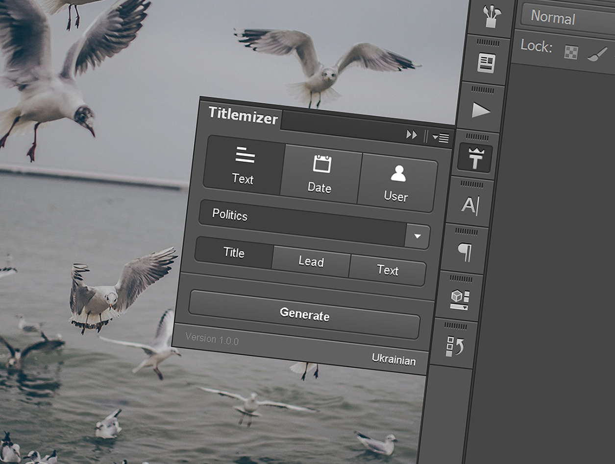 Titlemizer是一款优质的Photoshop插件,可生成随机相关的标题,线索,文本,日期和用户名。目前支持英语,乌克兰语和俄语文本生成三个主题类别:技术,经济和政治。选择一个或多个文本图层,然后单击“生成”。所有文本都是从庞大的数据库中随机选择的,因此您生成的所有内容始终与您的设计相关。不再是lorem ipsum。