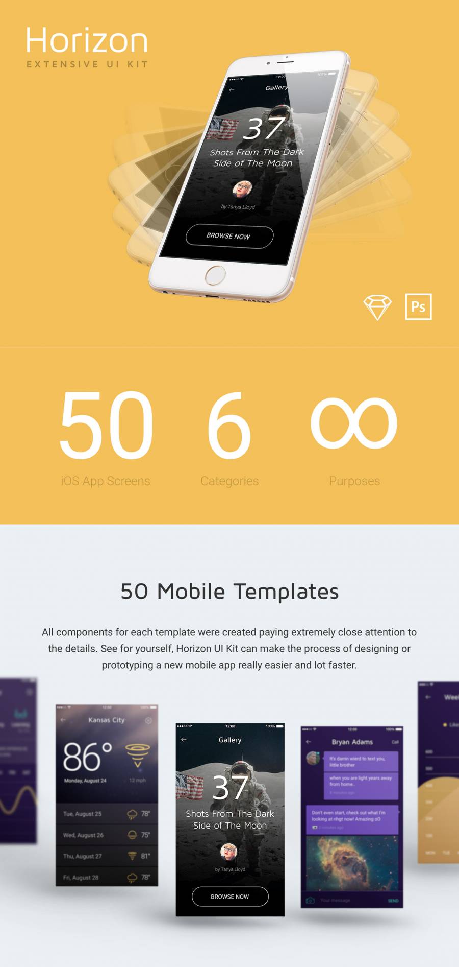 Horizon UI是一套由六个类别组成的50个iOS移动应用程序模板的高级版本,具有原始设计,用Photoshop和Sketch的爱与专业技能制作而成。每个模板都是完全可定制的,组织良好,使设计你的下一个应用程序的过程更容易!