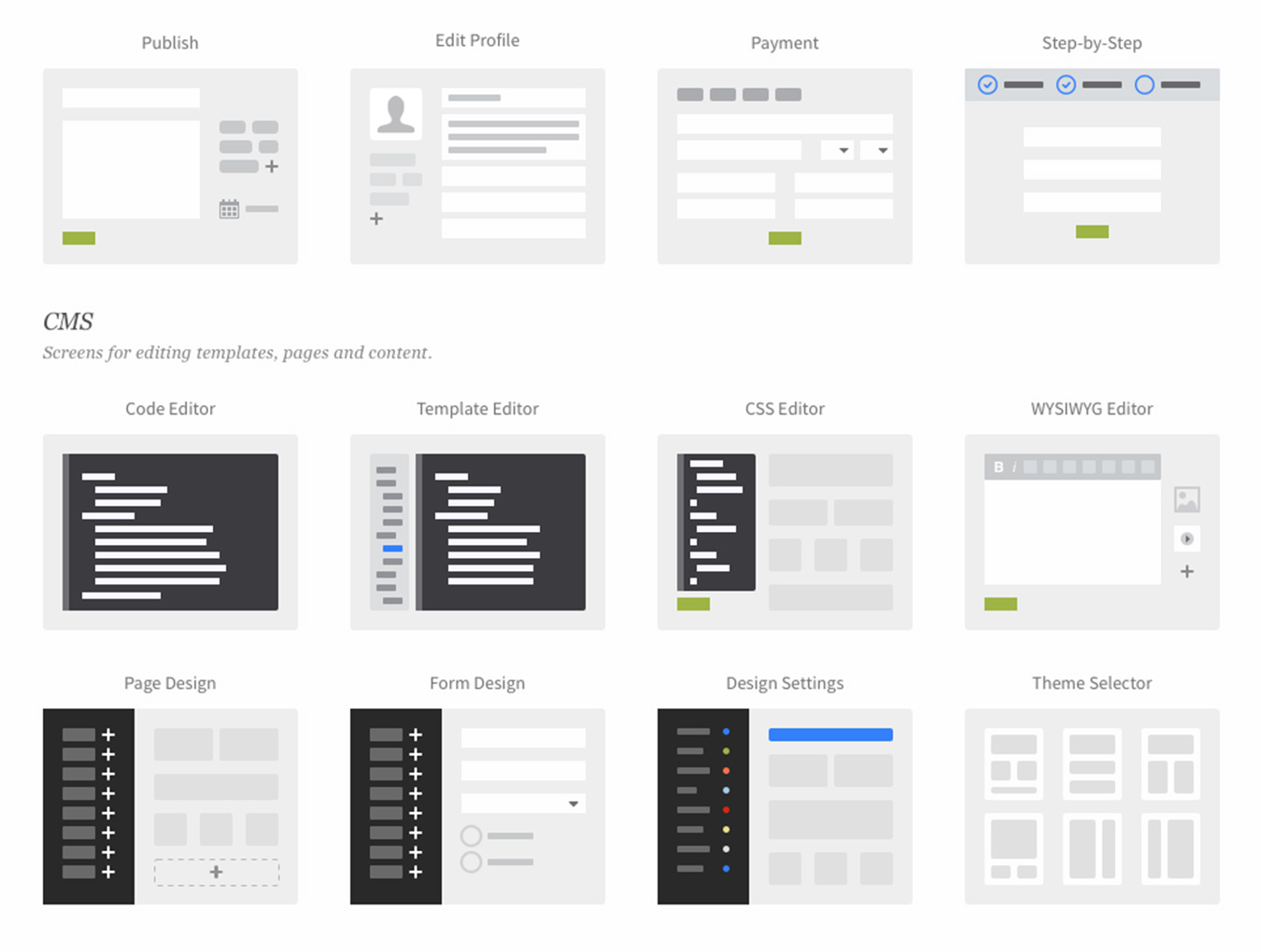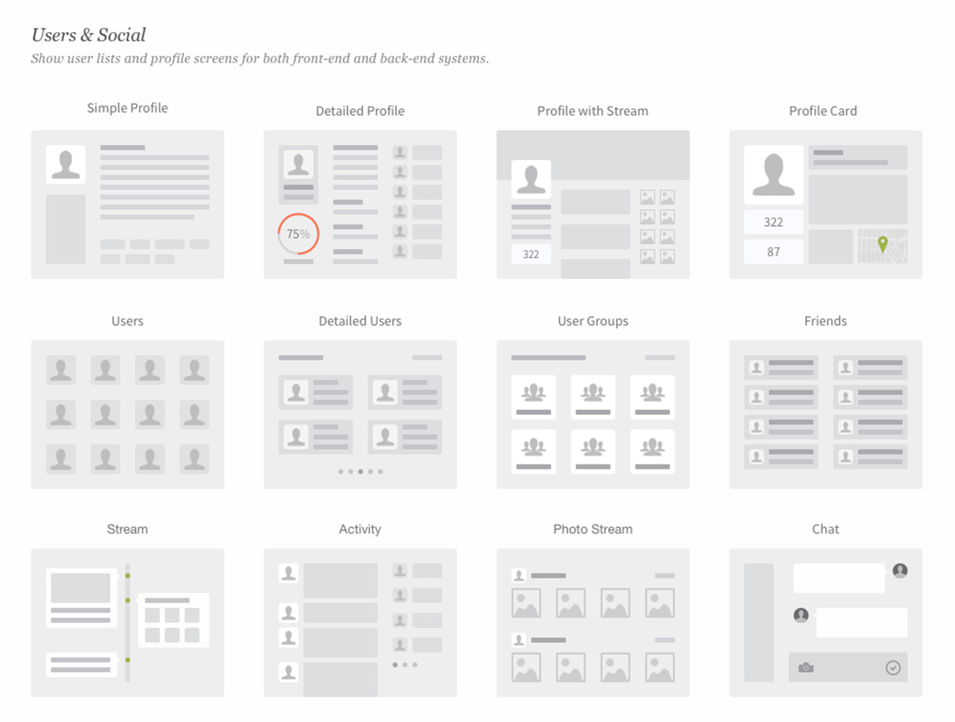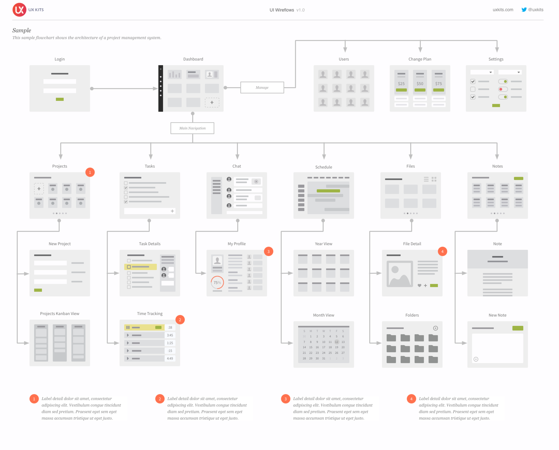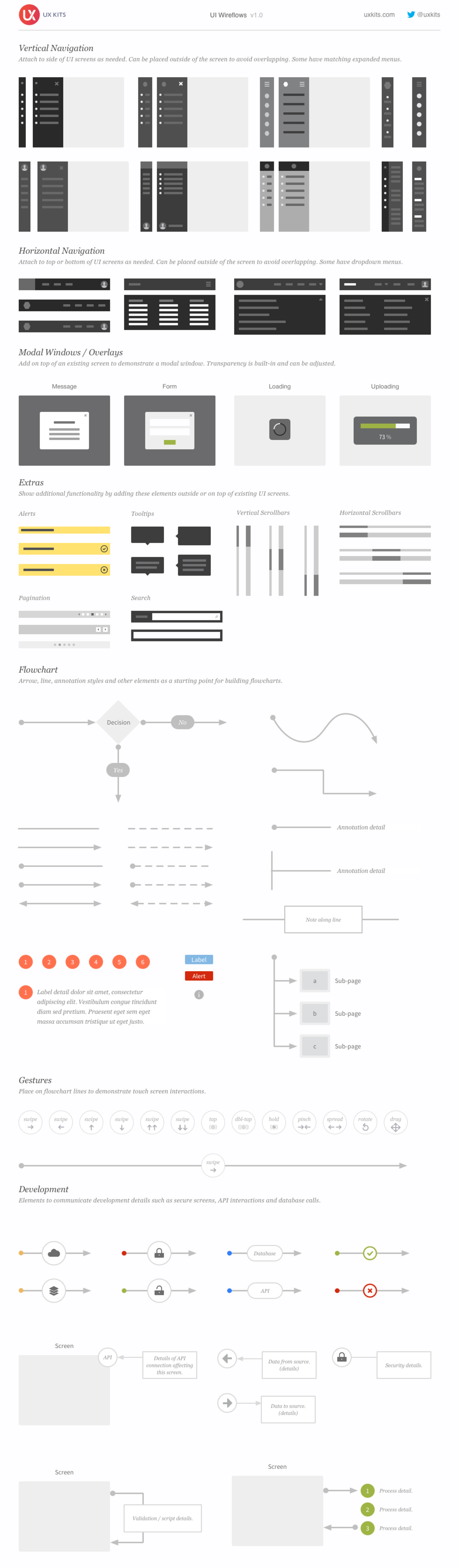 UI Wireflows设计时考虑了基于网络的桌面和平板电脑软件,包括用于10类常见类型应用的微型线框。附加元素允许您添加导航,警报,滚动条,工具提示,分页,叠加层(如模态窗口),流程图元素,触摸屏手势和开发细节(如API调用)。还有一个示例文档可帮助您入门。