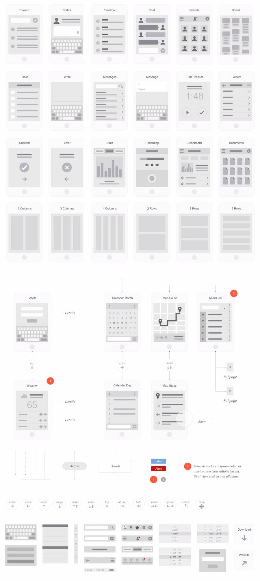 一款应用程序的架构,交互和布局可以在一个清晰明确的可交付内容中进行。流程图模板包含66个完全可定制的迷你线框,以及手势图标和常用元素。