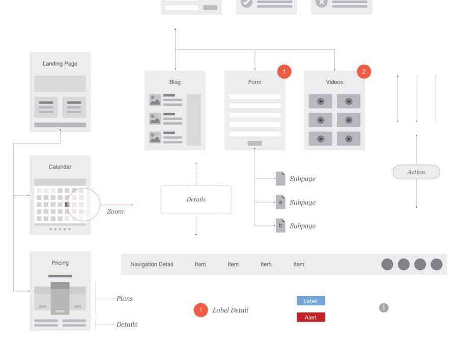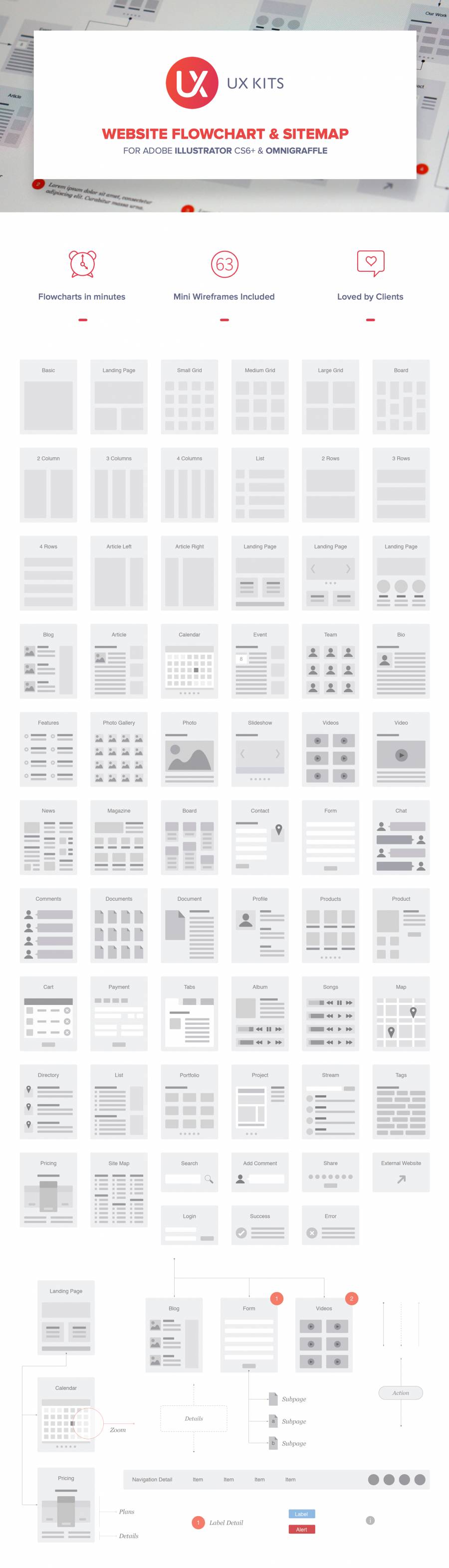 从我们的Illustrator和OmniGraffle流程图模板中拖放元素来创建专业的客户端交付物。您将获得所有的页面,线条和标签,并以此为起点。流程图不仅展示了网站的架构和交互,还展示了每个页面的内容和布局的总体思路。