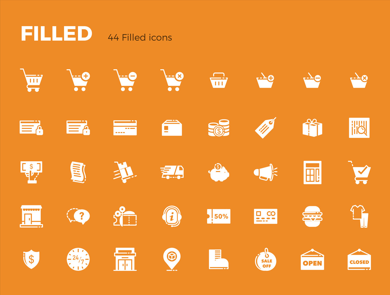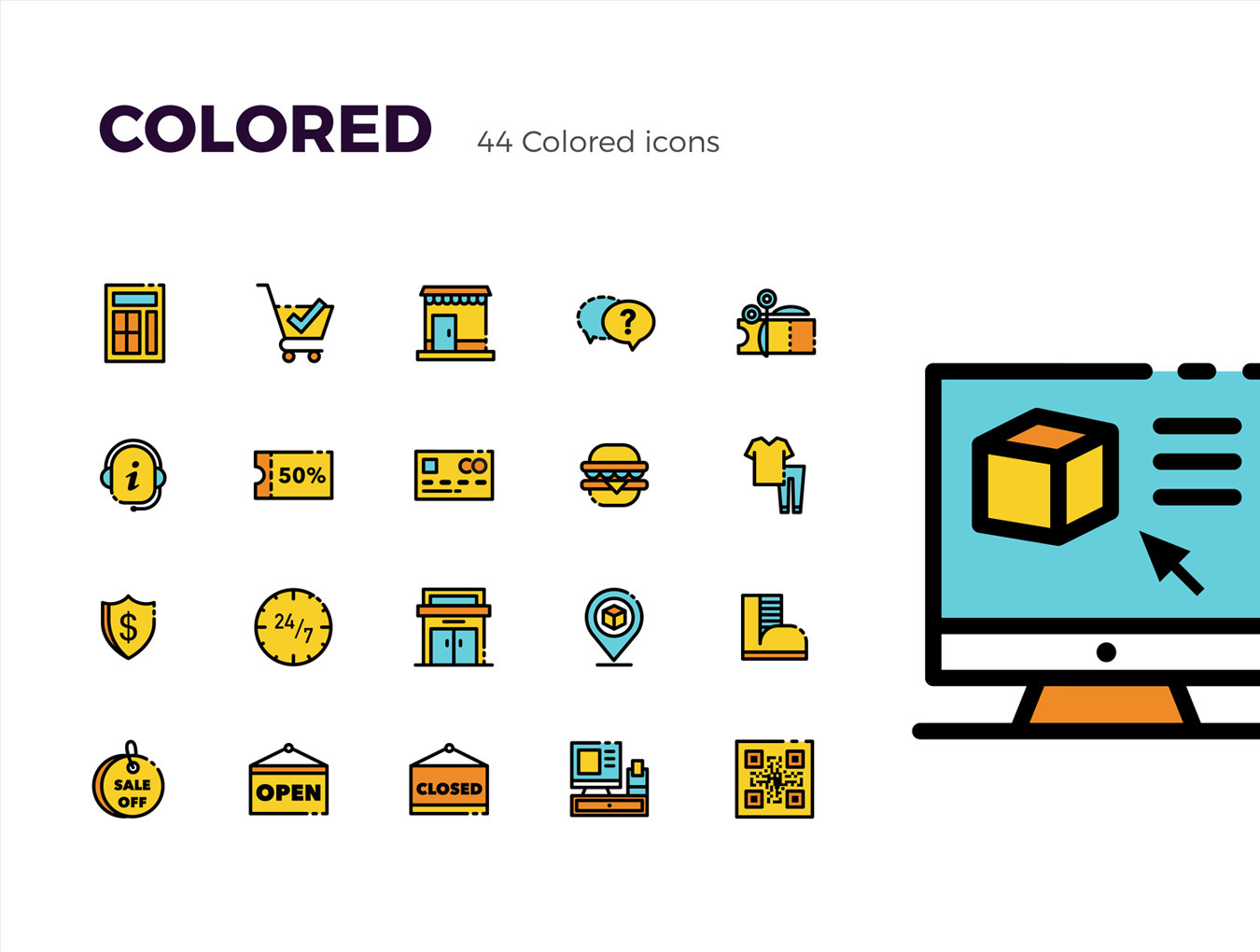 44个图标用于电子商务的3种变化:彩色,填充,大纲,皮卡斯电子商务图标集