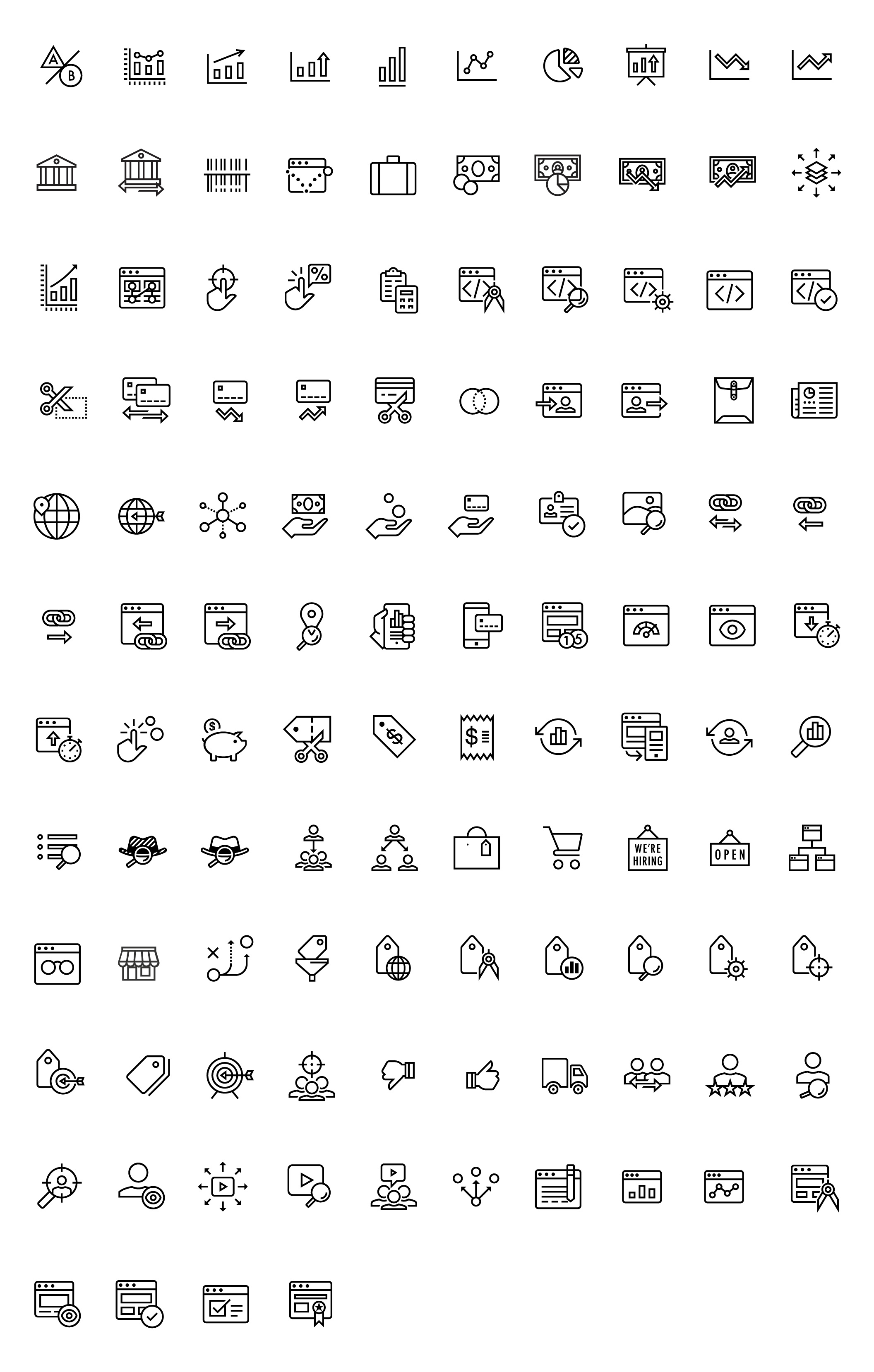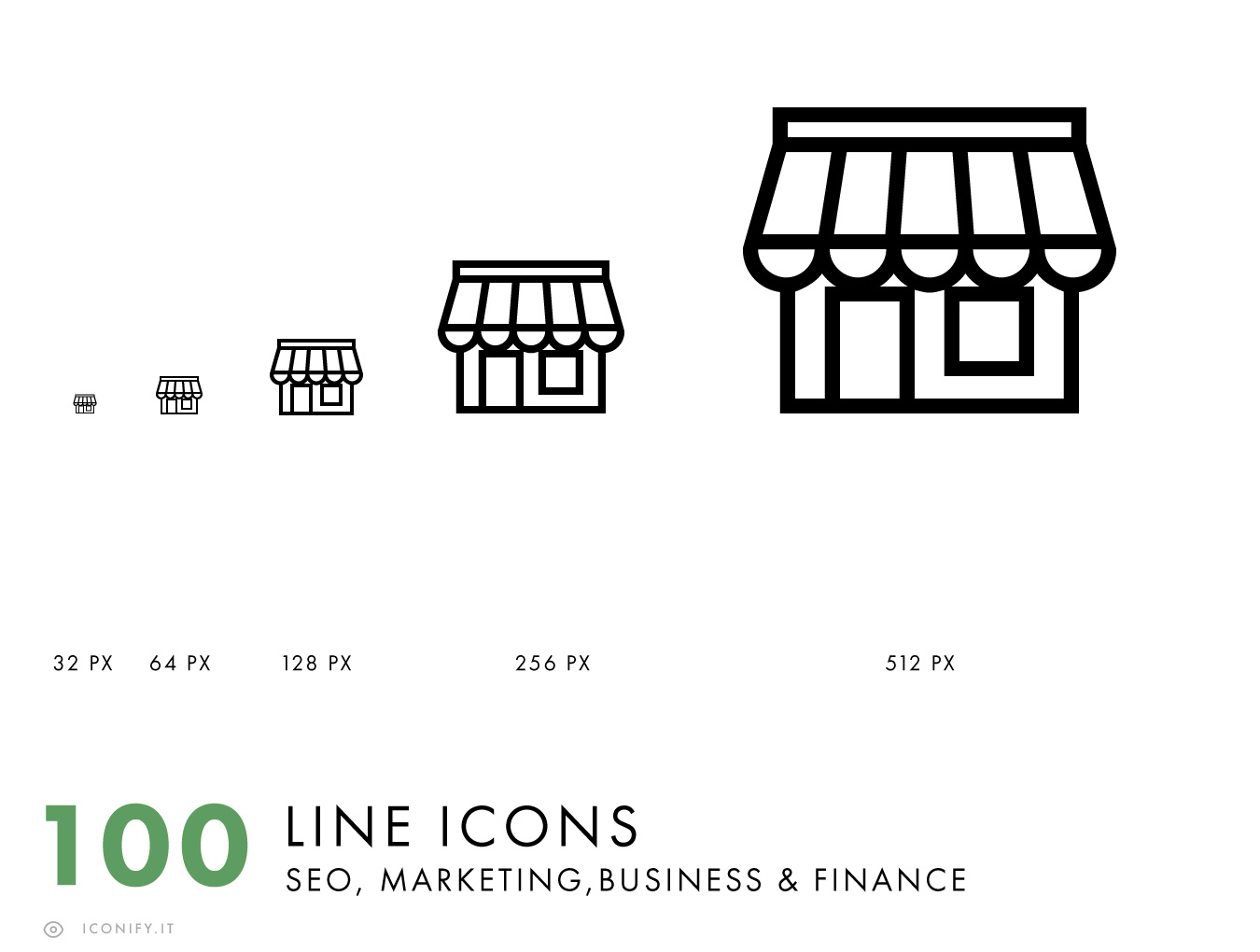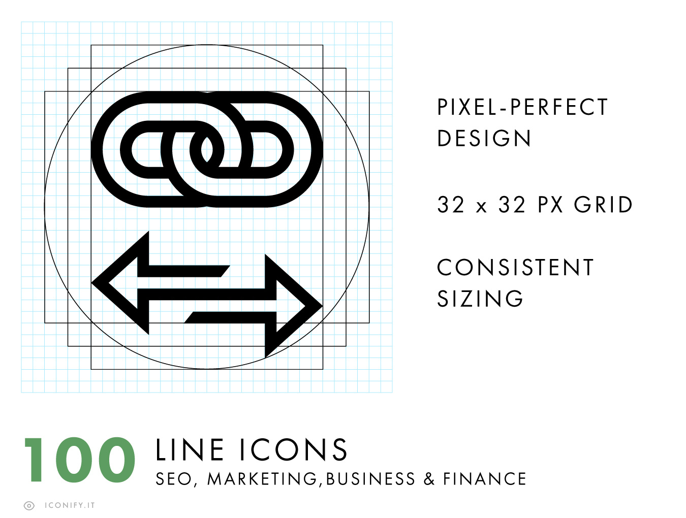 描绘SEO,营销和&企业概念的100个线象。每个图标都设计在一个32×32像素的网格上,并与像素完美对齐,以便以32像素的任何倍数进行清晰渲染。