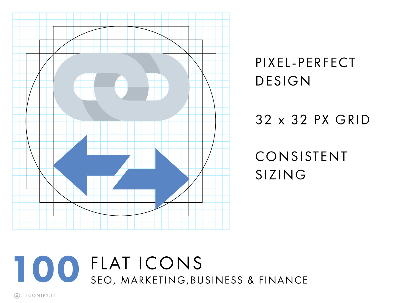 100平彩色图标描绘SEO,营销,&业务概念。每个图标都设计在一个32×32像素的网格上,并与像素完美对齐,以便以32像素的任何倍数进行清晰渲染。