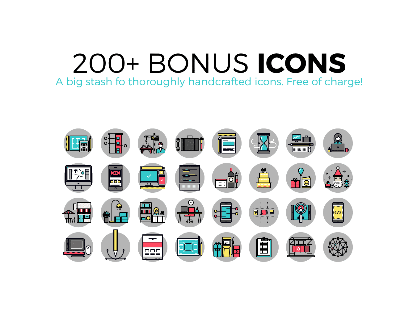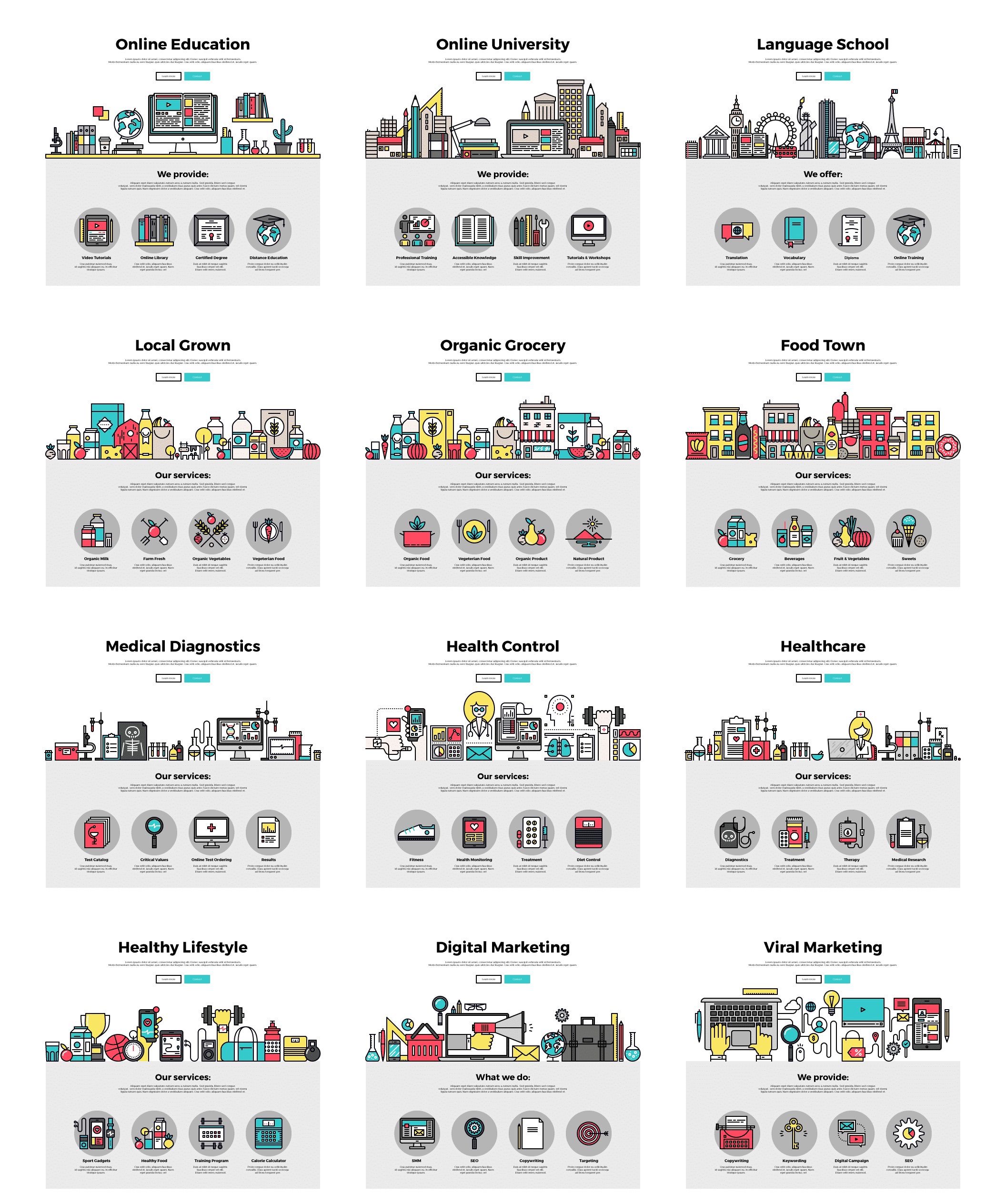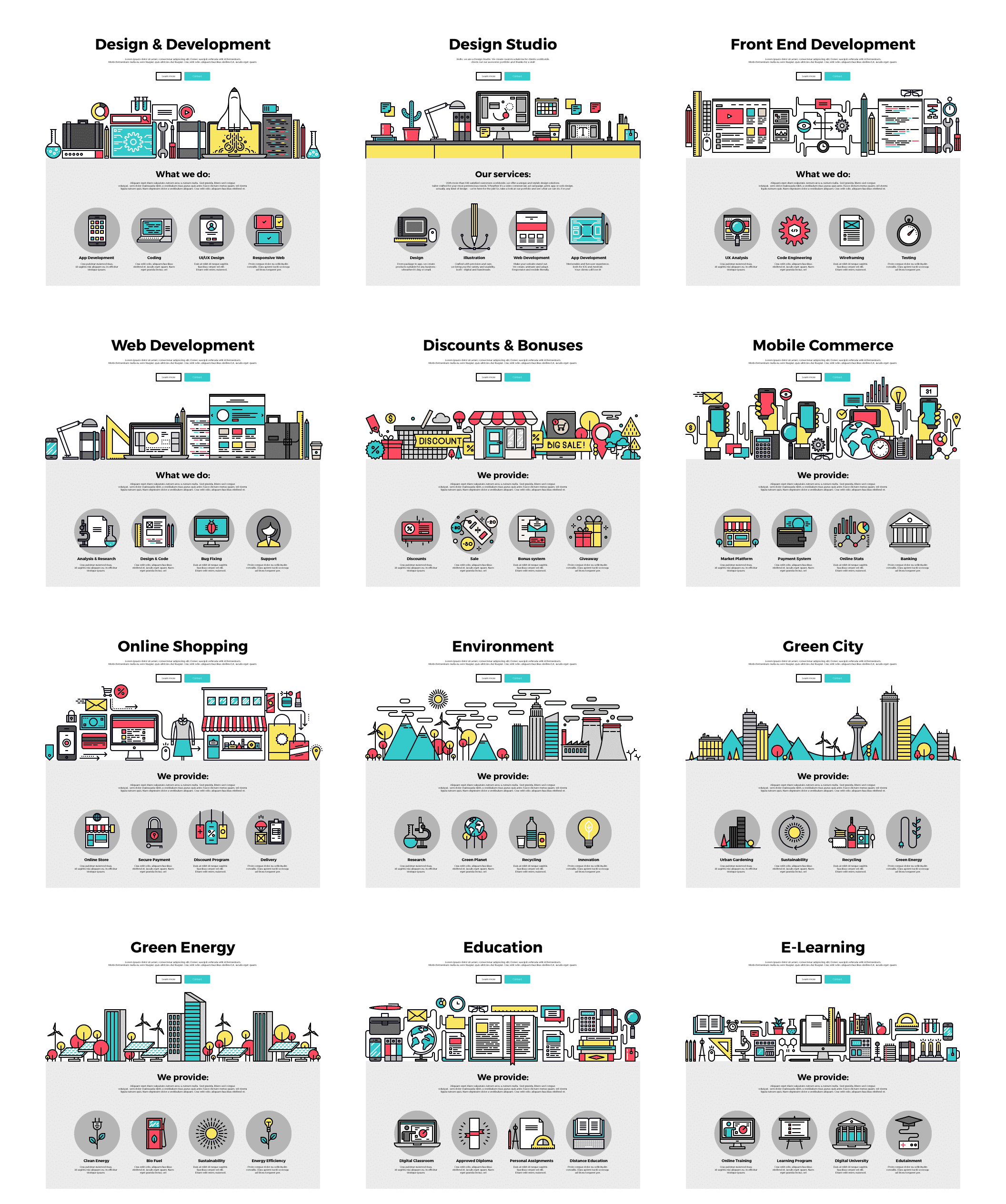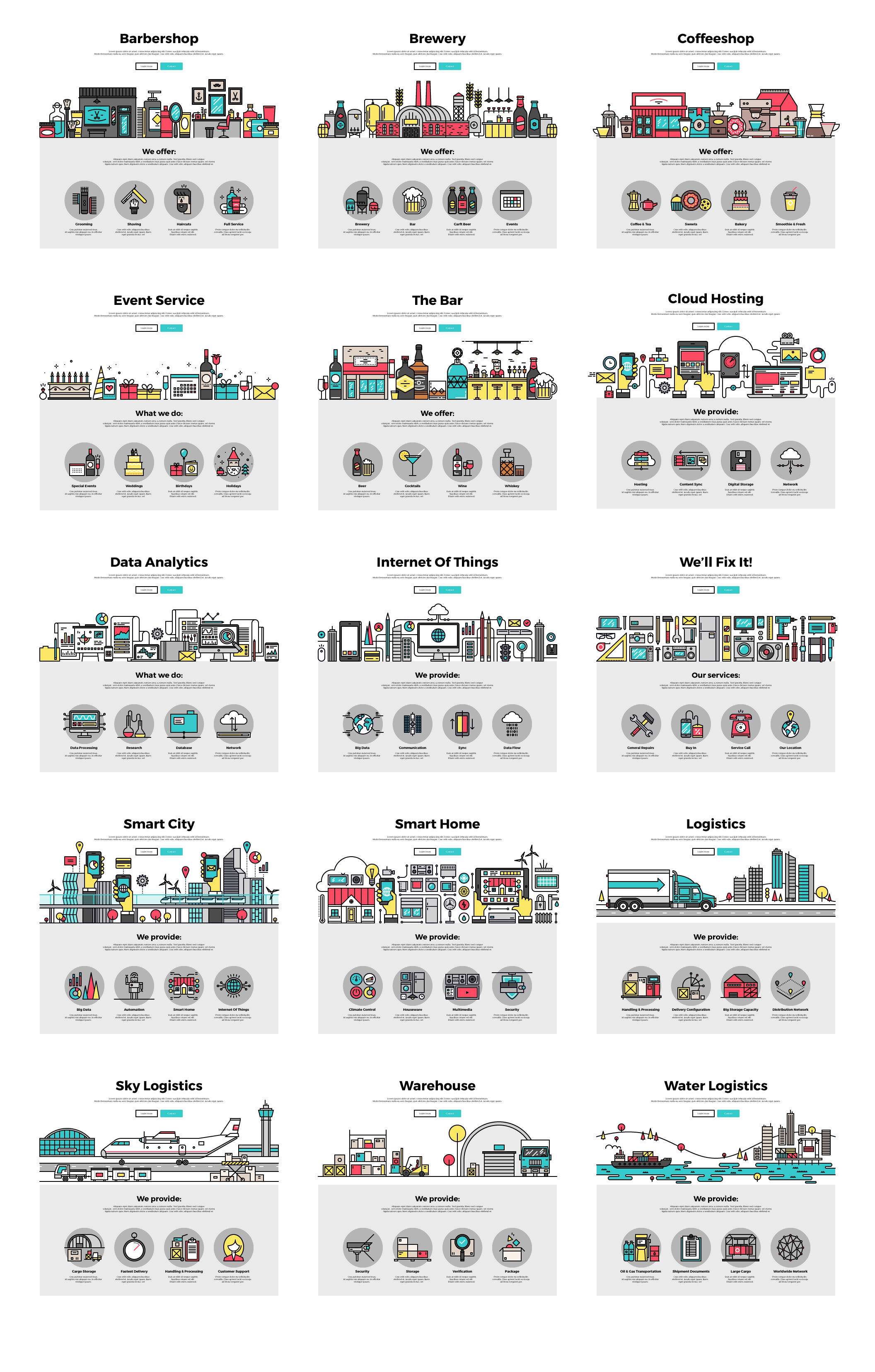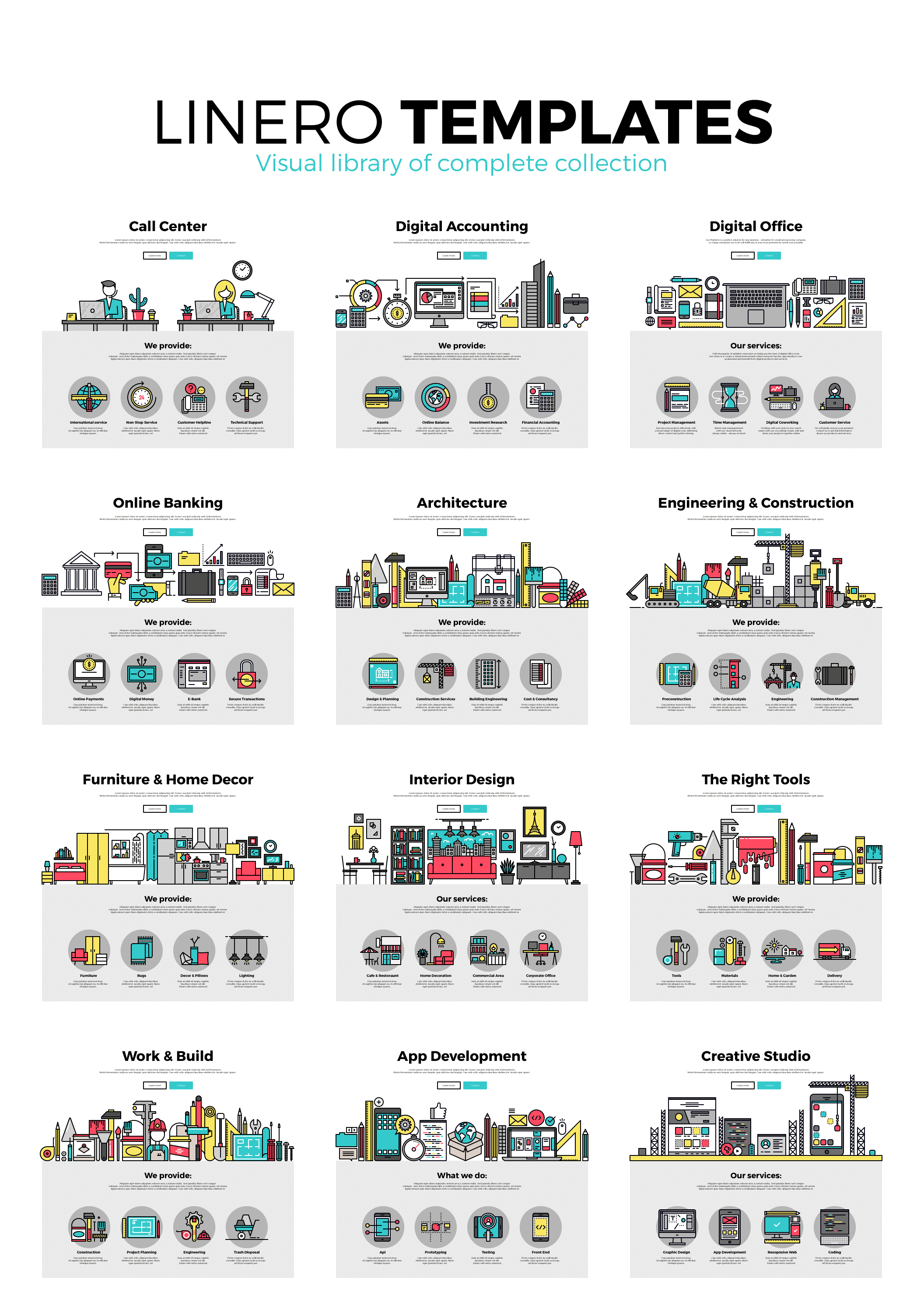 Linero系列包含50多种不同的基于主题的模板,采用预制的单页网站设计。每个模板都有一个横幅图和四个主题相关的概念图标。模板完美地结合在一起并相互补充,使其在许多创意活动领域都有用 - 从网页和应用程序设计到动画设计和打印。
