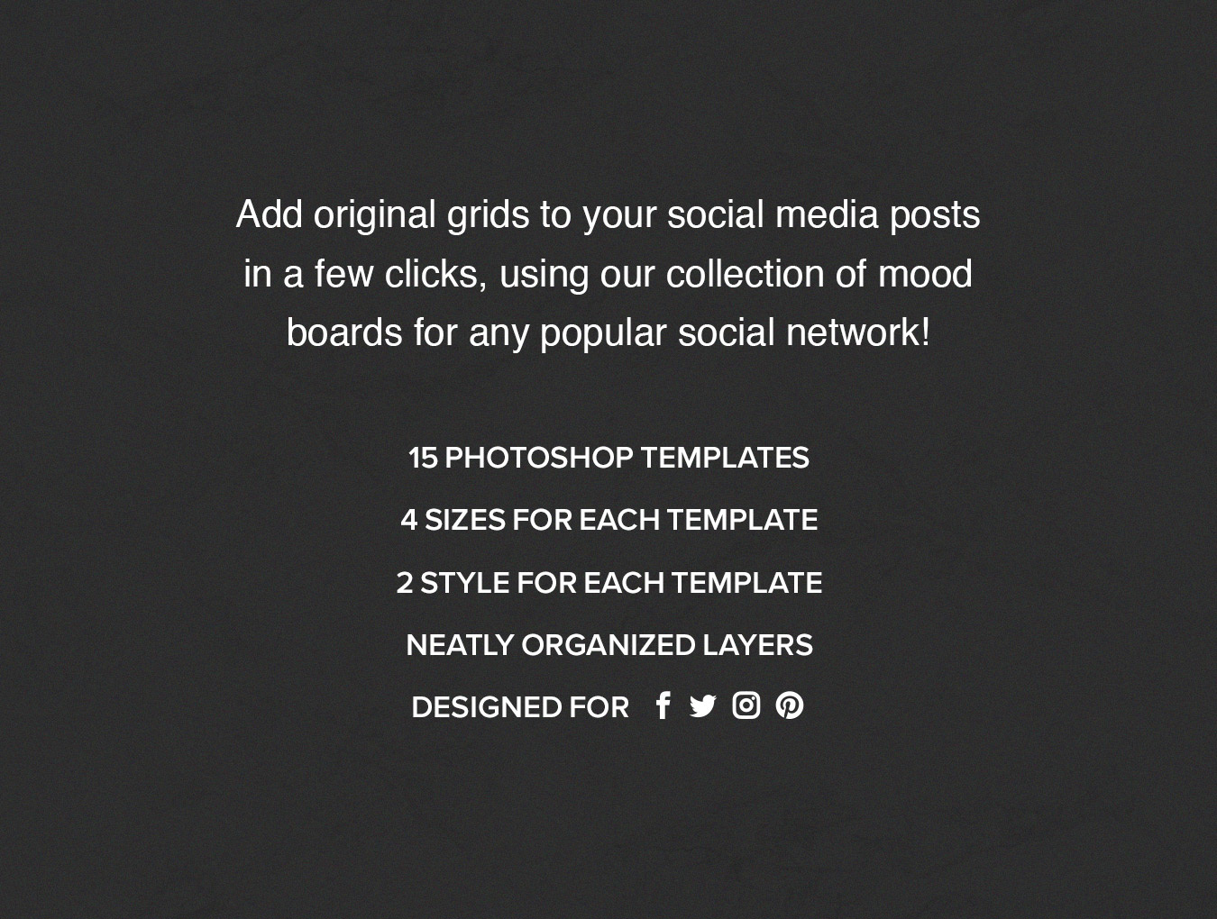 这是我们用于社交营销的Photoshop商品库的另一个补充!这一次,我们的团队发布了一些新内容,为最受欢迎的社交网络提供了全面的情绪板集合:Instagram,Facebook,Twitter和Pinterest。它将成为设计师,博主,建筑师,时装设计师和其他创意人员的完美工作和推广工具!使用我们系列中的即用型情绪板模板,与您的同事,客户和您的观众分享您的愿景!