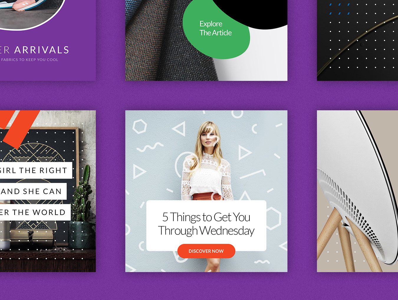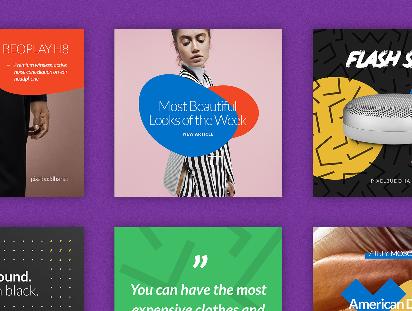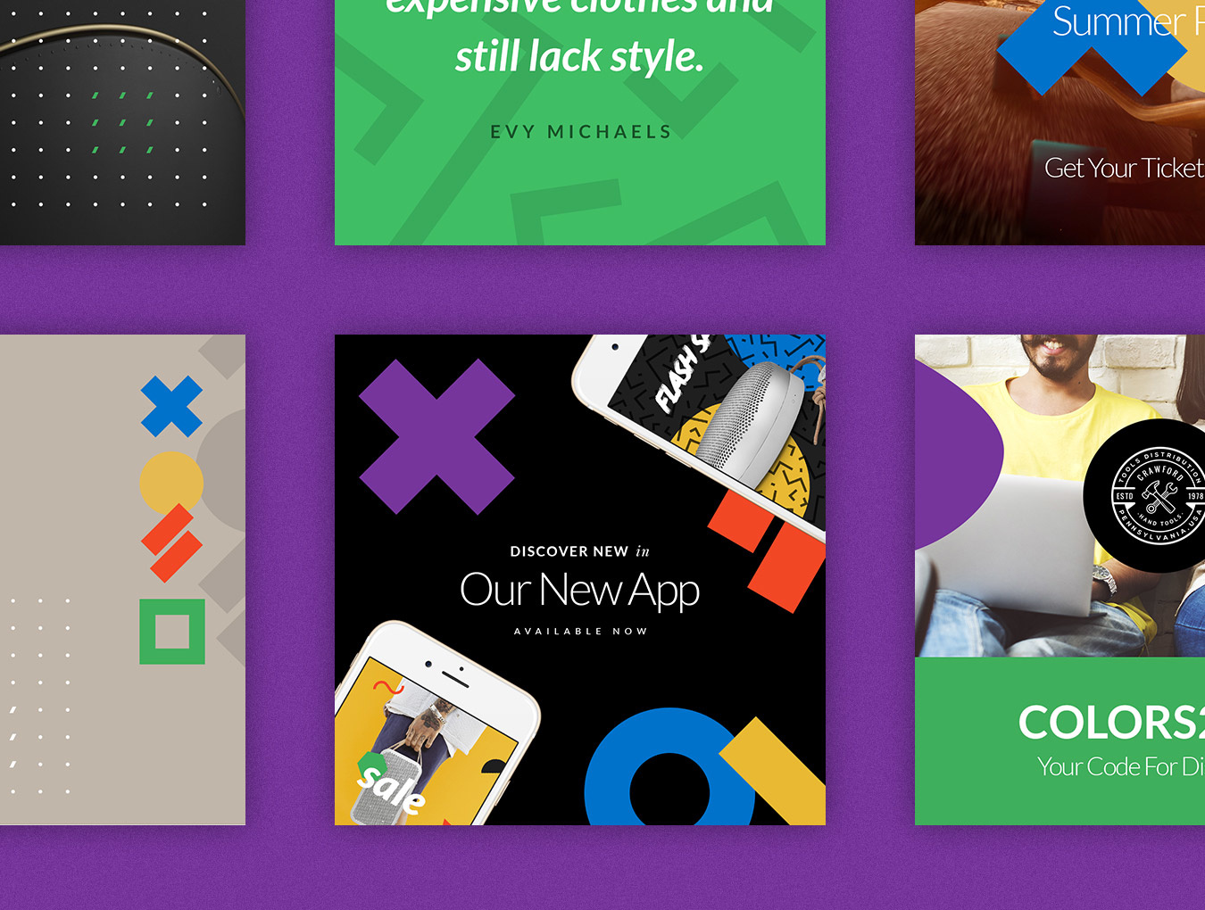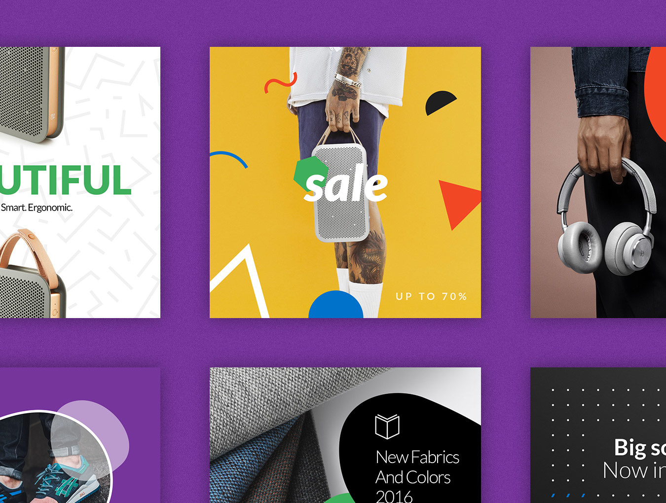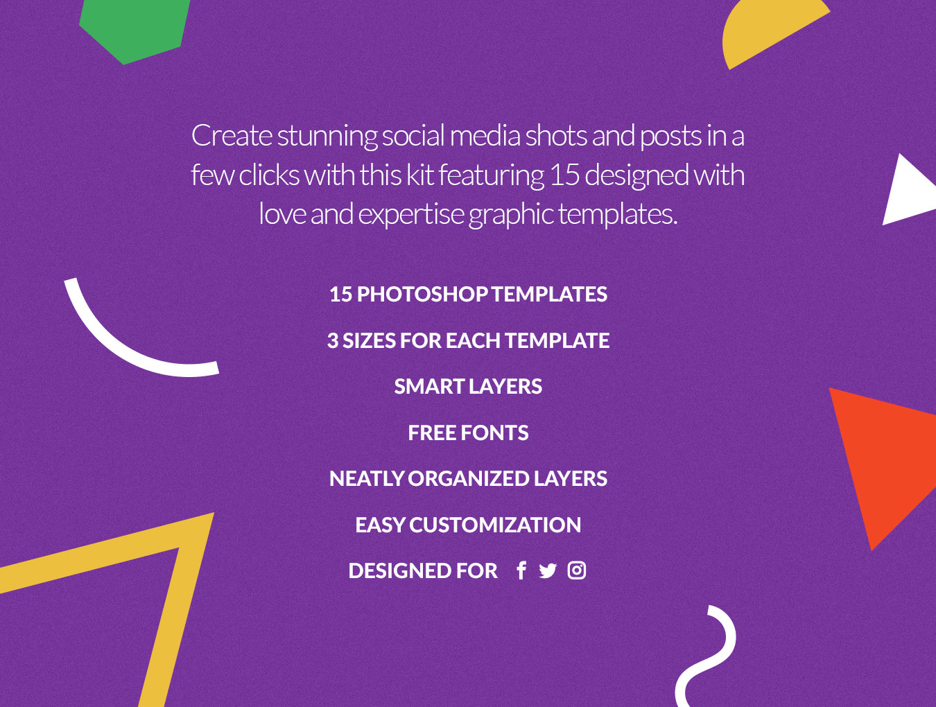 Social Media Booster Kit的第二卷完全专注于产品营销。其充满活力的模板具有美丽的几何形状,鲜艳的色彩和时尚的图案,旨在帮助您脱颖而出,以时尚的方式宣传您的工作和商品。 该软件包包括15个本地设计用于Instagram,Twitter和Facebook的模板。它们中的每一个都易于编辑和自定义,您只需通过智能对象将图像替换为您的作品并添加副本即可。而已!这套装置将满足您的个人或商业需求:适合博主,时尚和零售品牌,杂志等等!