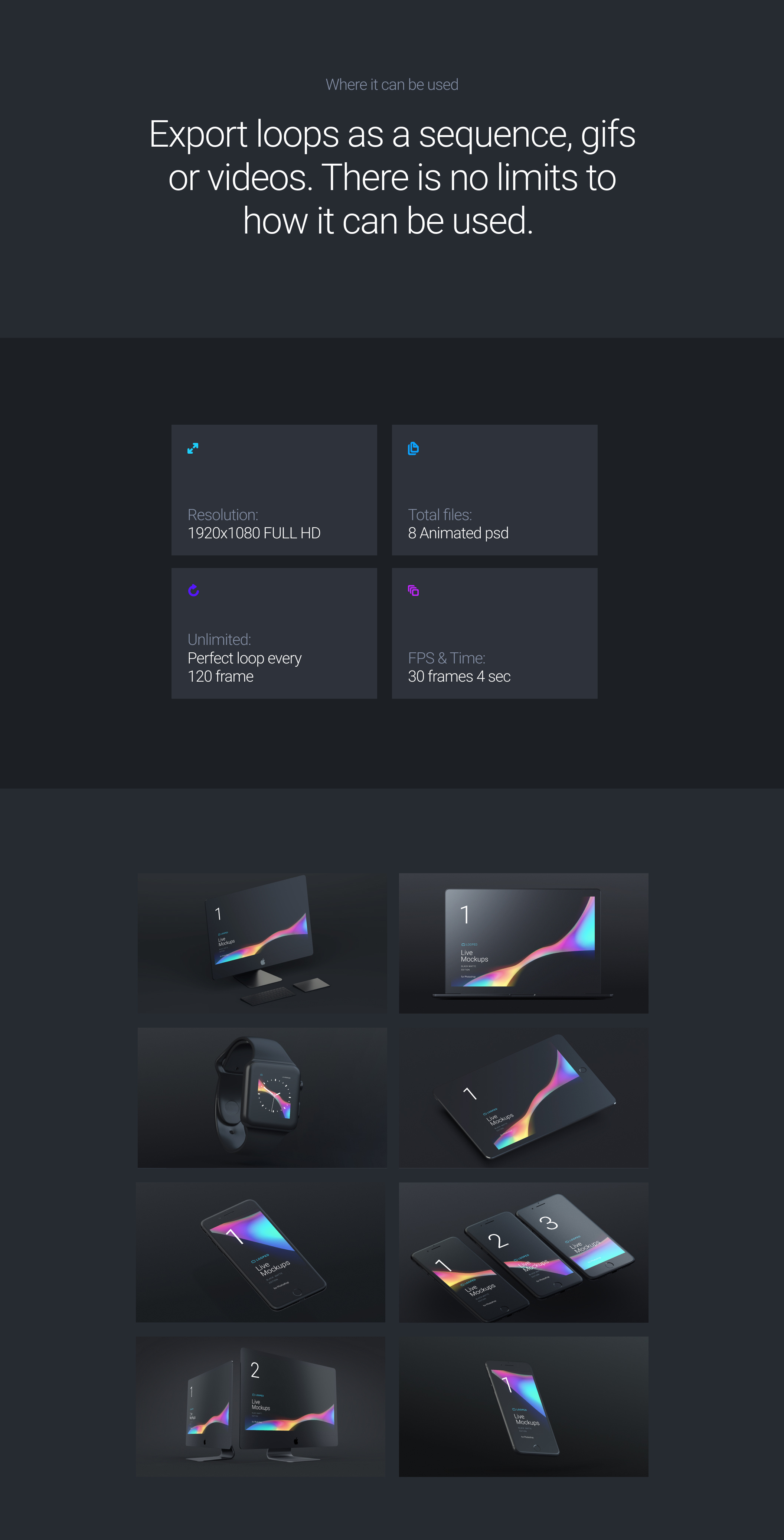 使用独特的实时模型为您的项目带来生命。使用大量流畅的动画和完美的循环来呈现您的下一个设计!循环动画样机包括8个动画PSD,包括iPhone,Macbook,iMac,iPad Pro和Apple Watch模型。兼容Photoshop CS6 Extended / CC +。