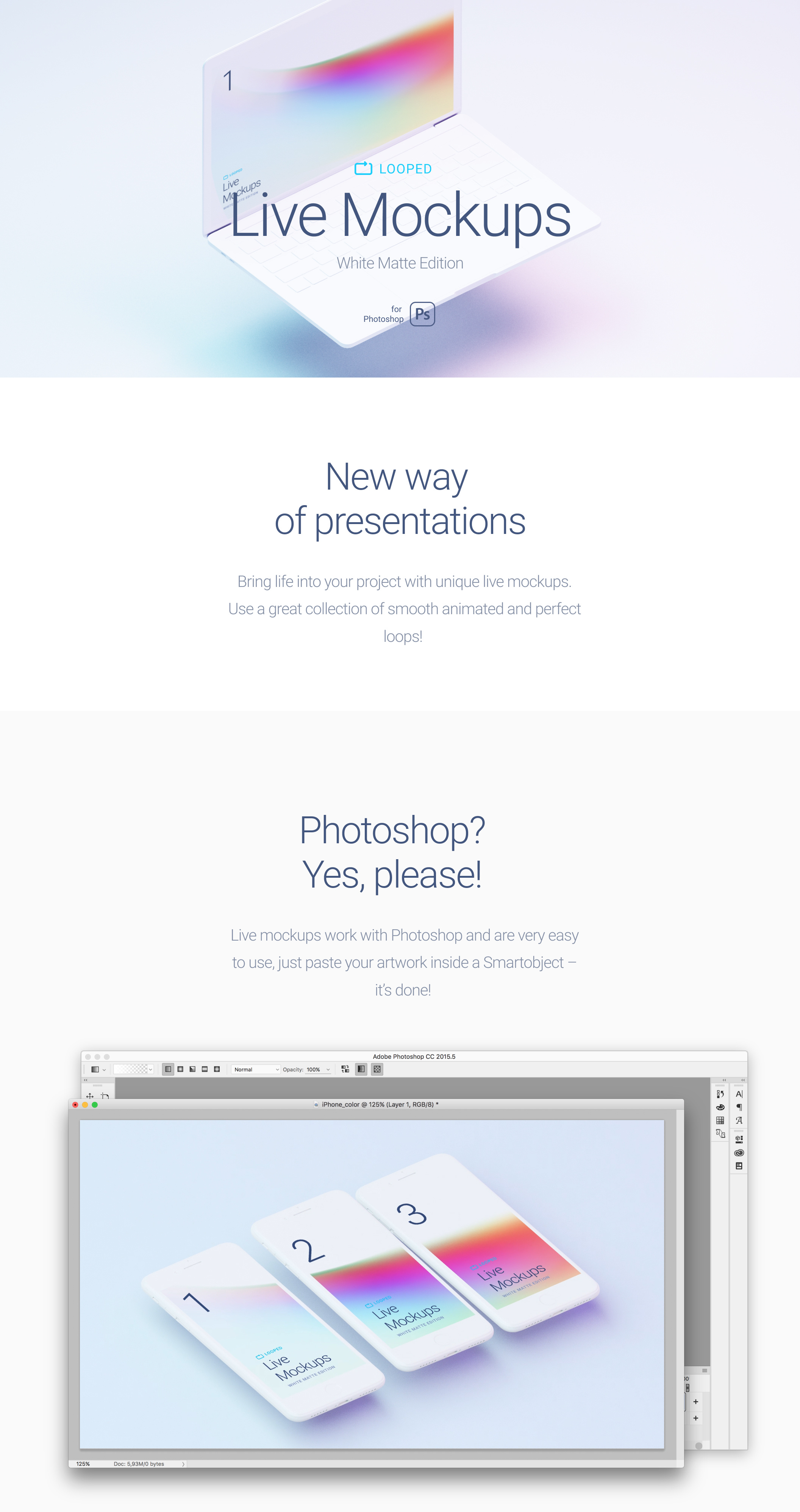 使用独特的实时模型为您的项目带来生命。使用大量流畅的动画和完美的循环来呈现您的下一个设计! 循环动画样机包括8个动画PSD,包括iPhone,Macbook,iMac,iPad Pro和Apple Watch模型。兼容Photoshop CS6 Extended / CC +。