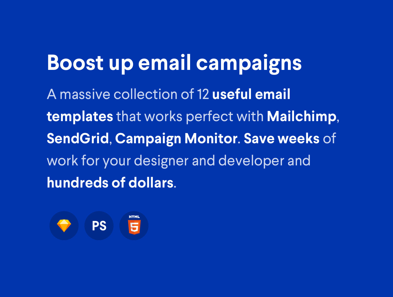 12电子邮件模板在每个设备的每个收件箱中保证看起来都很棒。与MailChimp,Campaign Monitor,SendGrid和其他主要电子邮件营销平台兼容。你可以在这里找到电子邮件,如放弃购物车,个人电子邮件,通讯,调查,谢谢你的电子邮件等。与你的订阅者联系,并使用这些美丽,高品质和完全响应的电子邮件模板进行更多的销售。设计简单,干净,专业。模板与Sketch和Photoshop兼容,还包括每个模板的干净HTML。