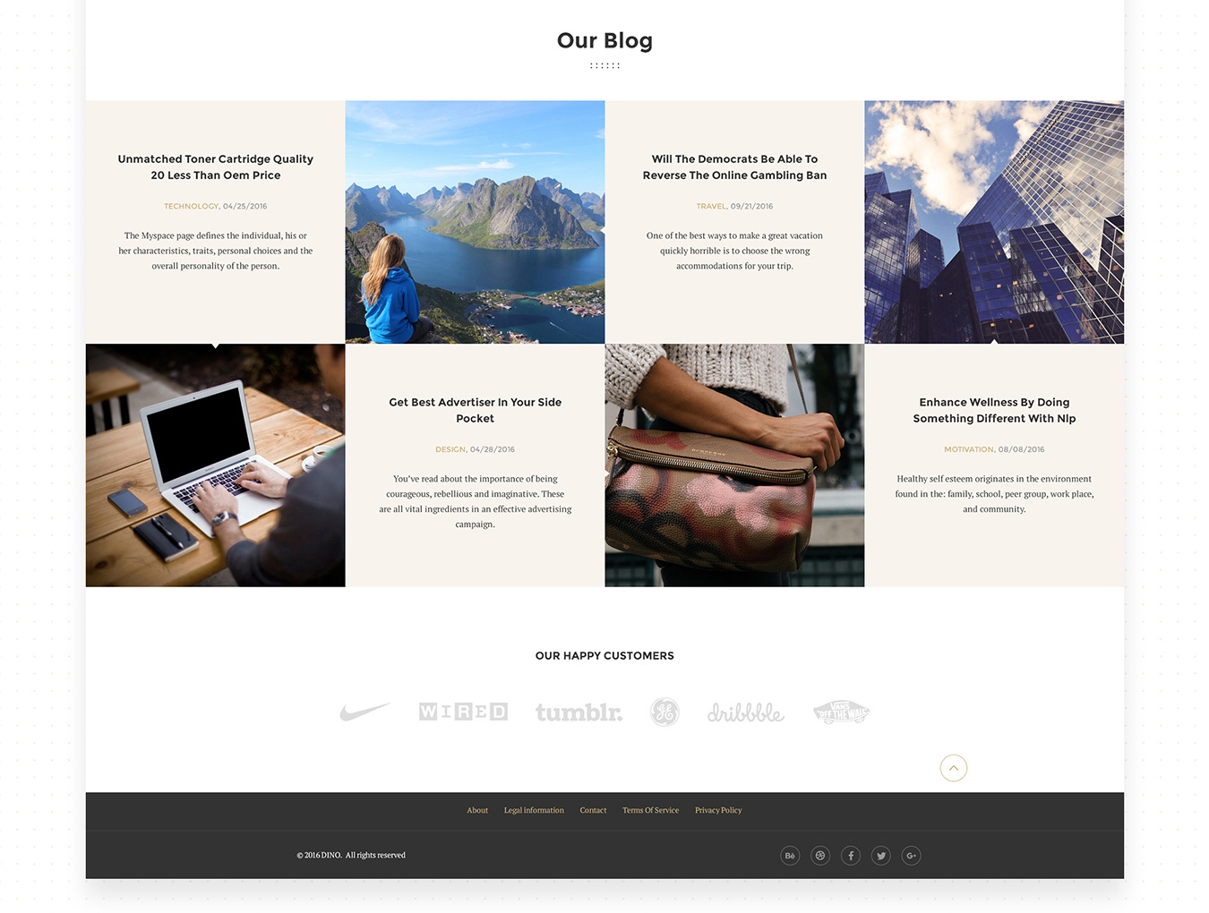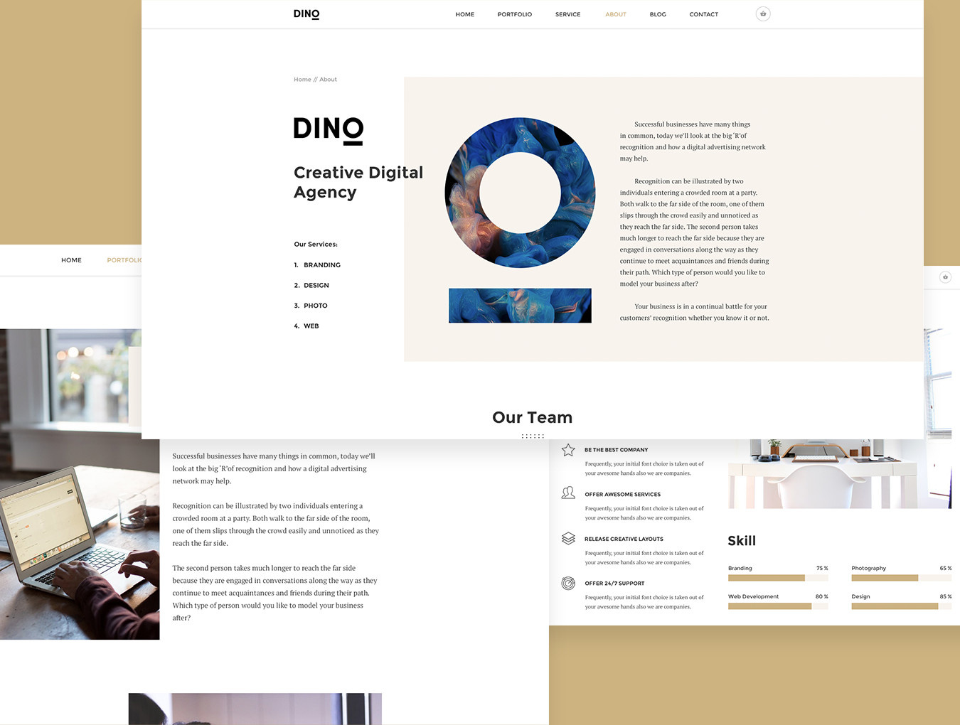 DINO Creative Agency Portfolio Template是贵公司专业且极具吸引力的投资组合模板。它是一个响应式模板,具有可模塑的导航和布局,可让您控制焦点。它乍一看提供任何信息,服务,产品目录的磁性。所有模板的设计都适合从事设计,摄影或网页开发的创意机构。有了40个PSD模板,我们相信您的下一个项目是完美的!